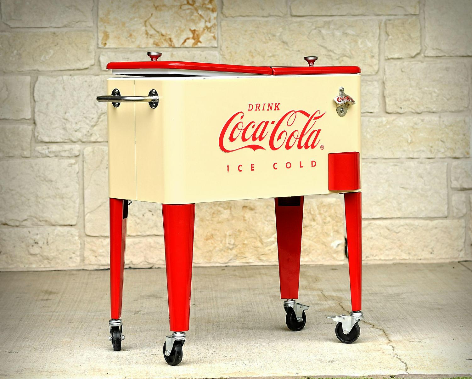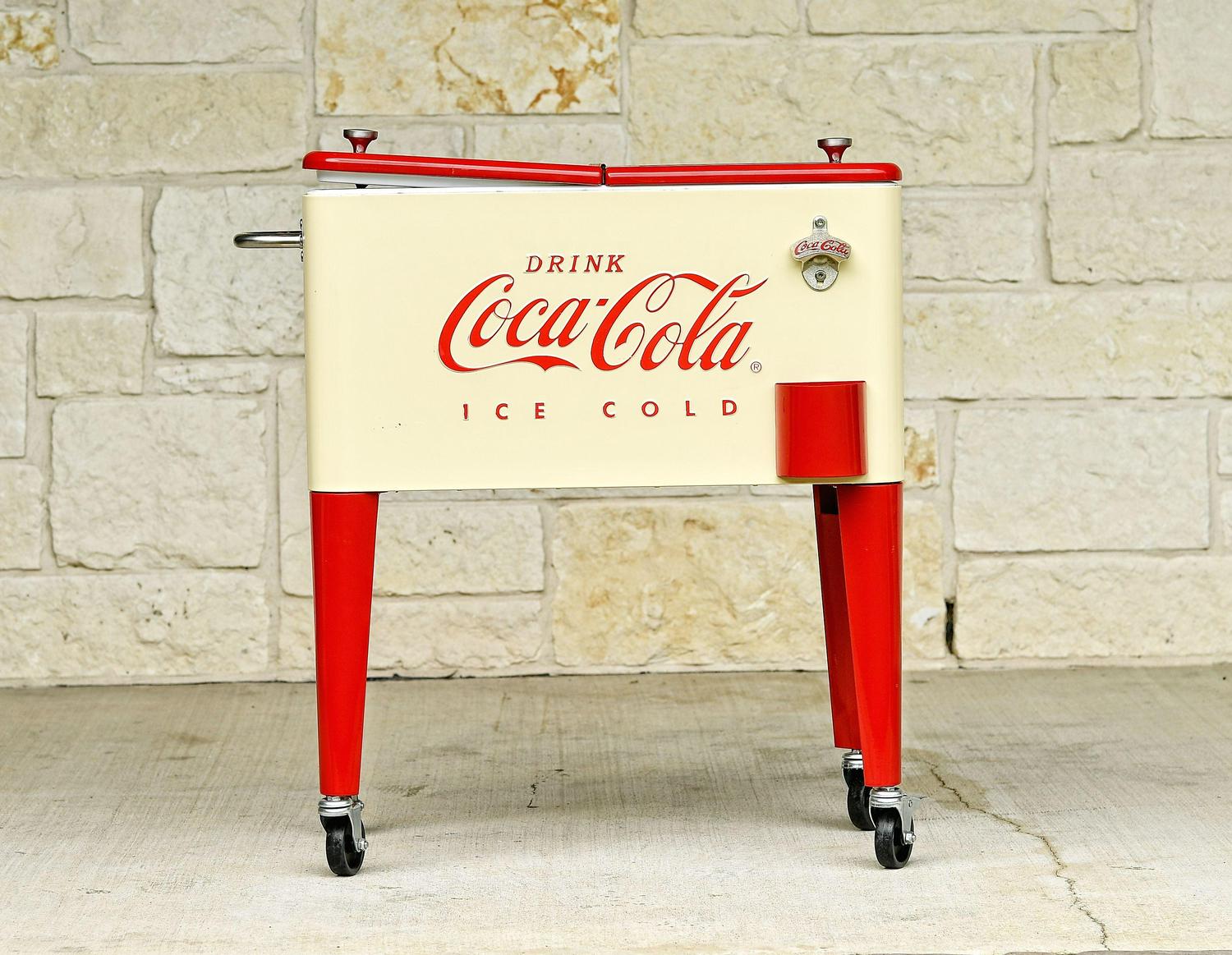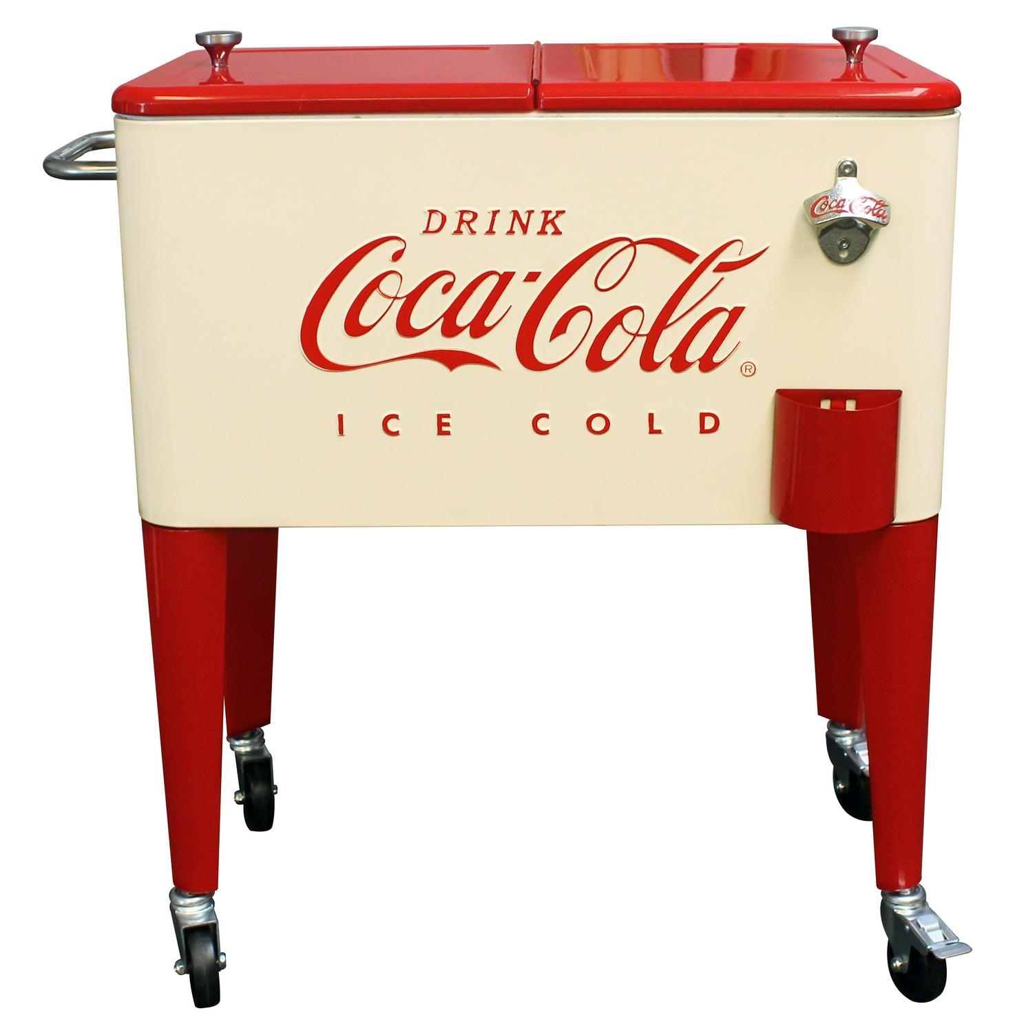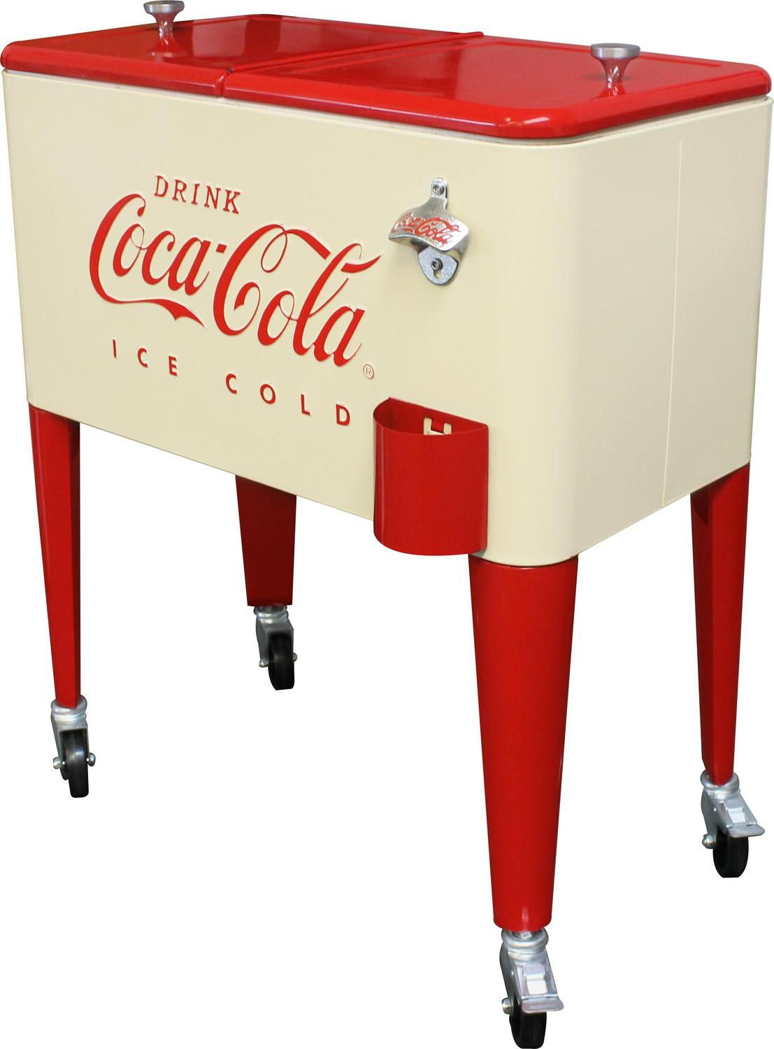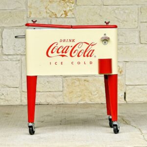 Get the party rolling with our Leigh Country CP 98111 Cream and Red 60 Qt. Coca-Cola Metal Outdoor Patio Cooler! This officially licensed Coca-Cola cooler is a decorative solution for storing the drinks you plan to serve for your festivities. The removable double lid allows you to fill the insulated poly liner with ice and beverages when the party calls for a round. Additionally, the interior compartment of this 60 qt. cooler has ample volume, and holds up to 72 12-ounce cans. Featuring a design inspired by the iconic Coca-Cola logo, this whimsical icebox is a union of classic charm and modern-day function. If you are serving brews in old-fashioned bottles, it comes with a built-in bottle opener and cap catcher. For an added touch of convenience, the steel bar offers a place for you to hang a towel. This retro cooler has four casters for easy transport, and two of them can lock so the cooler stays in place when unattended. You can easily drain the melted ice after the party’s over by pulling out the included plug. The cooler is lightweight and easy to roll at 26.4 pounds.