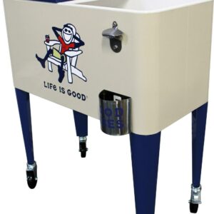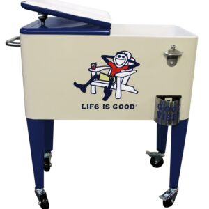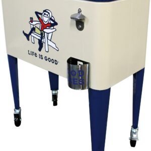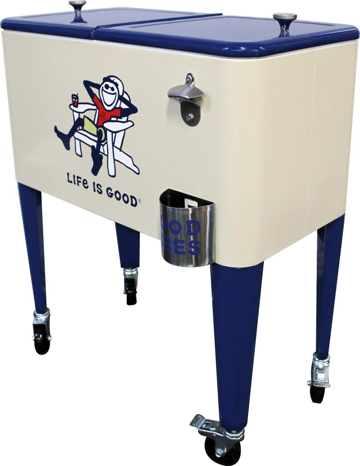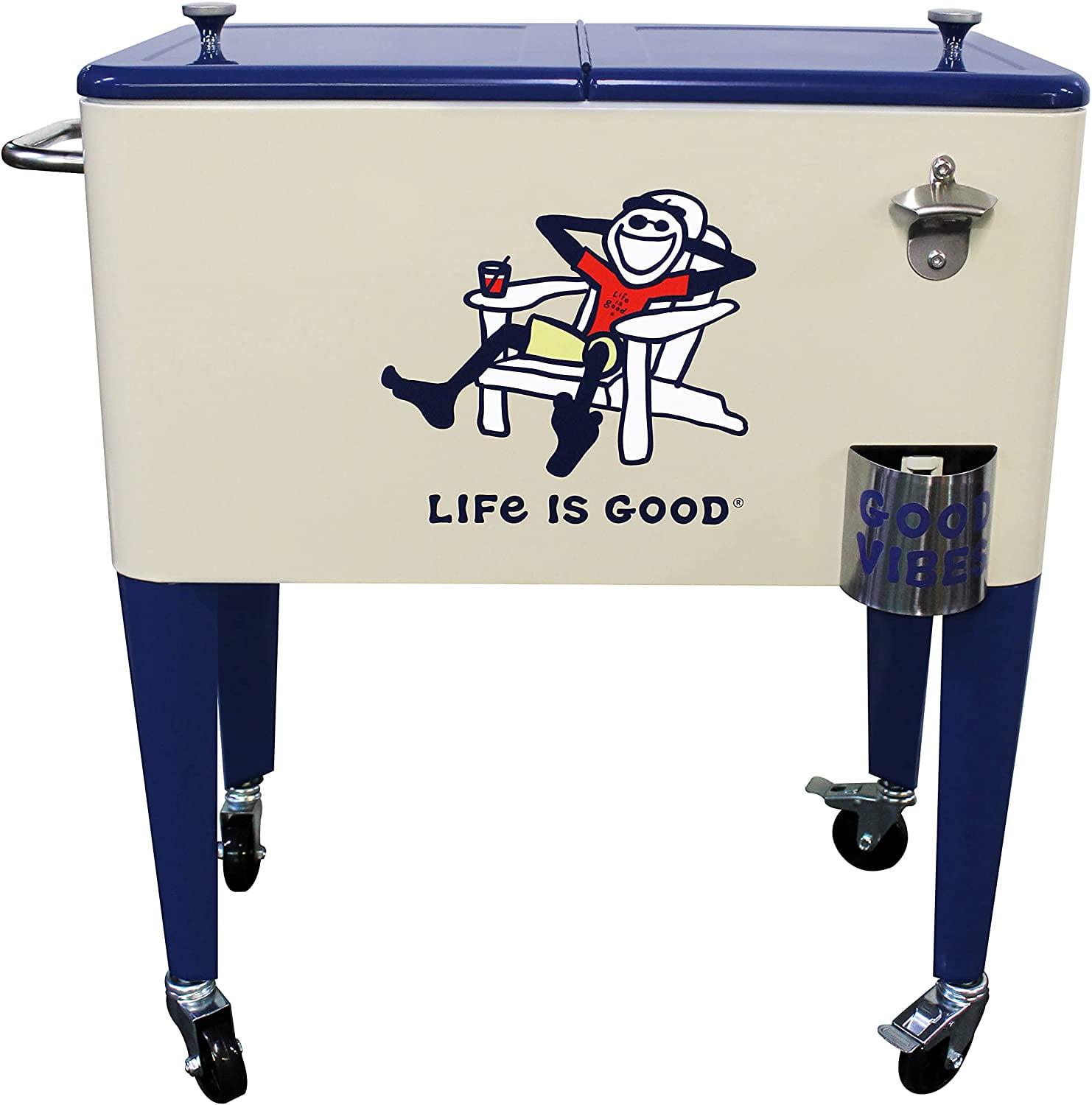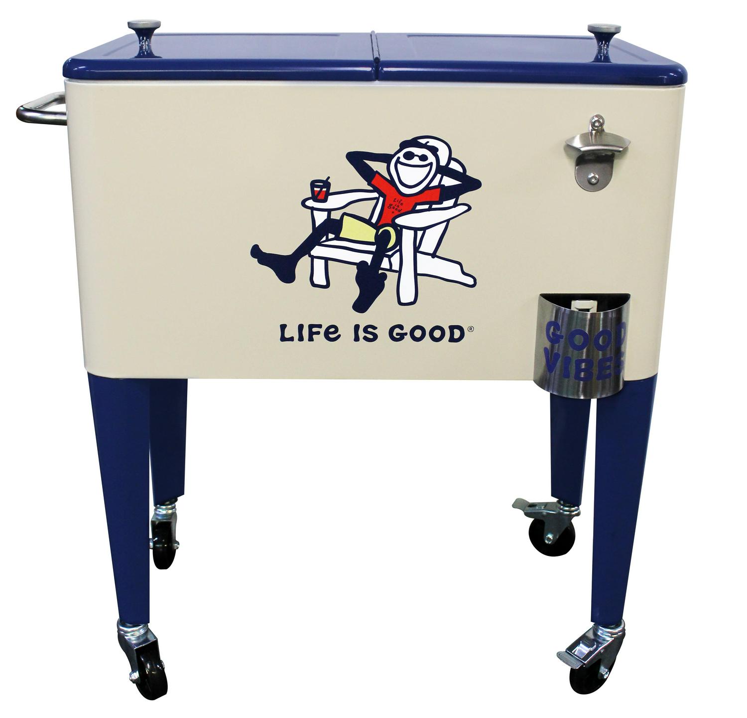 Let the good times roll with our Leigh Country “Life is Good 60 Quart Metal Outdoor Patio cooler in beige Adirondack Jake. Perfect for storing and serving drinks and good vibes at your next party. The removable double lid and insulated liner allows for up to 70 cans or bottles. Attached is a convenient bottle opener, lid catcher and side handle for towels and maneuvering for easy entertaining. Official Life is Good Vintage licensed product. spreading good vibes since 94.
