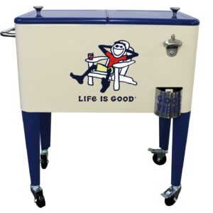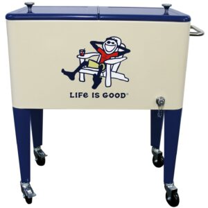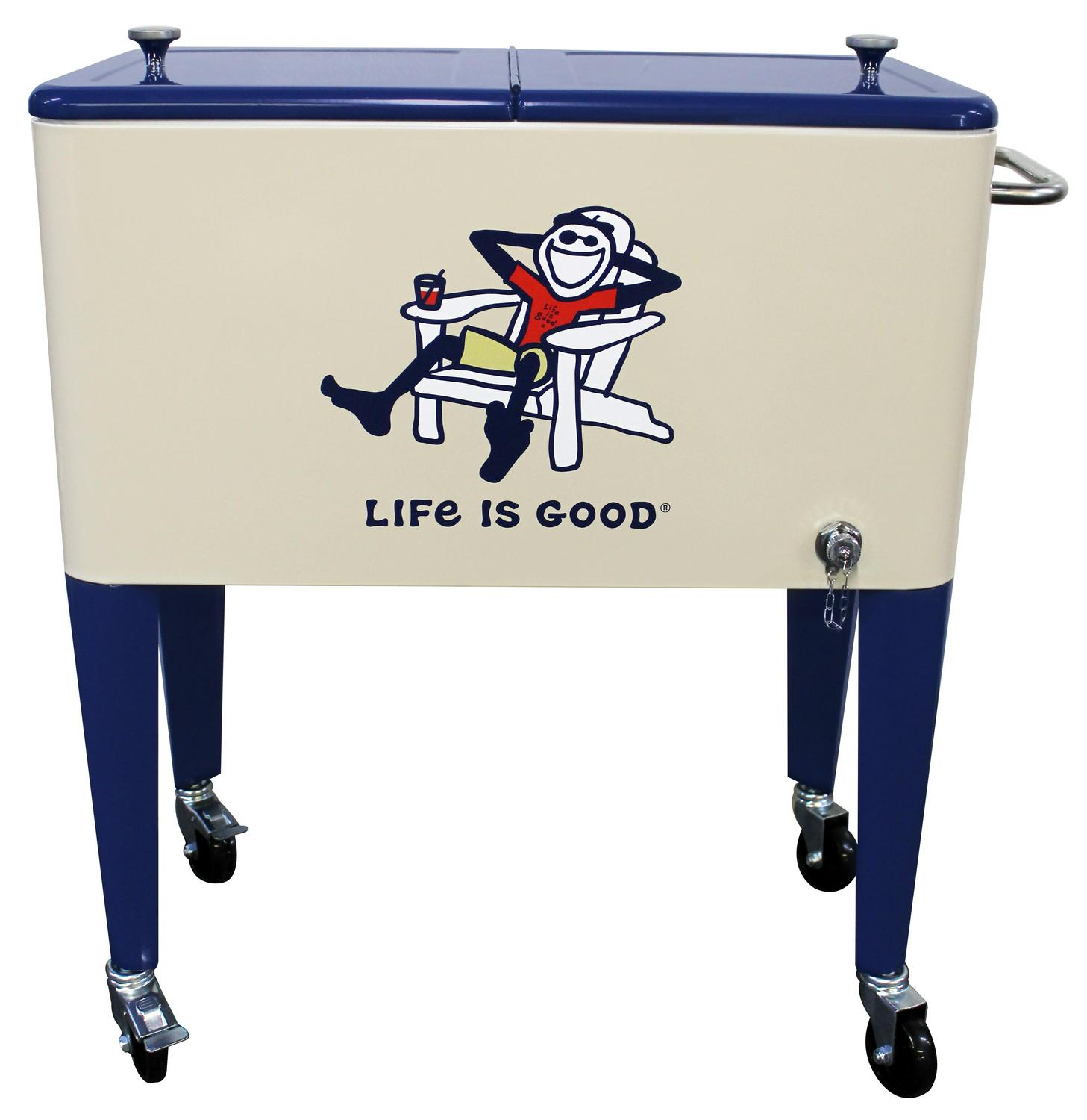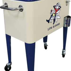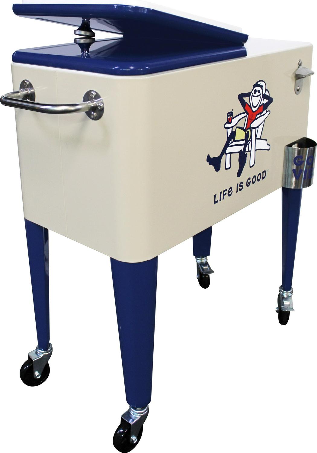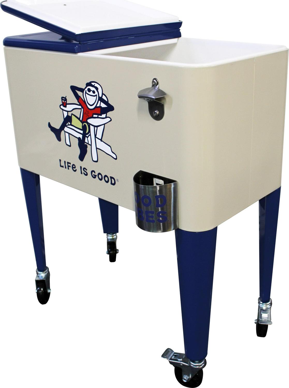 Let the good times roll with our Leigh Country “Life is Good 60 Quart Metal Outdoor Patio cooler in beige Adirondack Jake. Perfect for storing and serving drinks and good vibes at your next party. The removable double lid and insulated liner allows for up to 70 cans or bottles. Attached is a convenient bottle opener, lid catcher and side handle for towels and maneuvering for easy entertaining. Official Life is Good Vintage licensed product. spreading good vibes since 94.