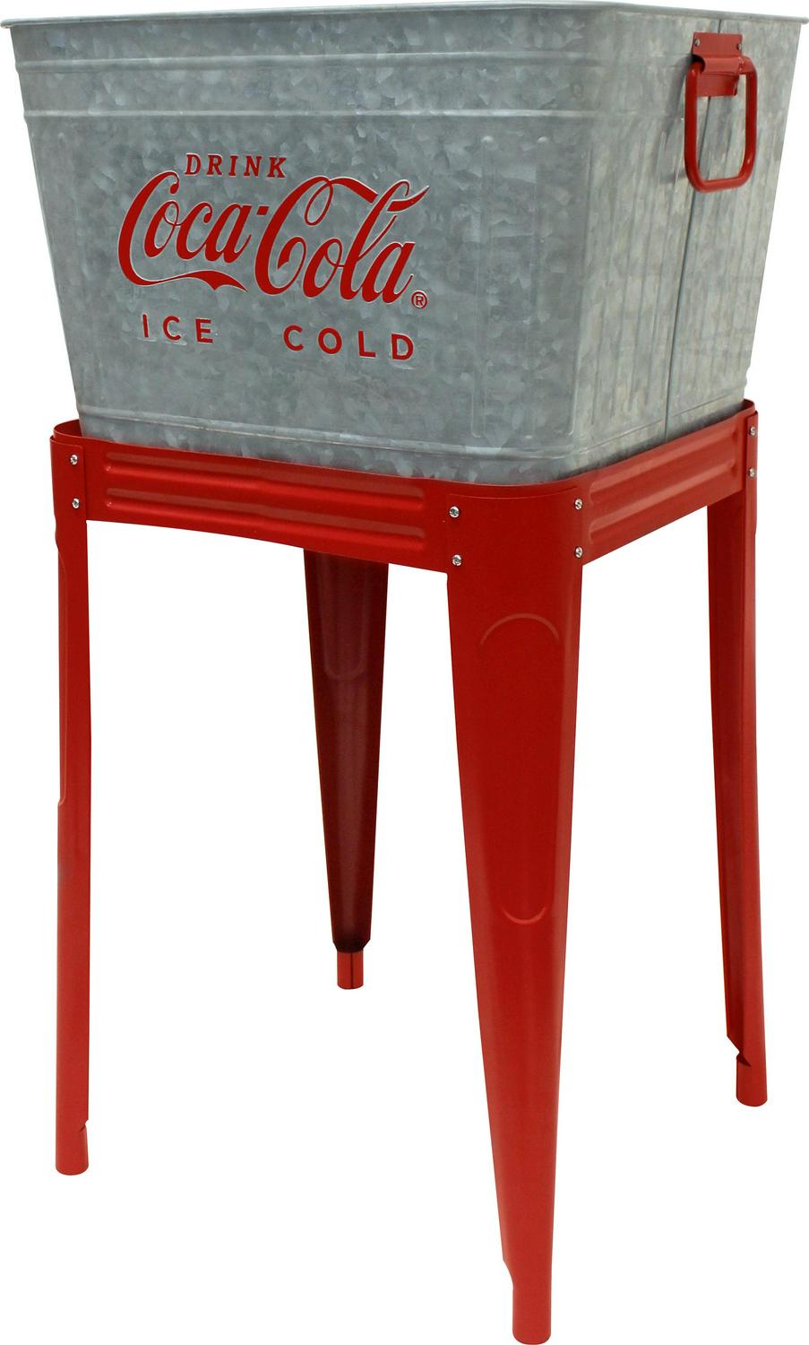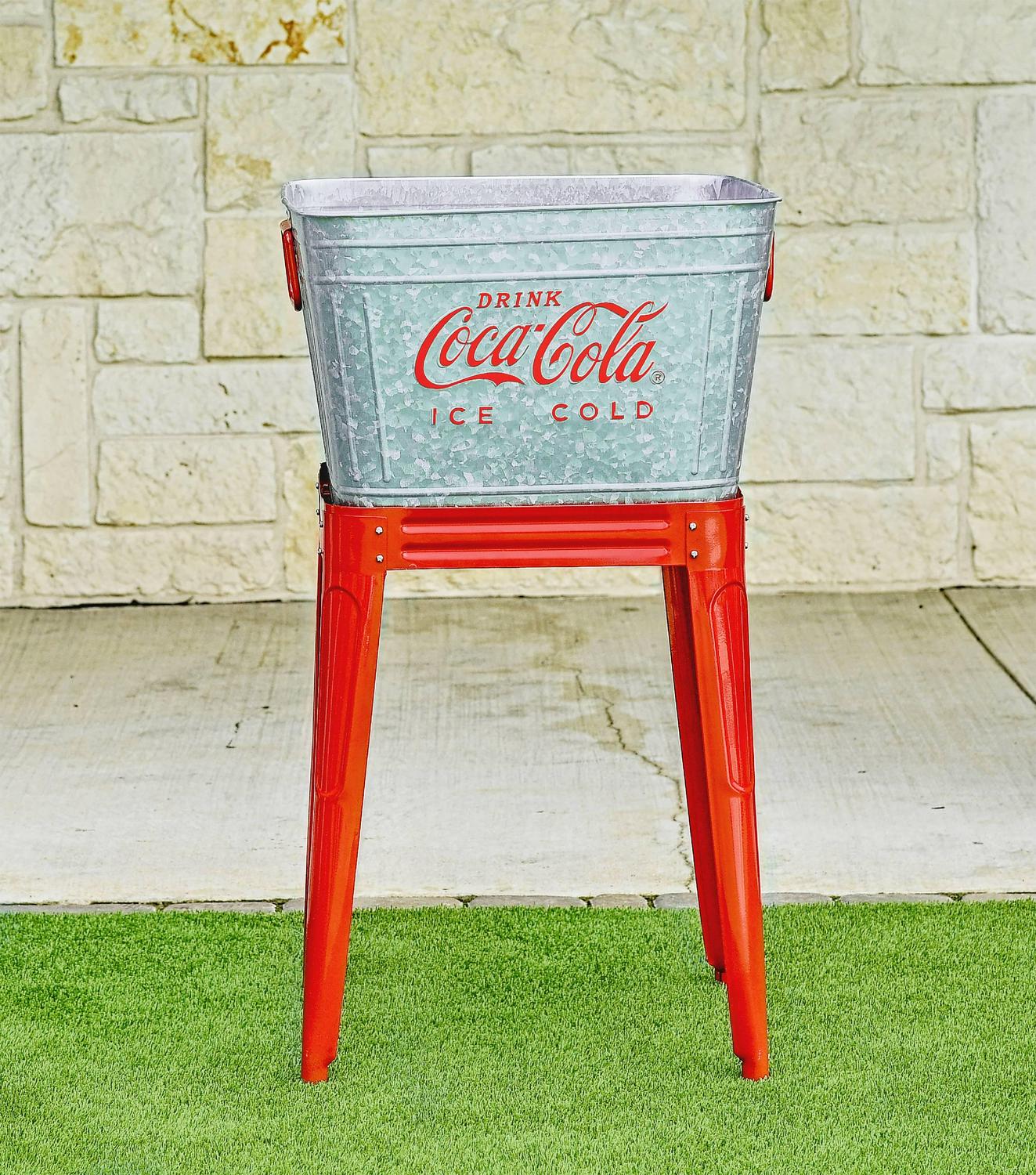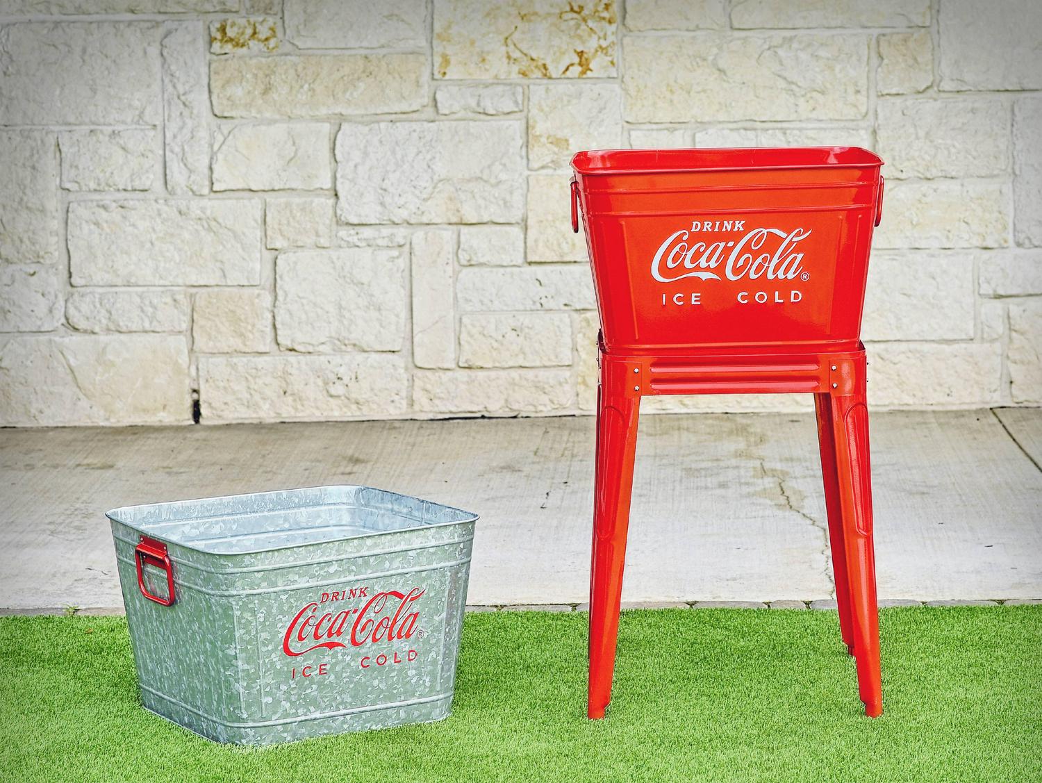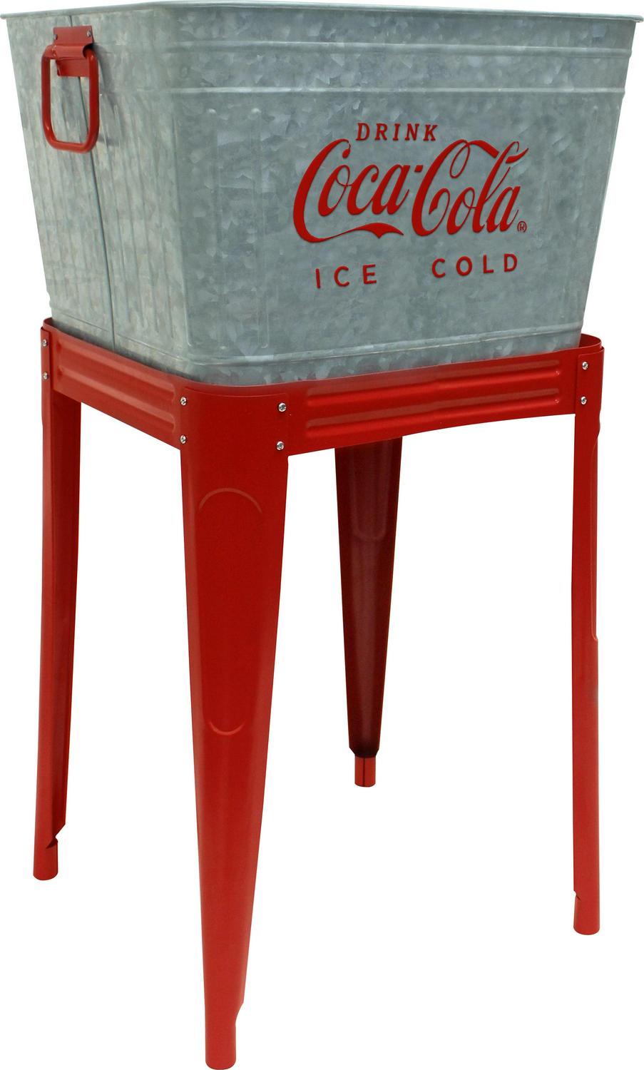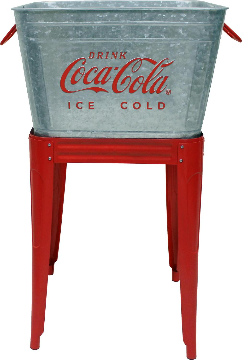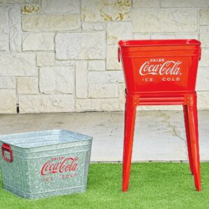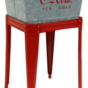 Add some nostalgia to your porch or patio with our Leigh Country CP 98090 Galvanized Steel 42 Qt. Coca-Cola Wash Tub With Red Stand. This officially licensed Coca-Cola piece is inspired by vintage wash tubs, now re-modeled as a decorative solution for storing ice cold Coke. The tub can be removed from the stand for easy refilling. When the party s over, drain any melted ice with ease by pulling out the included plug.