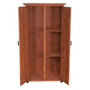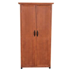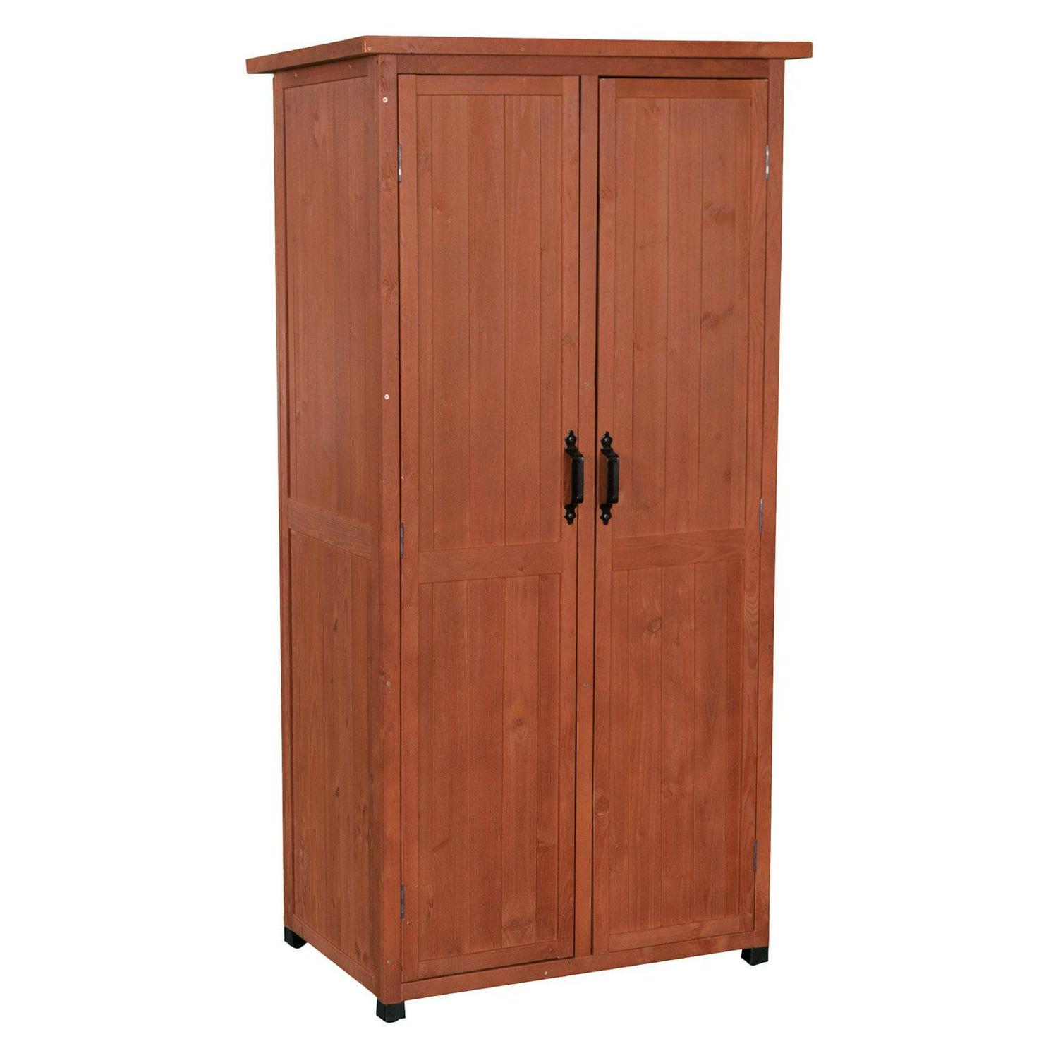 Homeless stuff Lock it down and tidy up with the Leisure Season Vertical Storage Shed. With a small footprint, this tall, spacious shed keeps your outdoor gear handy and out of sight, from pool accessories to sports gear; tools to lawn and garden supplies. This shed features tongue and groove construction. It’s made of solid fir, which like cedar, is a member of the notably rugged cypress family. Double panels allow for easy access, and the doors are made to accommodate padlocks. Treated with a brown stain and a protective coating for optimum all-season durability. Assembly is straightforward and painless.