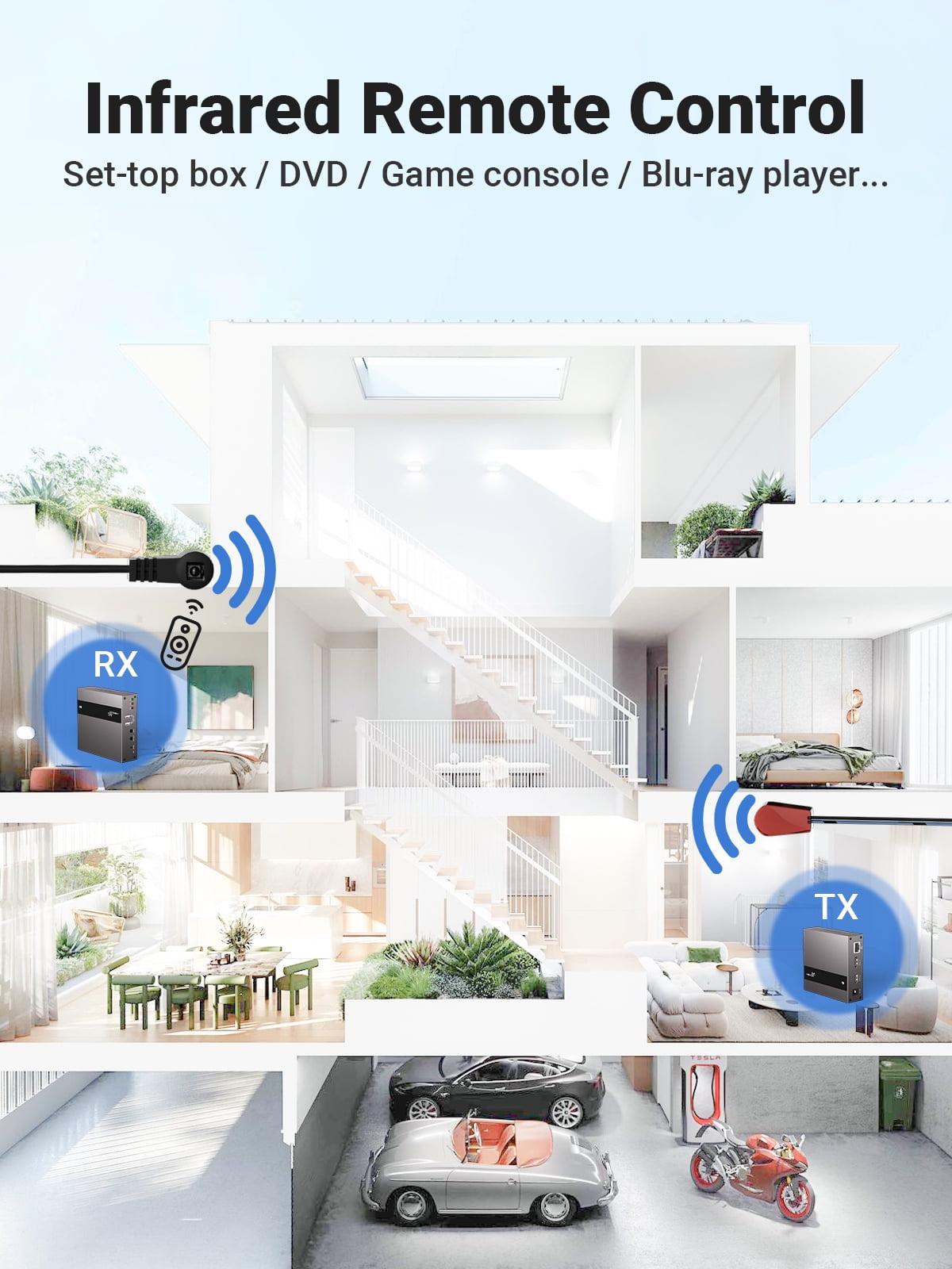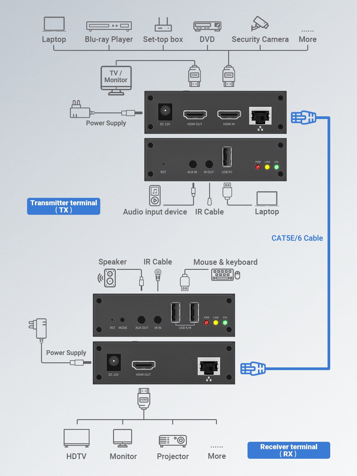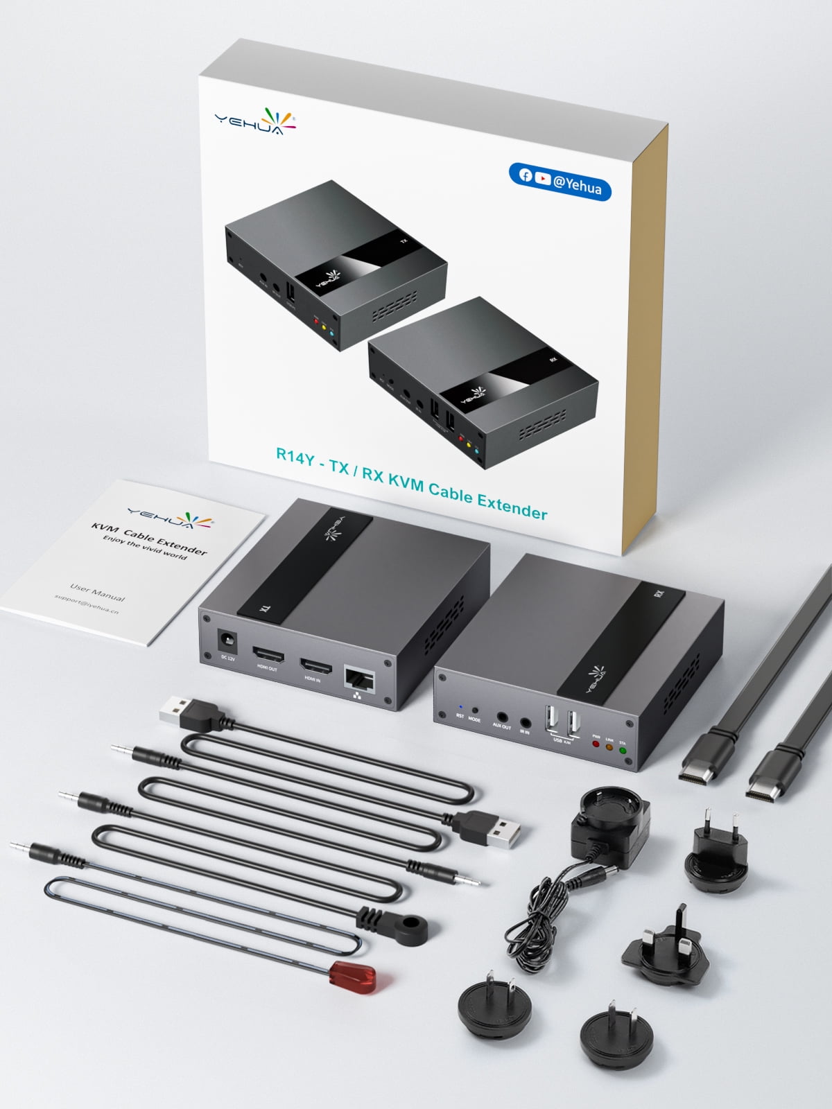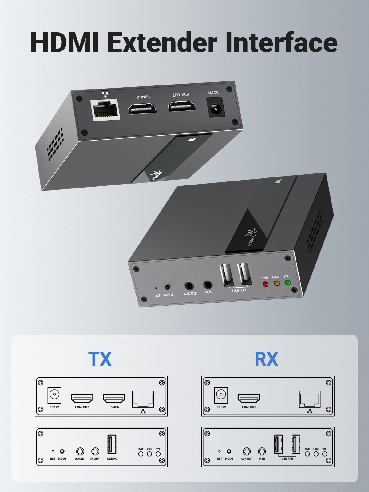 Transmitter End: Material : ABS Interface Introduction: 1 * HDMI,1*DC,1*IR,1*RJ45,1 * TYPE-C,1*Audio Color: black Chip: AM8270 Power supply: 12V 1A Resolution: 1080P 60HZ Memory : 1Gbit Transmission distance: 250M Receiver End: Material: aluminum alloy Interface Introduction: 1 * HDMI,1*DC,1*IR,1*RJ45,2 *USB C,1*Audio Color Space: Grey Chip: AM8272 Power supply: 12V 1A Memory: 1Gbit Resolution Max: 1080P 60HZ Memory: 1Gbit Package included: 1 * transmitter, 1 * receiver, 1 * manual, 2 * HDMI cable (25cm), 2 * power adapters, 1 * audio cable, 1* infrared transmitter cable,1* infrared receiver cable