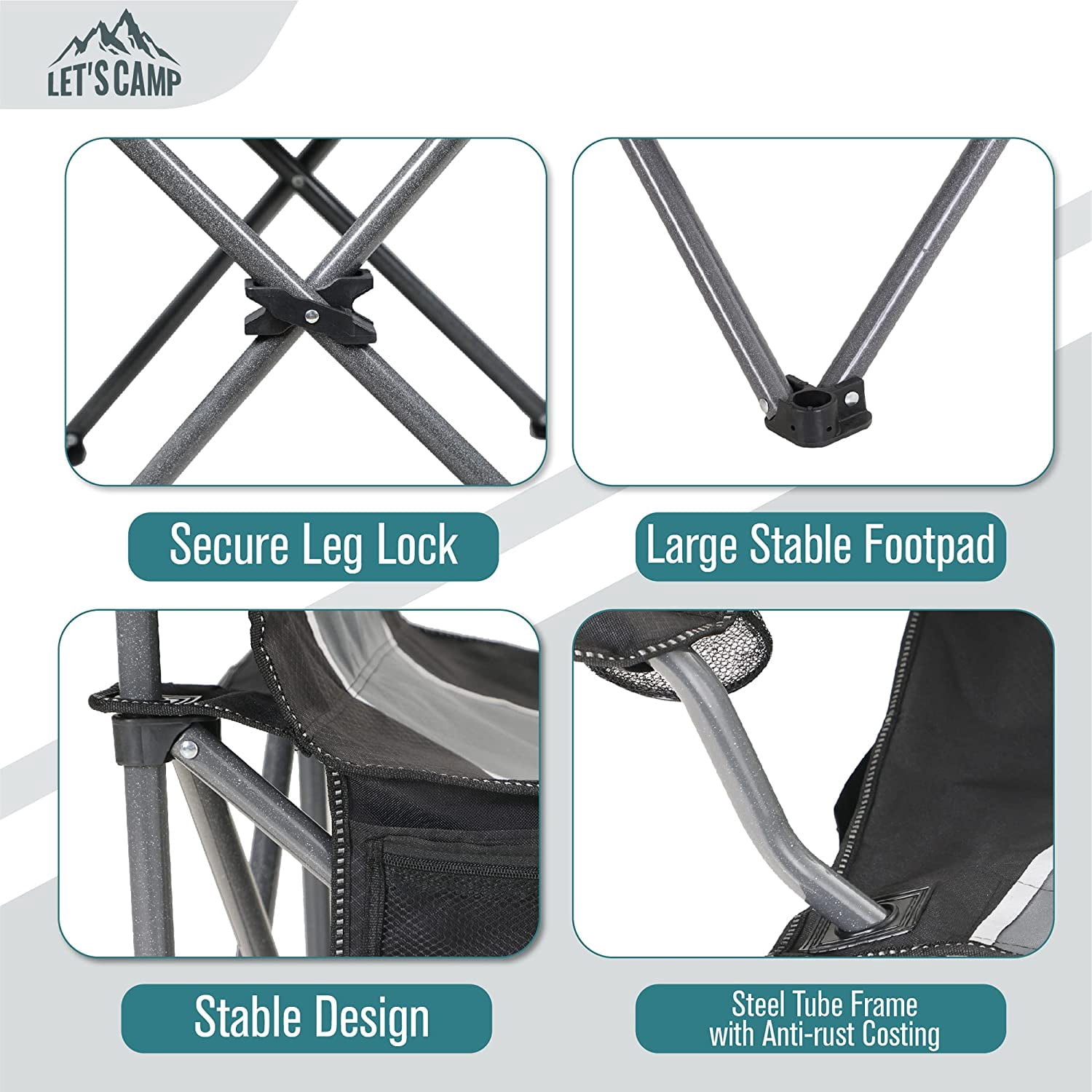 Product Description LET’S CAMP Oversized Heavy Duty Outdoor Camping Folding Chair, Your Perfect Option! Are you looking for a modern comfortable camping chair for outdoor? LET’S CAMP Camping Chair will make you feel comfortable, keeping you develop a correct posture, have a health body Features: Cup Holder & Side Media Pocket: Built into the armrest, the cup holder ensures that a refreshing drink is always within easy reach. A handy side pocket keeps phones, snacks, or keys at your fingertips. Back Storage Bag: You can easily storage your books or magazines at any time. Strong Steel Frame: A sturdy steel frame ensures you’ll have a great seat, season after relaxing season. Cushioned Comfort: Fully cushioned seat and back for added support and enhanced comfort. Specifications: Open Size: 36.22″ L x 23.62″ W x 43.3″H Folded Size: 5.9″ x 38.58″ Weight: 9.7 pounds Maximum weight to withstand: 350 pounds It is the best gift for yourself, your family, and your friends! LET’S CAMP Camping chair can be used as an unforgettable birthday, Halloween, Thanksgiving, Christmas or holiday gift. It can bring a healthy body and a bright smile to the one you love. For a better life, you deserve it! Click ‘Add to Cart’