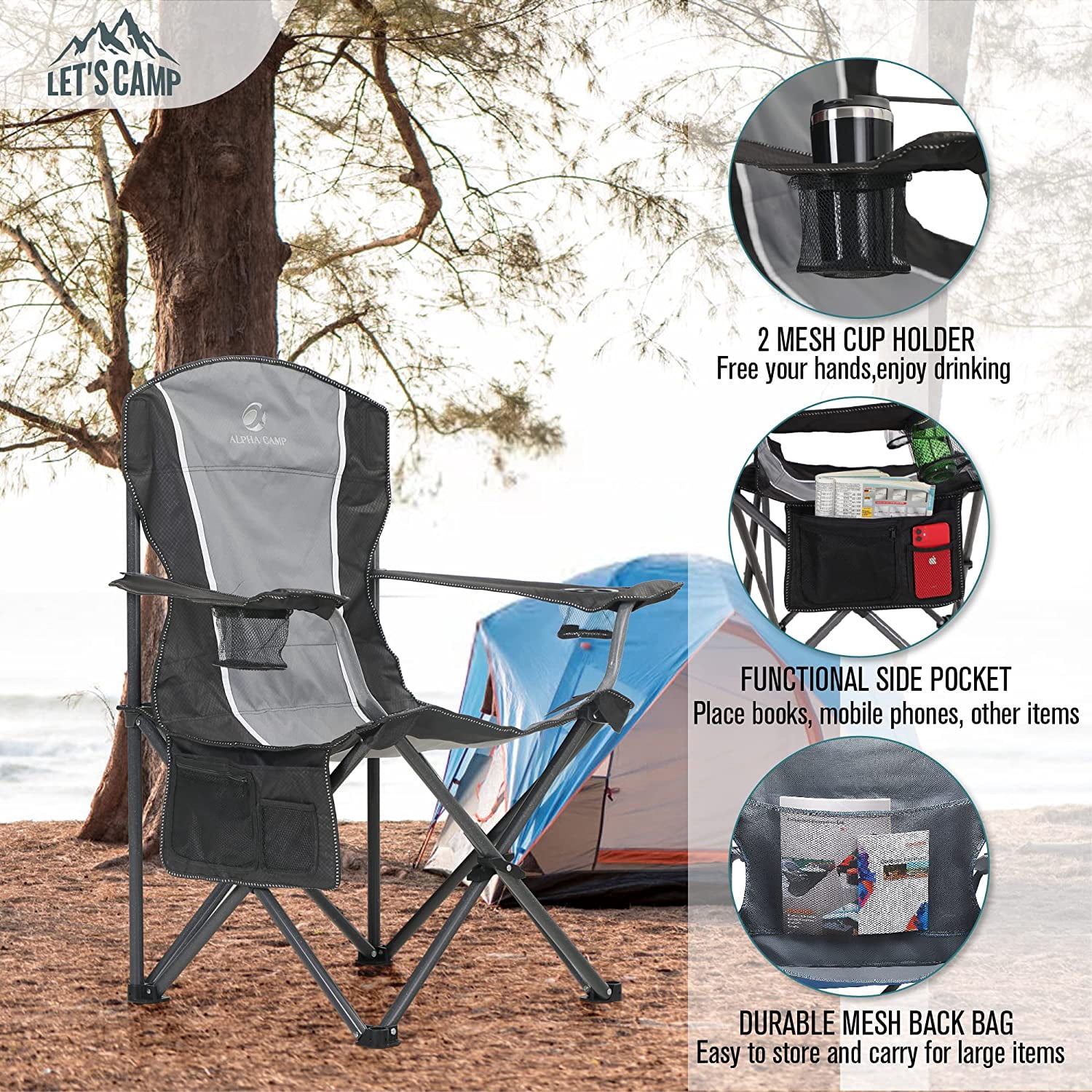 Foldable & Portable: Our camping chair is easy to set up and fold. 5.9″ x 38.58″ after folded, weighs only 9.7 lbs, convenient to store and transport. This portable folding chair is a perfect outdoor seat Wide Size: Open dimension is 36.22″ L x 23.62″ W x 43.3″H; Weight Capacity: 350 LBS. This oversized camping chair features more stability and security. You’re supported a long lasting chair to enjoy outdoors all year round Humanized Design: Ergonomic back and cushioned armrest make you feel good even if you sit in the chair for a long time. Durable mesh cup holders, side storage pocket and storage back bag bring you a great sense of convenience Strong Frame & Fabric: Features with durable powder-coated steel tube frame, 600D oxford fabric, ergonomic high back and armrests, which bring you the luxuries comfort Multi-scene Use: Perfect for camping, fishing, picnic, hiking, concerts or other outdoor activities. This portable chair is a perfect choice for your outdoor camping life