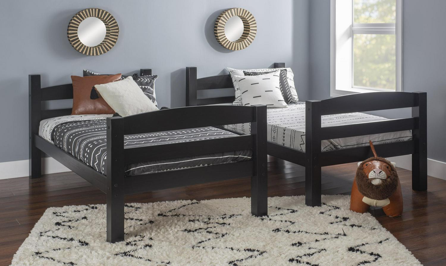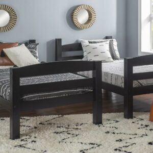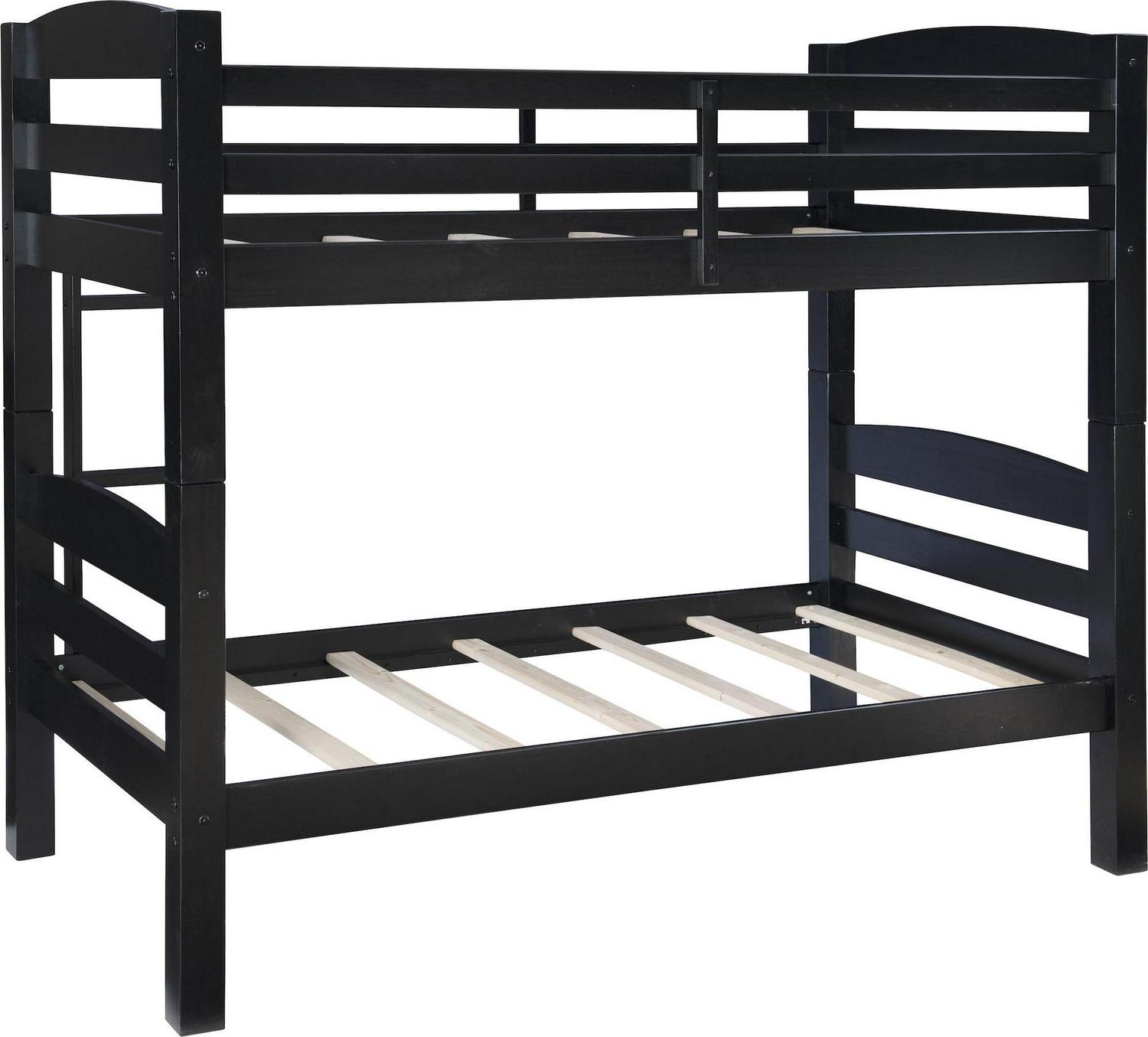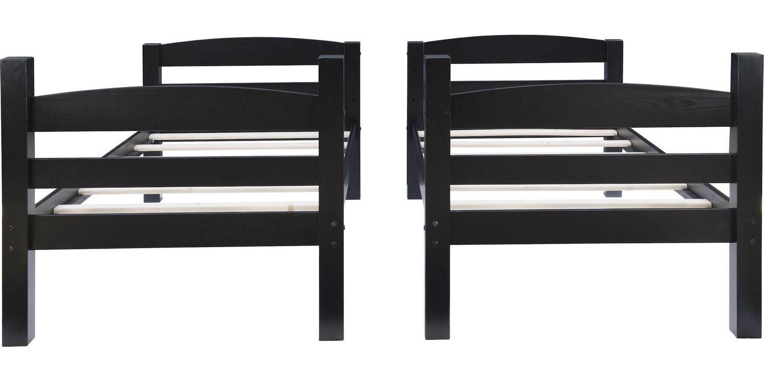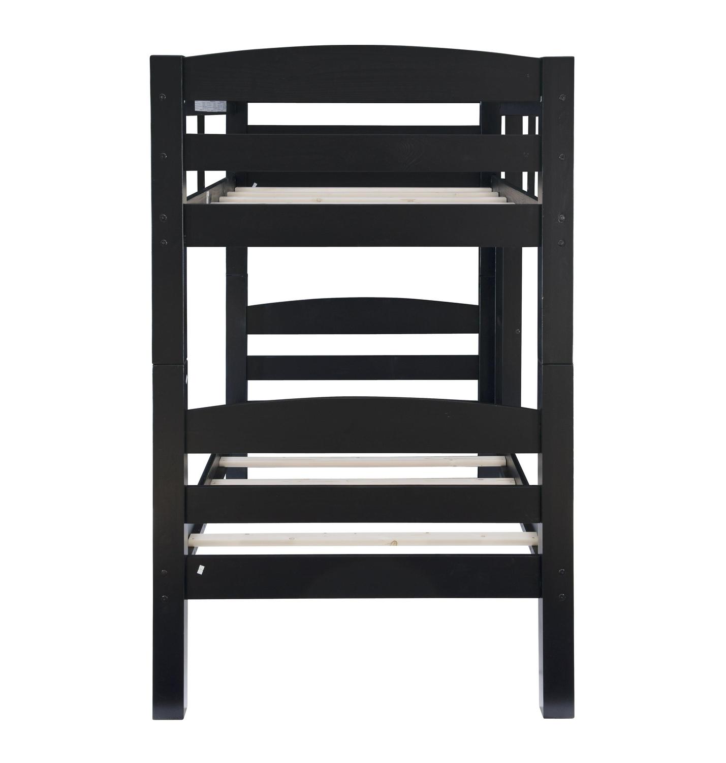 Combining classic style with a sleek modern look, the Powell Levi Bunk Bed is made for today’s youth. The bunk bed is made of pine wood and offers extra room for guests or siblings, featuring a twin bed over a twin bed. The headboard and footboard have a curved slat detail with sturdy square posts. The ladder is built-in and the heavy, duty slats will support a mattress without needing a bunkie board. Beds can be detached to convert into separate twin beds for versatility. Made to withstand, the beds have a 400 lb static weight limit for each bunk surface. Black finish. Mattresses not included