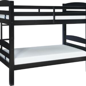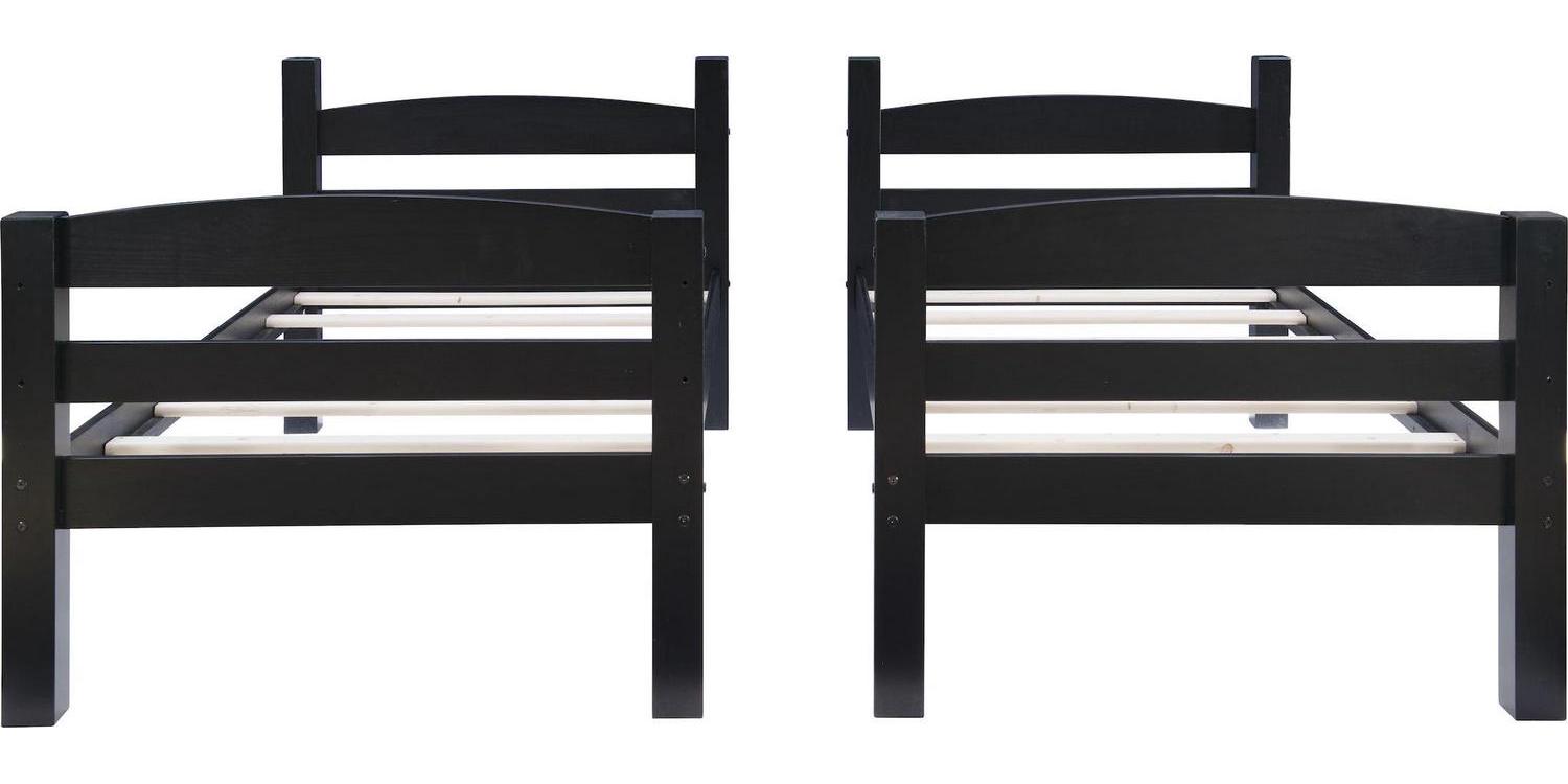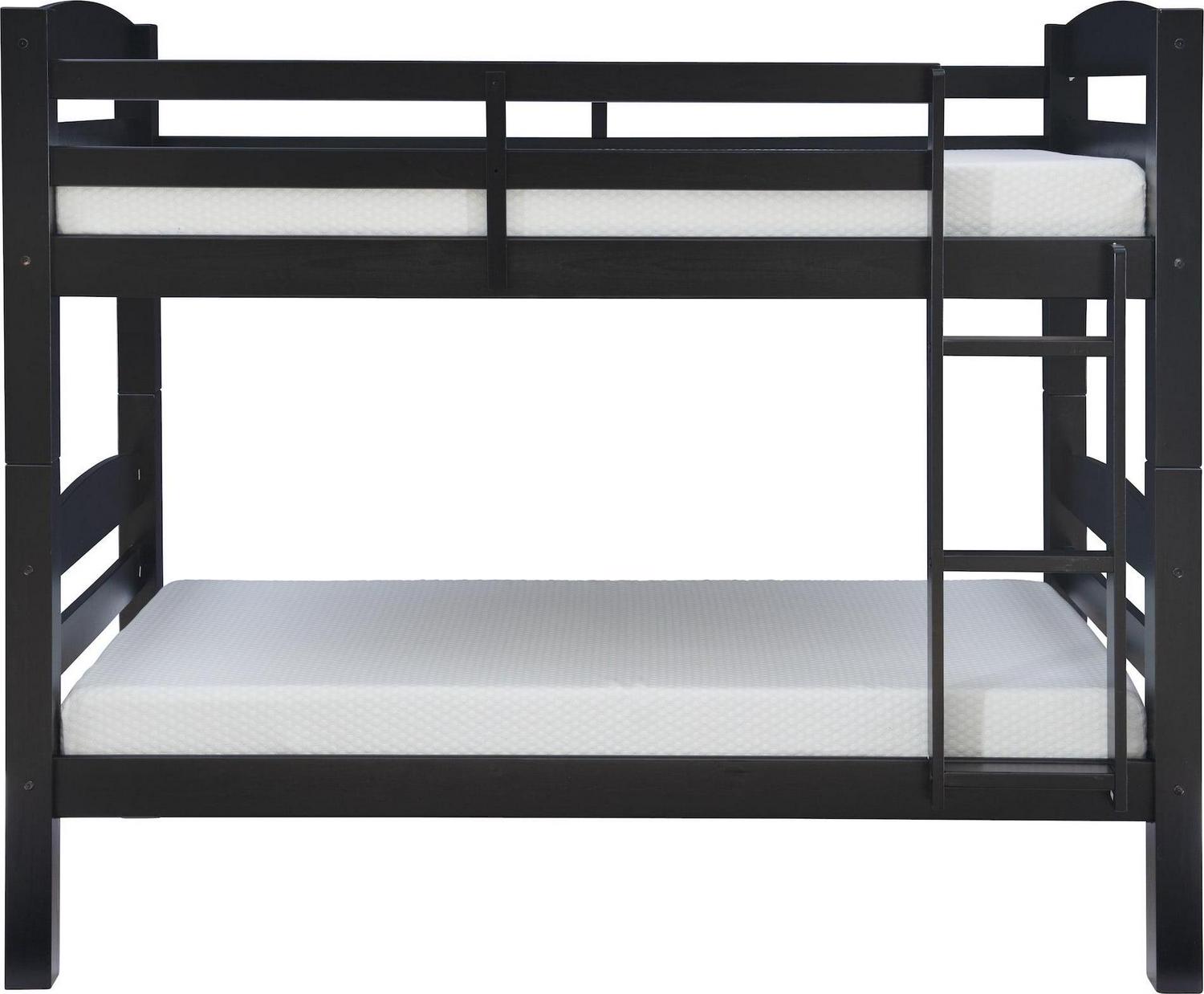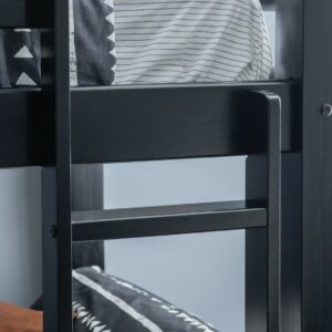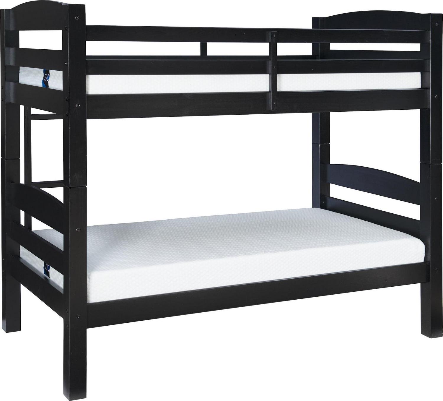 Combining classic style with a sleek modern look, the Powell Levi Bunk Bed is made for today’s youth. The bunk bed is made of pine wood and offers extra room for guests or siblings, featuring a twin bed over a twin bed. The headboard and footboard have a curved slat detail with sturdy square posts. The ladder is built-in and the heavy, duty slats will support a mattress without needing a bunkie board. Beds can be detached to convert into separate twin beds for versatility. Made to withstand, the beds have a 400 lb static weight limit for each bunk surface. Black finish. Mattresses not included