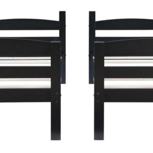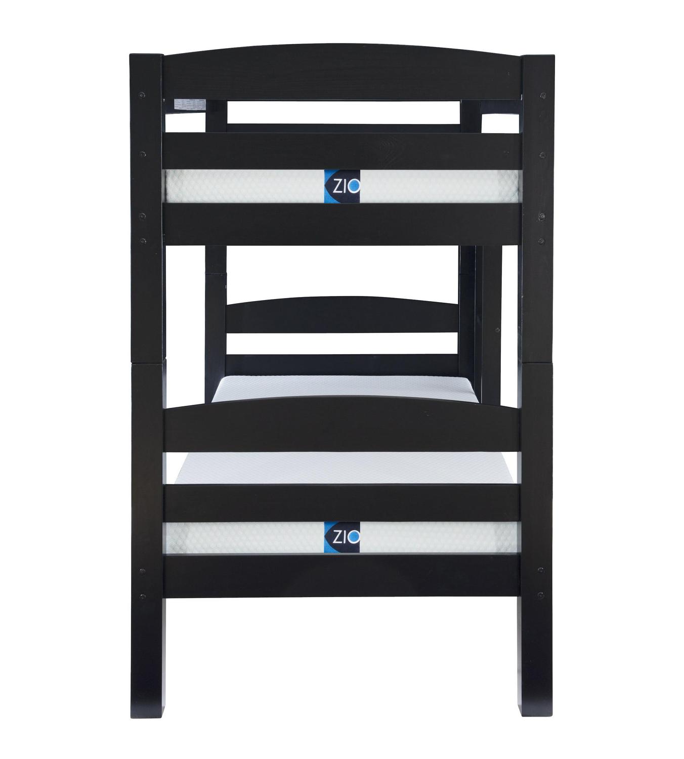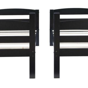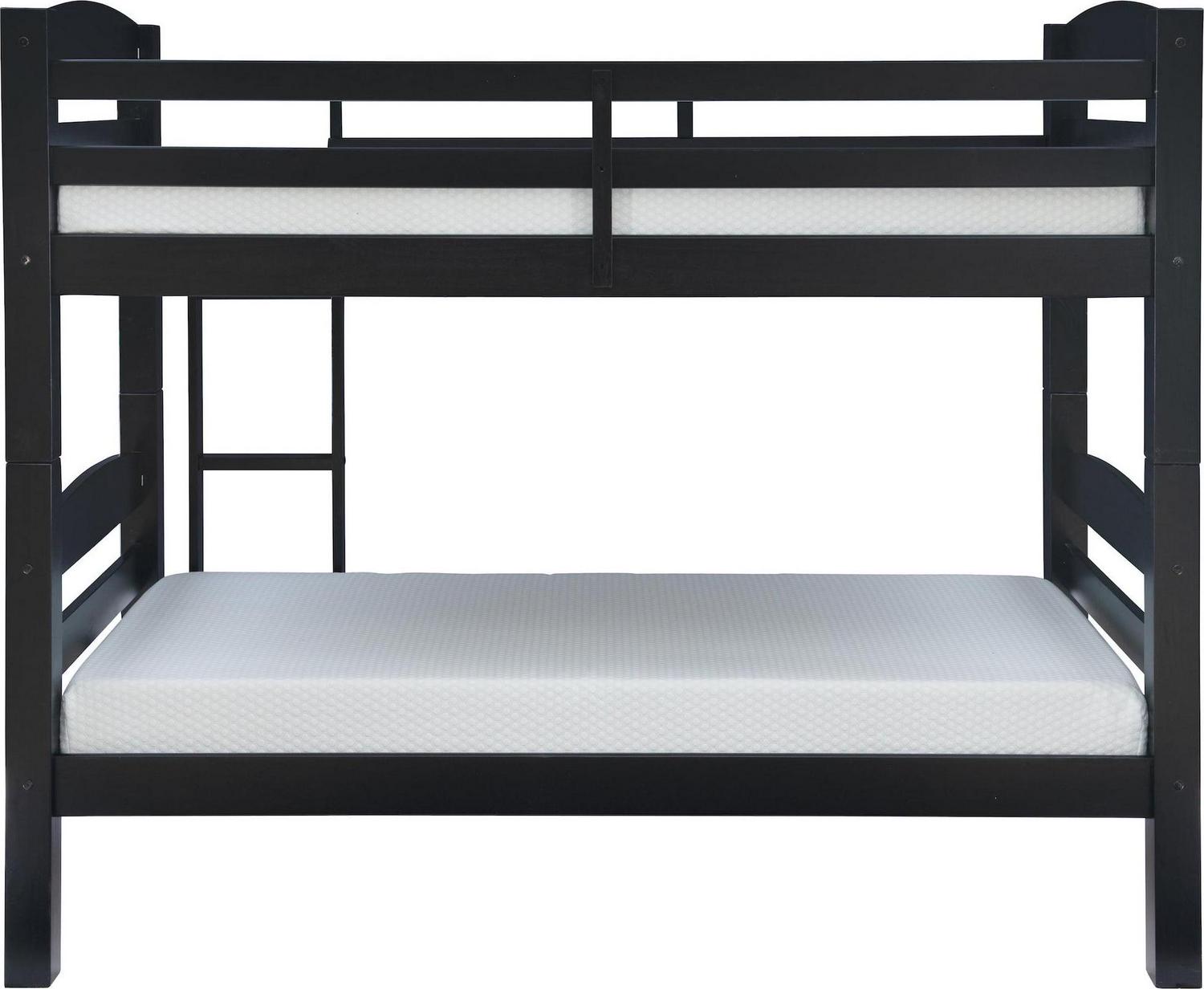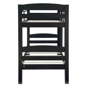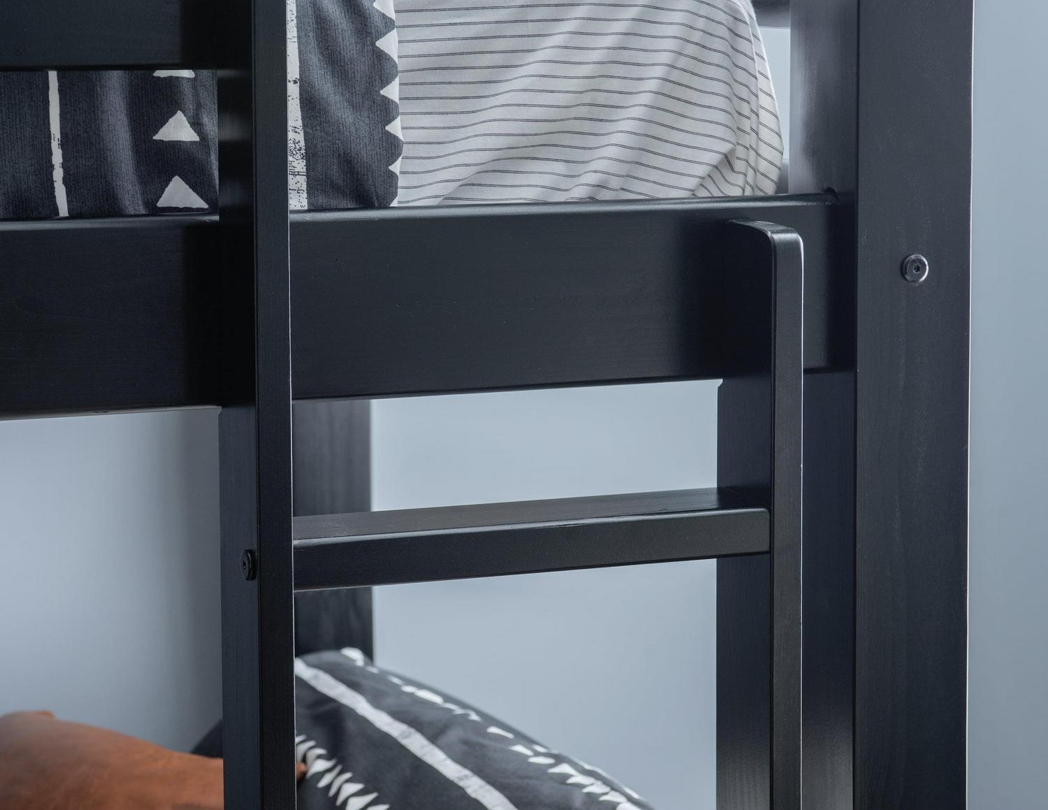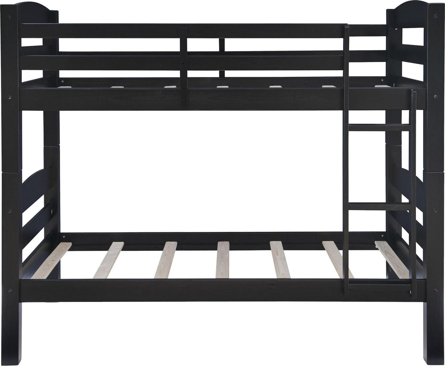 Combining classic style with a sleek modern look, the Powell Levi Bunk Bed is made for today’s youth. The bunk bed is made of pine wood and offers extra room for guests or siblings, featuring a twin bed over a twin bed. The headboard and footboard have a curved slat detail with sturdy square posts. The ladder is built-in and the heavy, duty slats will support a mattress without needing a bunkie board. Beds can be detached to convert into separate twin beds for versatility. Made to withstand, the beds have a 400 lb static weight limit for each bunk surface. Black finish. Mattresses not included