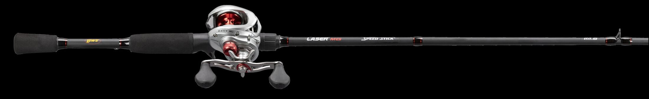 The 8-ball bearing Laser MG baitcast reel features a one-piece, lightweight graphite frame and sideplates. The palming sideplate is quick and easy to remove for immediate access to the spool. The heart of the reel is the solid brass Speed Gears cut on precision Hamai gear hobbing machines. A durable Rulon drag system delivers up to 15 lbs. of drag power, with adjustments made easily using the bowed graphite star located next to the handle. The rod features Lew’s proprietary skeletal graphite reel seat to keep the reel secure and in place without jeopardizing sensitivity. The rod’s EVA split grip handle reduces weight and makes for all-day fishing comfort. A patented “No Foul” hook keeper stays out of the way during casts and retrieves, but on the ready to safely secure a hook or lure when not in use.