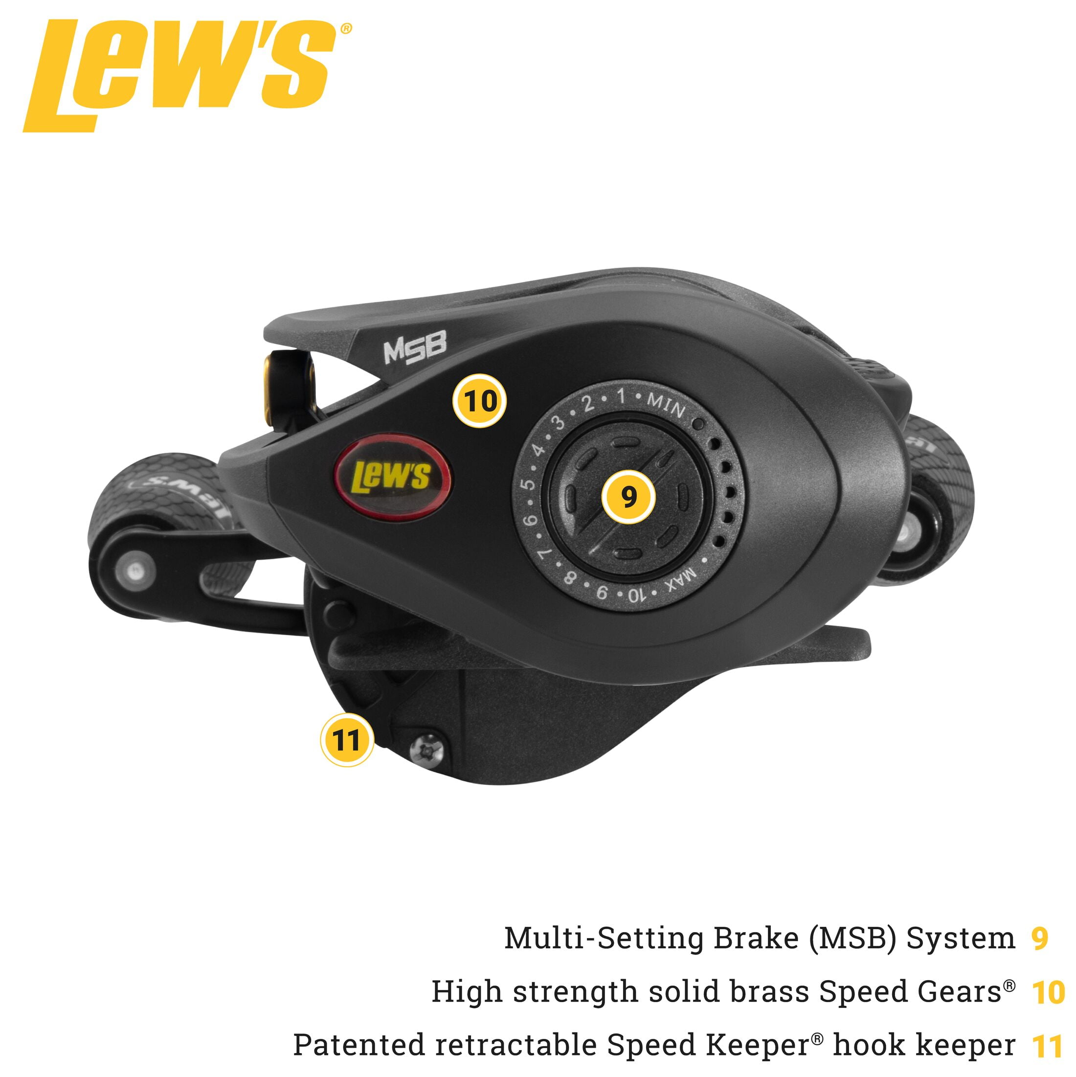 U-SHAPED 39mm SPOOL is oversized, machined, and double-anodized, and is braid-ready with a large line capacity MULTI-SETTING BRAKE SYSTEM (MSB) combines externally adjustable magnetic and internally adjustable centrifugal braking for ultra-precise casting SPEED GEARS® are cut on the finest Hamai CNC machines to provide smooth cranking power with less gear wear 100mm BOWED HANDLE is made with anodized aluminum with Winn® Dri-Tac knobs to provide control and power in all conditions SPEED KEEPER® HOOK KEEPER is Lew’s® patented and retractable, increasing your efficiency and protecting the reel from hooks