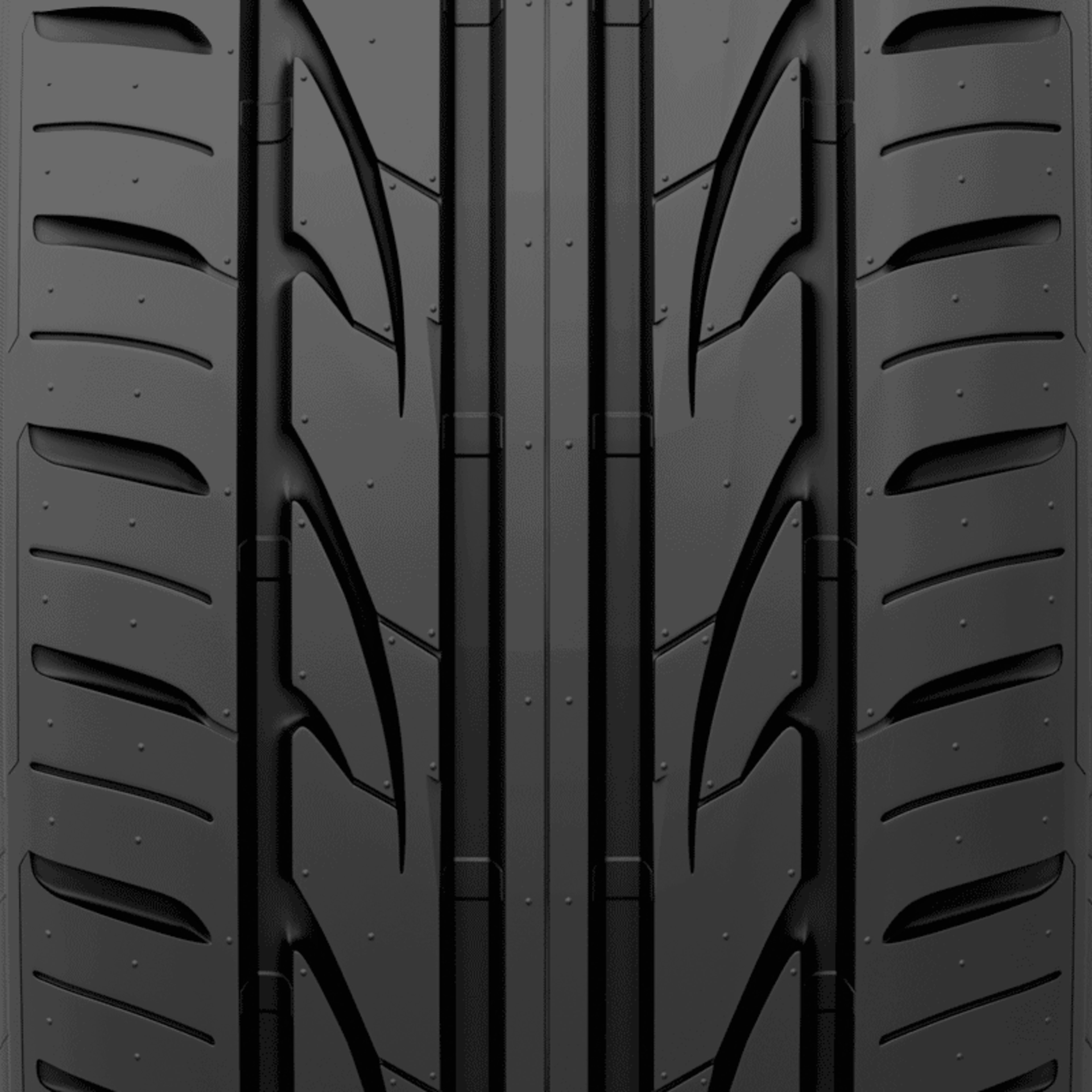 - Lateral “V” shaped grooves improve hydroplaning resistance and wet grip by quickly forcing water out of the tread