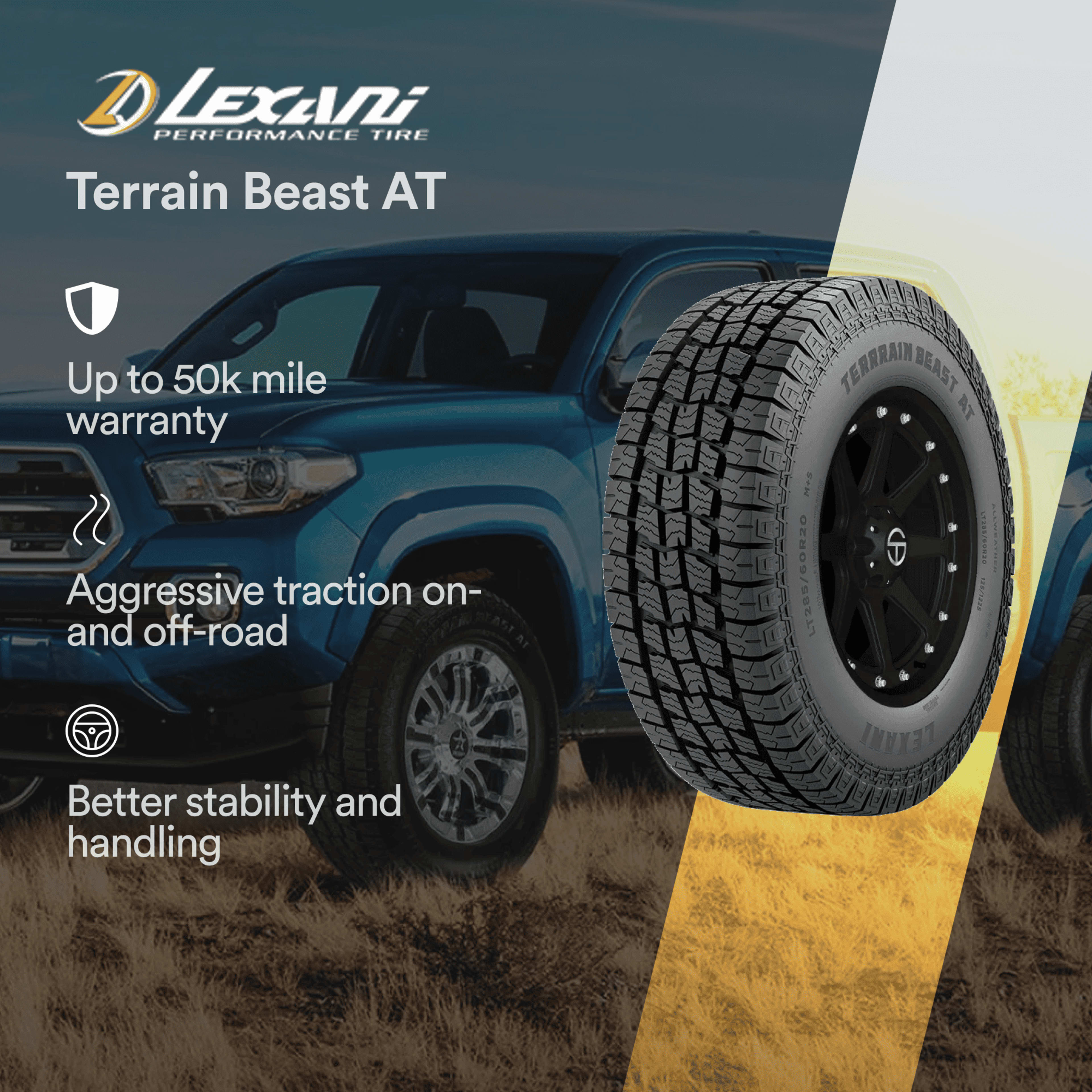 Designed for use on light trucks and SUVs, the Terrain Beast AT from Lexani is an all-terrain tire that features an aggressive tread pattern with deep grooves and sipes for better traction and performance in rainy, muddy, and snowy conditions. A computer optimized design lowers road noises and vibrations to create a quiet, comfortable ride for drivers and passengers on paved roads, and the Terrain Beast AT’s unilateral center rib increases stability while also fending off uneven wear for a longer tread life.