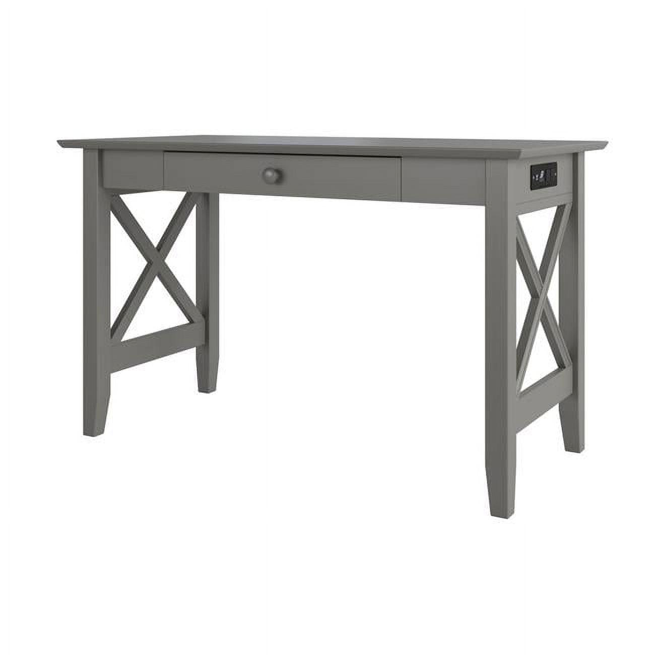 Ample study space and a drawer to store supplies are the hallmarks of our functional and fashionable Lexi Desk. The distinctive crossed design will make your office the focal point of your home. As durable as they are chic, this desk is manufactured using sustainably sourced solid hardwood. The perfect addition to any home office or study space, this desk offers a large work area that comfortably accommodates a laptop or desktop, along with a spacious storage drawer for all of your other work essentials. This desk also includes a built-in charging station for all of your favorite devices!