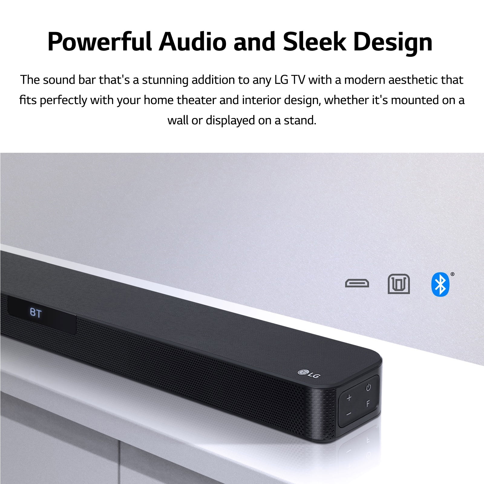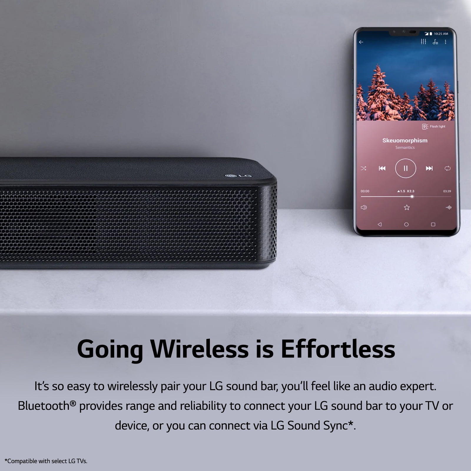 Going Wireless Is Effortless -It’s so easy to pair your LG sound bar wirelessly, you’ll feel like an audio expert Powerful Audio and Sleek Design -The soundbar that’s a stunning addition to any LG TV with a modern aesthetic that fits perfectly with your home theater and interior design, whether it’s mounted on a wall or displayed on a stand Audio That Sounds Closer to the Real Thing -Leading audio processing technology provides sound quality that surpasses CDs and allows you to enjoy a stunning 24-bit/96kHz audio resolution as close to the original sound as you can get. (Compatible high-resolution music files required, sold separately) High-Resolution Audio -Digital music for audiophiles, with higher sampling rates and bit depth, can contribute to more accurate, more enjoyable music listening. This certified High-Resolution Audio sound bar can play back lossless stereo audio at up to 24-bit/96kHz quality
