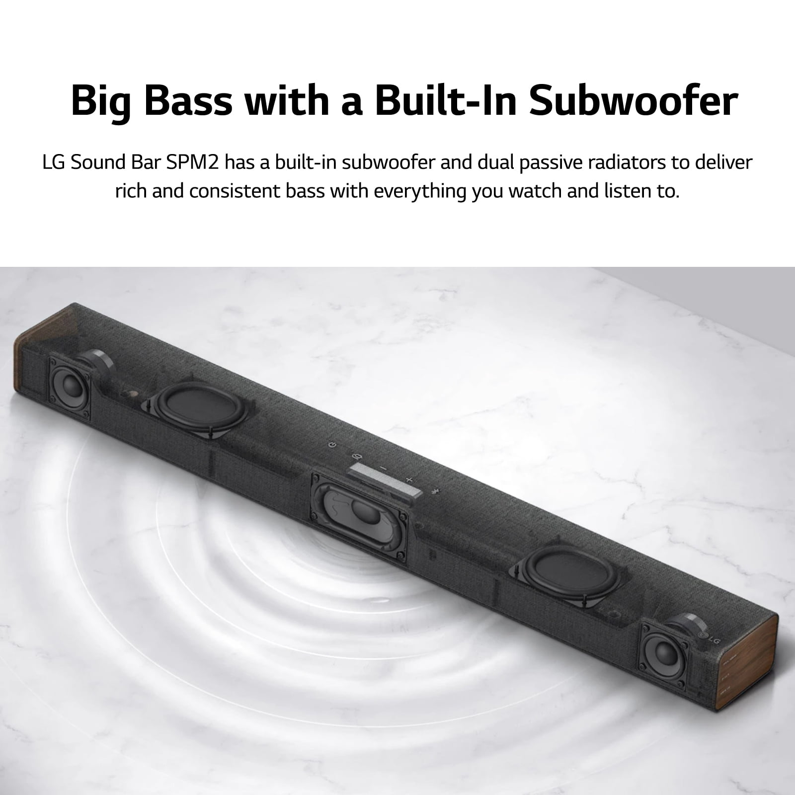 2.1 Channel Sound That Fits Your Style: With 2.1 channels and a Built-in Subwoofer, there’s nothing small about the sound Built-in Subwoofer + Passive Radiators Deep and Daring: Turn up the bass with a Built-in Subwoofer and dual passive radiators for a bold and consistent bass you can feel Design The Sound of Style: A sound bar that looks as good as it sounds with stylish wood-tone side panels, elevated controls, and premium fabric to complement your TV and home LG Sound Sync All Synced Up & Ready to Play: Free yourself from wires by connecting your LG TV and sound bar using Bluetooth technology and synchronizing audio between devices HDMI Arc -One & Done: Eliminate messy cables by connecting your sound bar with just one cable