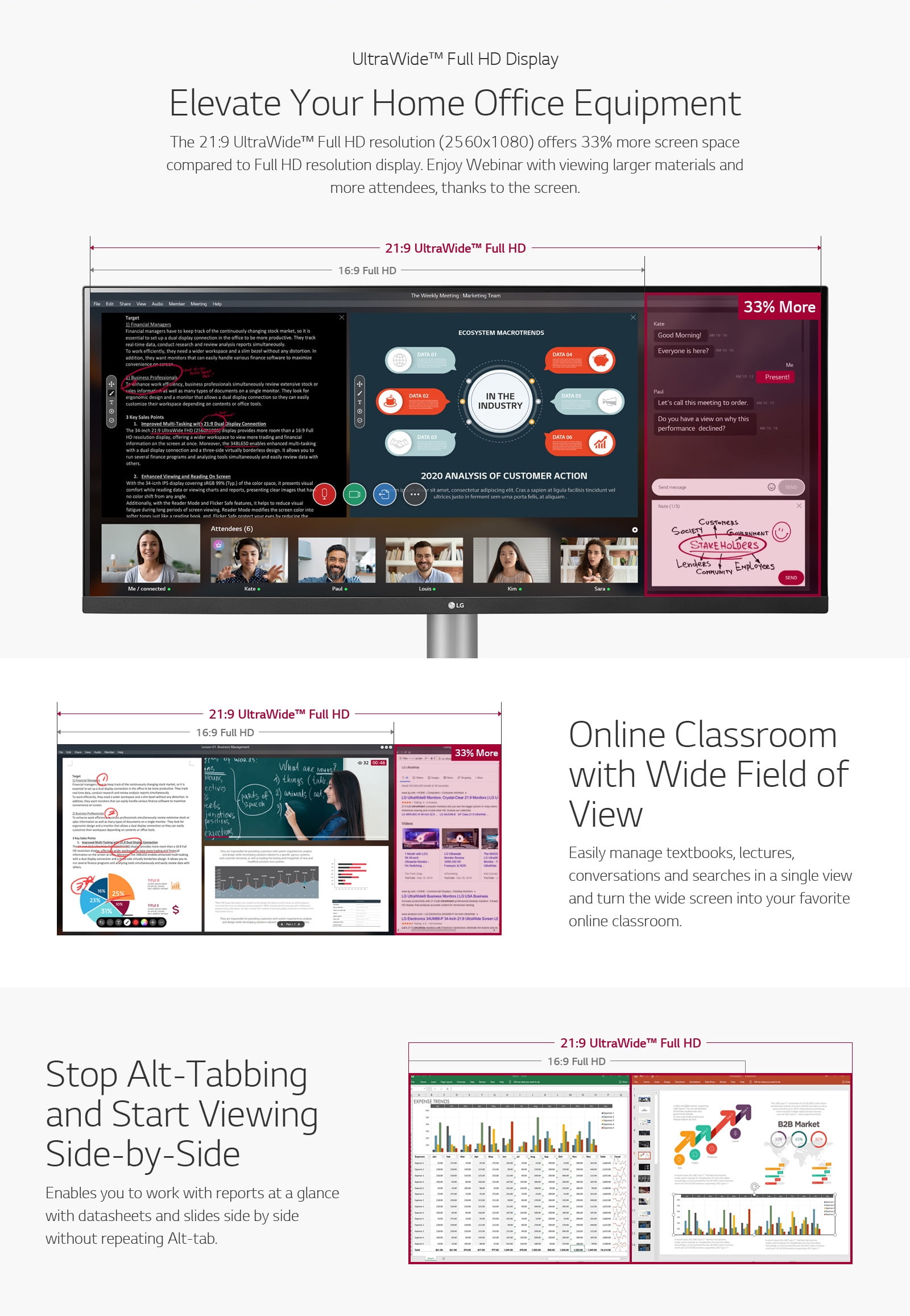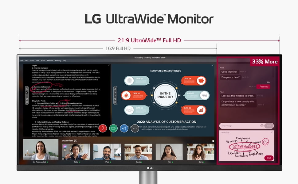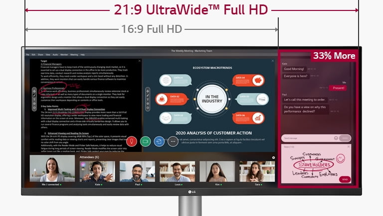 Your workspace just got wider with the #1 UltraWide Monitor brand in the U.S. for 3 years in a row. LG’s premium UltraWide monitors immerse you in everything from content creation to gaming. See a panoramic view made possible by the extra wide 21:9 IPS display for true color accuracy at wide angles. Experience easier multitasking, quickly switch between applications and enjoy a full, unencumbered view. The 21:9 UltraWide™ Full HD resolution (2560×1080) offers 33% more screen space compared to Full HD resolution display. Enjoy Webinar with viewing larger materials and more attendees, thanks to the screen.