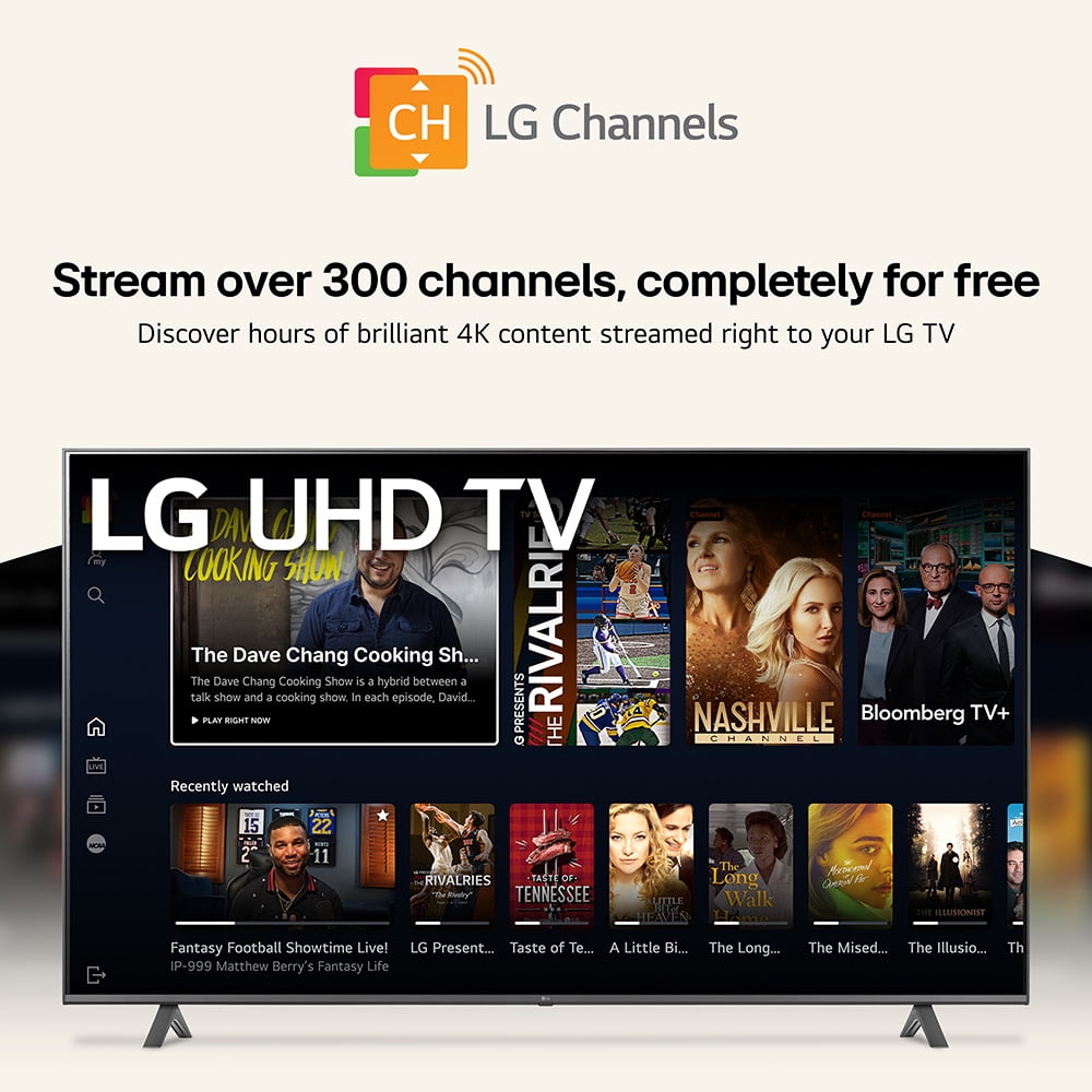 Dive into a world of free content and personalized recommendations for everyone you share the remote with. Enhance your picture and sound with AI from the α5 Gen5 AI Processor 4K that is engineered to amaze by transforming your regular content into 4K for sharper definition and detail, even on our biggest screens*. Take binge-watching further by customizing your viewing experience with separate accounts and personalized recommendations for every member of your family with webOS 22. And enjoy binge-worthy streaming with built-in access to Netflix, the Apple TV app, Disney+, HBO Max** and to over 300+ free LG Channels*** with everything from comedy to movies to sports. For gamers, you can make it the best gaming experience by quickly adjusting all your game settings in one location with the LG Game Optimizer and Dashboard. Bring your content to life with LG UHD. See a vivid picture every time with LG UHD’s 4K resolution. *Image quality of upscaled content will vary based on the source resolution. **Internet connection and subscriptions to streaming services are required. HBO Max™ ©2022 Warner Media, LLC. All Rights Reserved. HBO Max is used under license. ***Number of LG Channels subject to change.