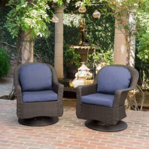 Enjoy a conversation with a friend on the Liam Outdoor Wicker Swivel Club Chairs – Set of 2. This set of two club chairs is constructed with an iron frame that is wrapped in resin wicker. A dark brown finish completes the design of this stylish chair. This set also includes two seat and two back cushions in a rich navy blue. These chairs have a swivel feature for ease of conversing.