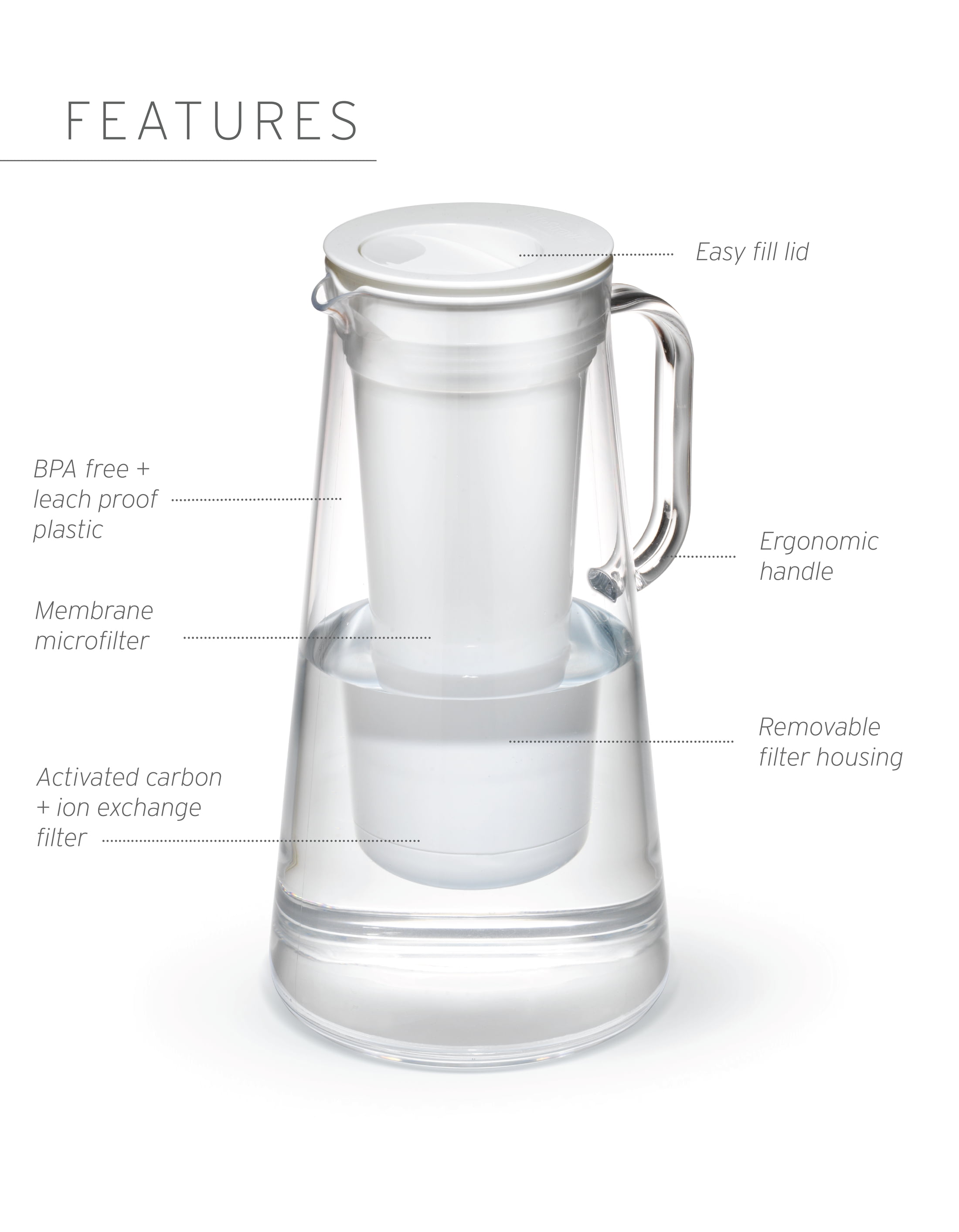 TOP FEATURES LifeStraw Home 10-Cup Water Filter Pitchers are BPA-Free and provide next level protection against +30 contaminants found in tap water, including bacteria, parasites and microplastics. Protect your family from water contaminants while maintaining minerals, reducing odor and improving taste The ONLY water filter pitcher to protect against bacteria, parasites, microplastics, lead, mercury, PFAs/PFOAs, chlorine, organic chemical matter (pesticides and herbicides) and more Retains essential minerals like magnesium, calcium and potassium that are good for your health Sleek and sustainable design, made from durable, BPA-free plastic. Easy to use and maintain The advanced 2-stage water filter reduces chlorine and harmful contaminants for cleaner, better tasting water The Membrane Microfilter lasts 264 gallons (approx. 1 year). The Activated Carbon + Ion Exchange filter lasts 40 gallons (approx. 2 months) Rigorously testing: All LifeStraw Water Filters are independently tested in our accredited lab meet/exceed US EPA and NSF/ANSI International standards Your purchase has impact: one product, one child, one year of safe water FILTRATION SPECIFICATIONS LifeStraw Home Membrane Microfilter Removes 99.999999 % of bacteria (E. coli, etc.) Removes 99.999 % of parasites (Giardia, Cryptosporidium, etc.) Removes 99.999 % of microplastics Pore size: 0.2 micron Filters 264 gallons, approximately 1 year of use LifeStraw Home Activated Carbon + Ion Exchange Filter Reduces lead, mercury, chromium III, cadmium, copper and other heavy metals Reduces chlorine and bad odors for improved taste Reduces chemicals including PFAS, pesticides and herbicides Filters 40 gallons, approximately 2 months of use ADDITIONAL FILTRATION SPECIFICATIONS Meets NSF 53 standards for reduction of lead, mercury, chromium III, cadmium and copper Meets US EPA & NSF P231 drinking water standards for the removal of bacteria and parasites Meets NSF P473 standard for reducing PFOA and PFOS (PFAS) Meets NSF 401 standard for emerging chemical contaminants Meets NSF 42 standard for chlorine reduction PRODUCT SPECIFICATIONS Product size: 12.6 x 6.3 in Product weight: 1.8 lbs Capacity: 10-Cup Pitcher material: durable, BPA-free FDA-Food Grade compliant plastic Hand wash pitcher and filter housing, once filters are removed; do not use soap on filters Includes: Water Pitcher, Easy-Fill Lid, Water Filter Housing, LifeStraw Membrane Microfilter, LifeStraw Activated Carbon + Ion Exchange Filter, user manual AQUA Color UPC – 7640144284756 EAN – 7640144284756 Supplier Stock Number – LSHFP10AQ1 WHITE Color UPC – 7640144284749 EAN – 7640144284749 Supplier Stock Number – LSHFP10WH1 GRAY Color UPC – 7640144284732 EAN – 7640144284732 Supplier Stock Number – LSHFP10GRA1