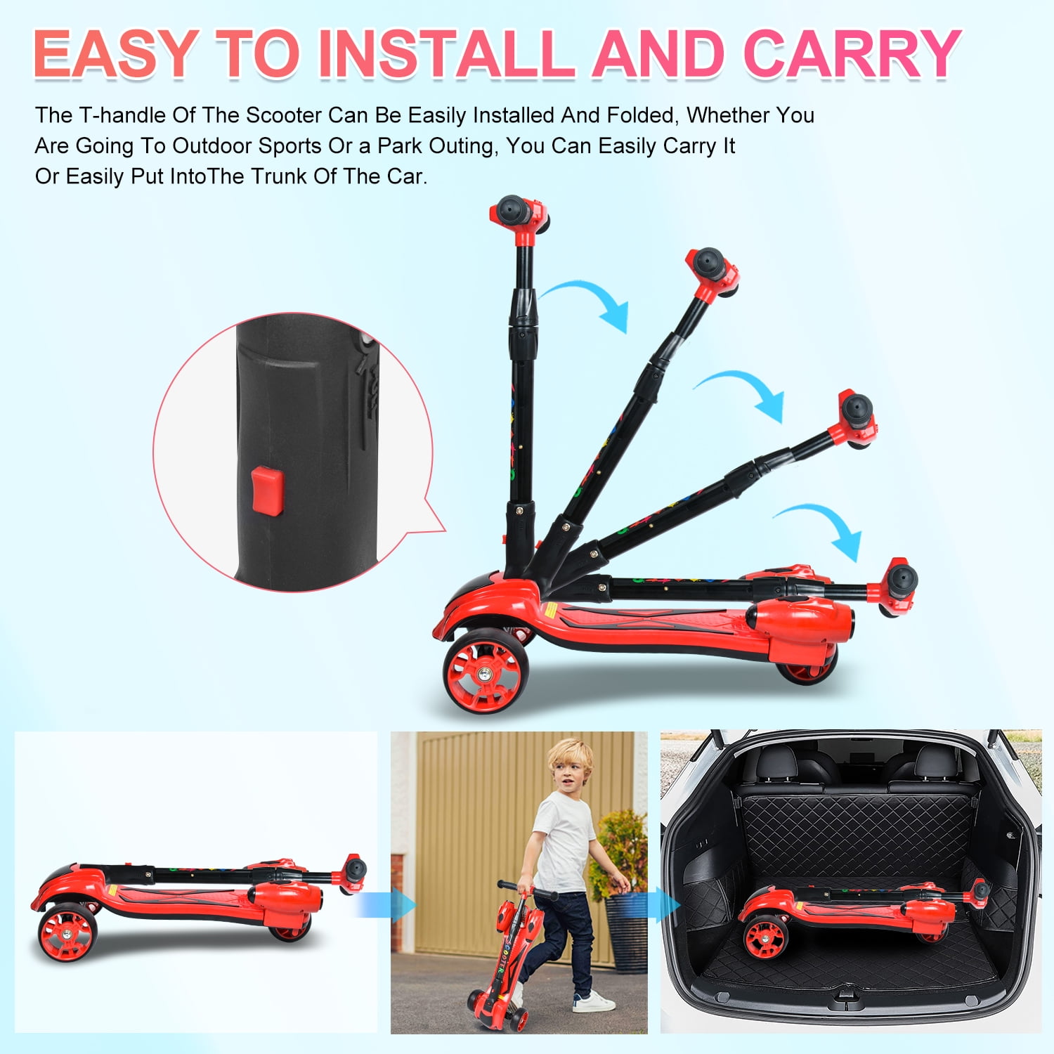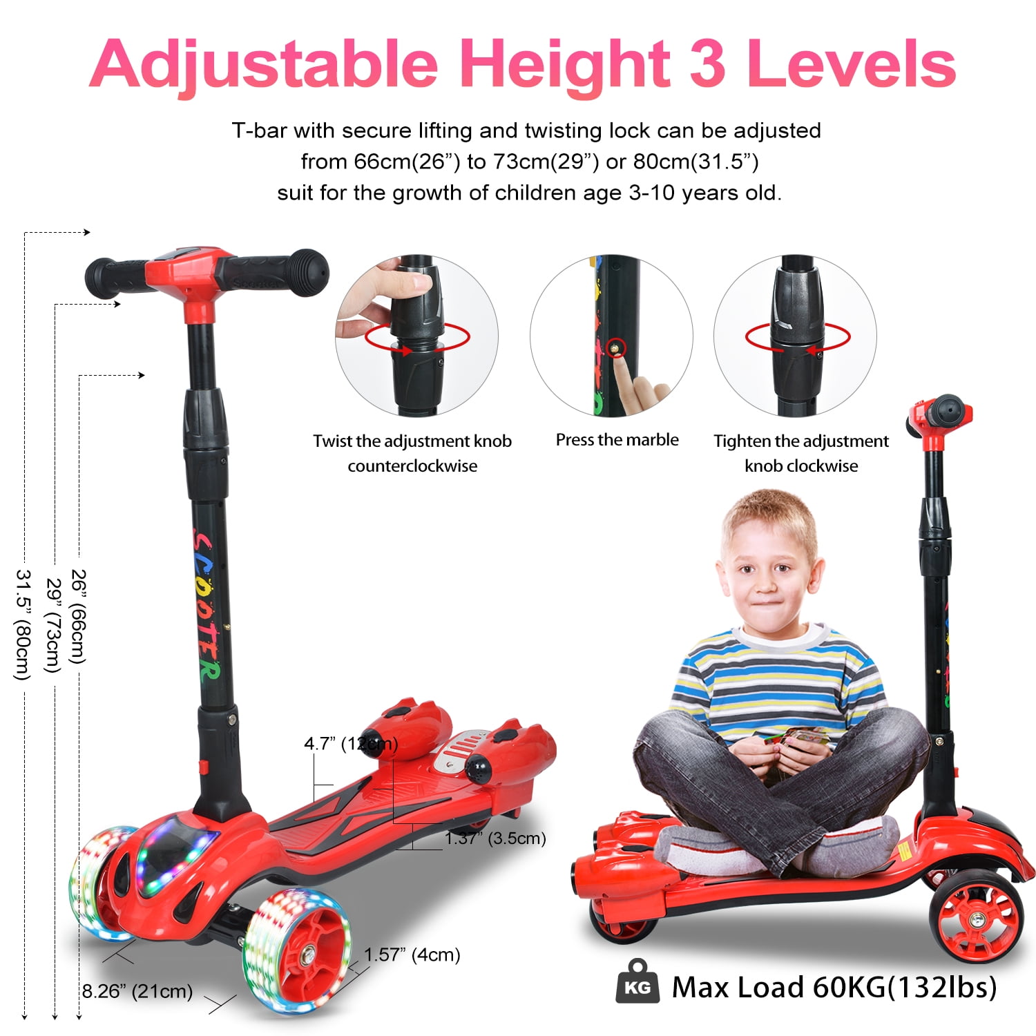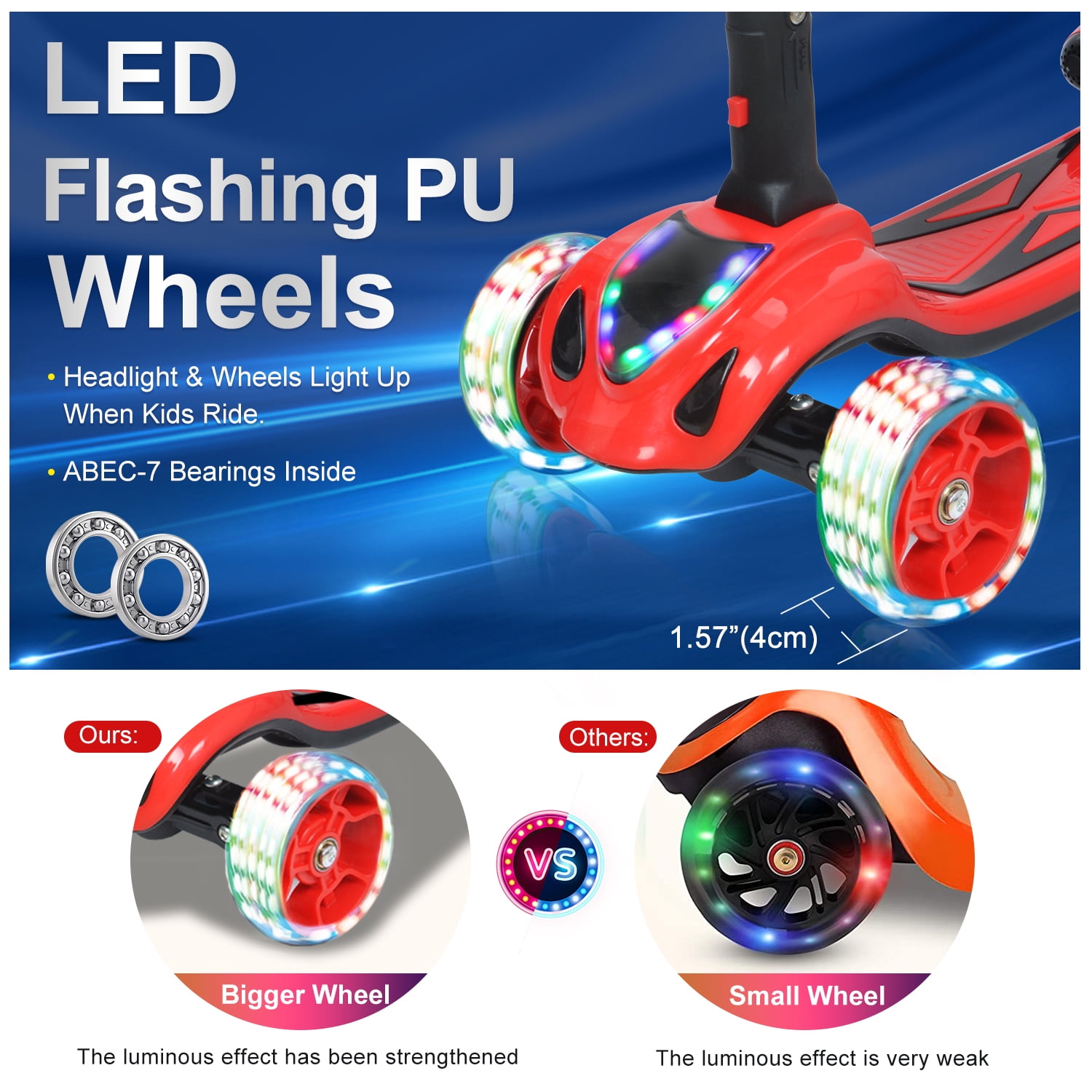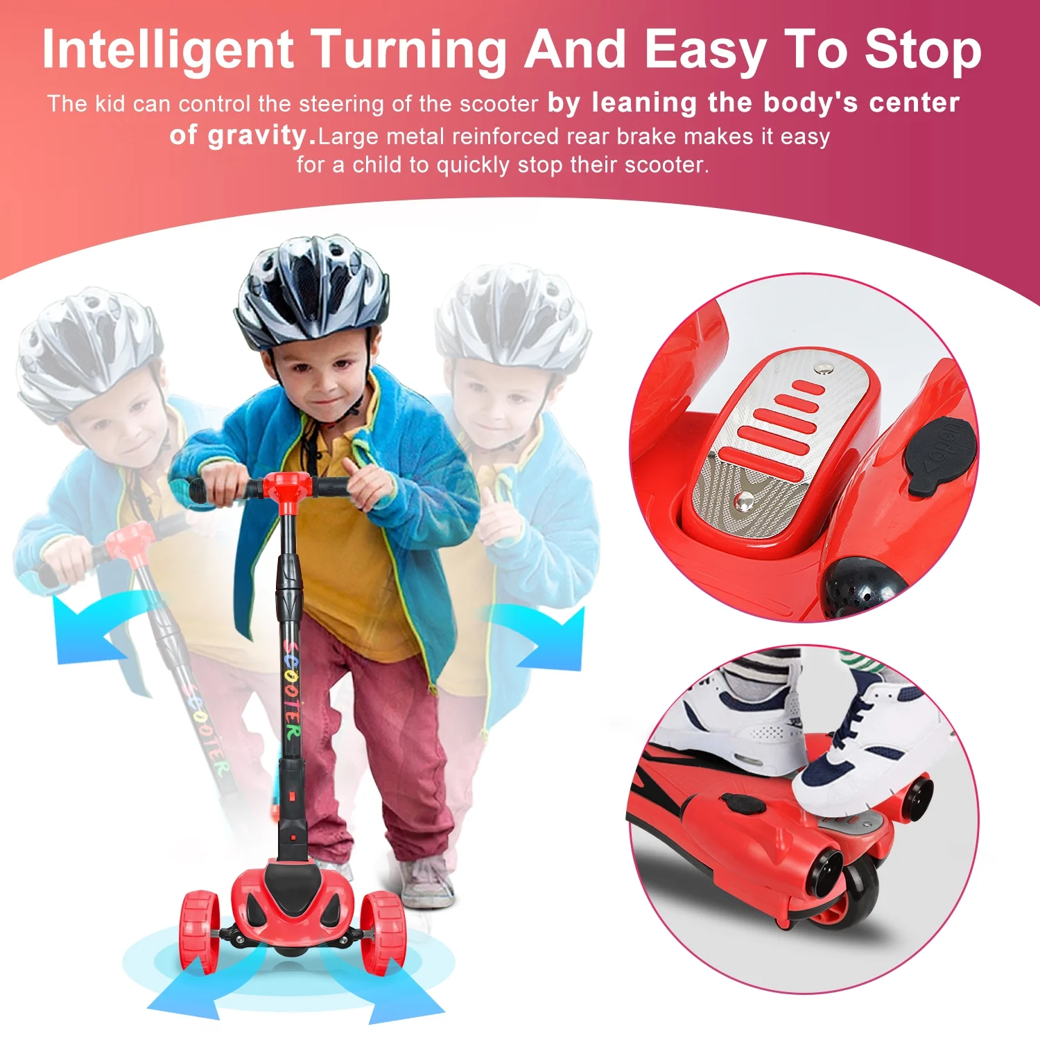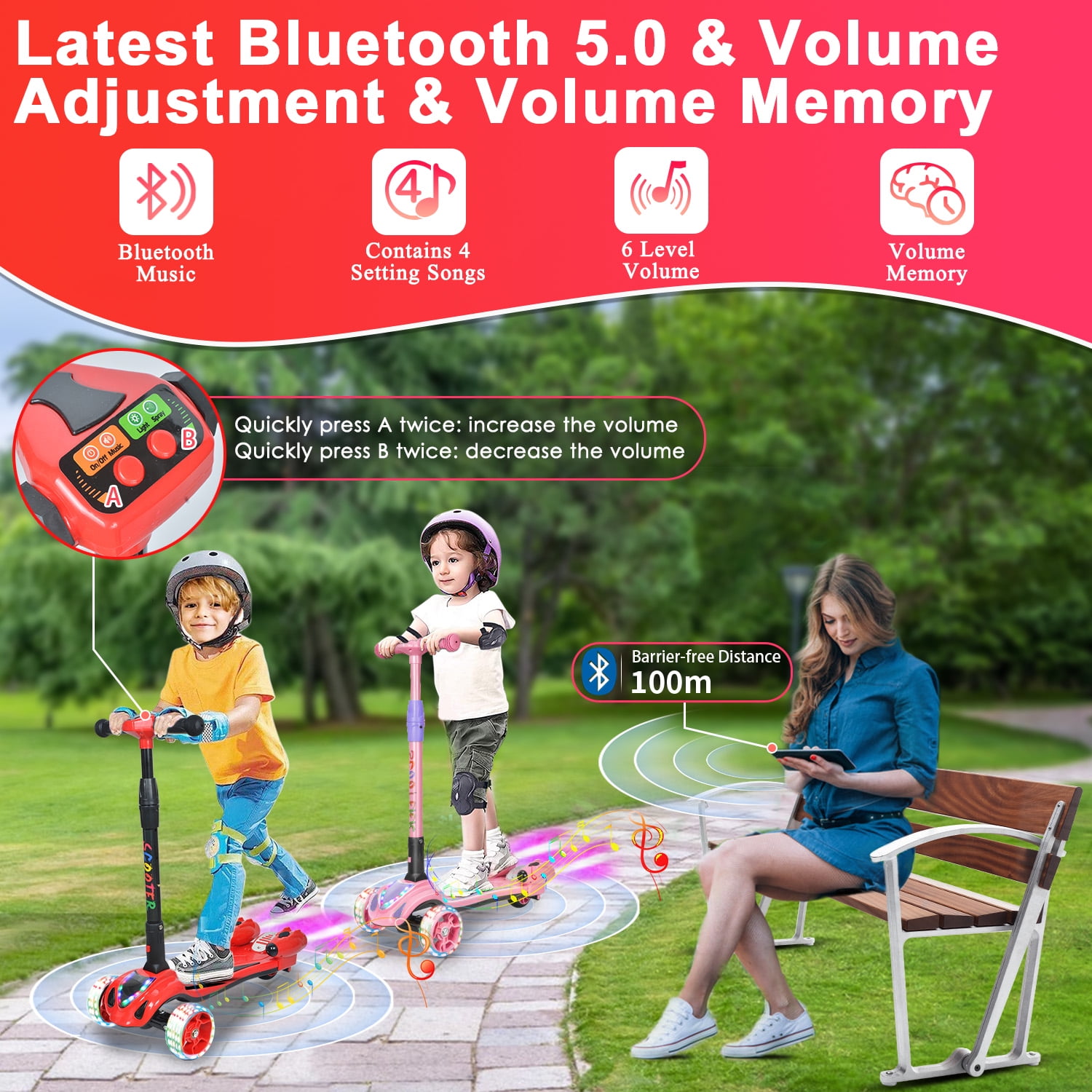 [Bluetooth Music & Rocket Steam Sprayer] The kids scooter is designed with cool LED headlights, rear lights and flashing PU wheels, which is a safety guarantee for riding at night. And it’s much more interesting and funny to turn on its in-built music and dual rocket steam sprayer function. Built-in Bluetooth 5.0 connection, which allows you to play your kids’ favourite songs within 100m. Comes with rechargeable battery, get rid of the trouble of frequent battery replacement and save money. The Gorgeous colors and innovative styles for the kick scooter is also an exciting attraction to kids. [Widened Flashing PU Front Wheels] 3 wheels scooters for boys and girls gives more stability and safety, maximum weight capacity up to Max 132LBS, wear-resistant and high elastic PU wheels provide essential shock absorption mechanism that gives the children a smooth gliding experience. And the front 2 wheels will light up when kids start to ride without battery, lights get brighter with the faster your kids go, let your kids be a shining star while scooting. It’s the best kids’ scooter for motivating play and activity. [3-Level Adjustable Height & Easy Assembly and Storage] The toddler scooter can be adjusted from 66cm to 73cm to 80cm from the ground, which makes it fit for the growing of your child for age from 3-10 years old. The rust-resistant aluminum alloy T-bar tube is designed with secure lifting and twisting lock, this new-designed stem lock provides more safety and durability compared to old-style collar clamps. Just tighten the supplied screws with the supplied screwdriver. No complicated instructions. Because of the folding design, the scooter can be easily put into the trunk of the car. [Easy to Smooth Ride & Stop] Lean to steer technology offers better turning control and balance training, help to enhance kids’ reflexes and coordination. The Kid can lean naturally and control the turning direction flexibly by relying on body strength. Thick anti-skid stainless aluminum reinforced brake pedal is easy to control the speed and use for quick and firm breaking which will reduce and avoid accidents by can’t stop fast. [Safe and Sturdy & 100% SATISFACTION GUARANTEED] Made from non-toxic ABS and PP plastic main body, sturdy and rust-resistant aluminum alloy T-bar tube, extra wide and thick deck, anti-slip silicone handlebar, 3 large wide PU light wheels, ensure the kick scooter gliding stably, smoothly and quietly. The deck is low-to-ground, making it easy for little kids to control the ride.