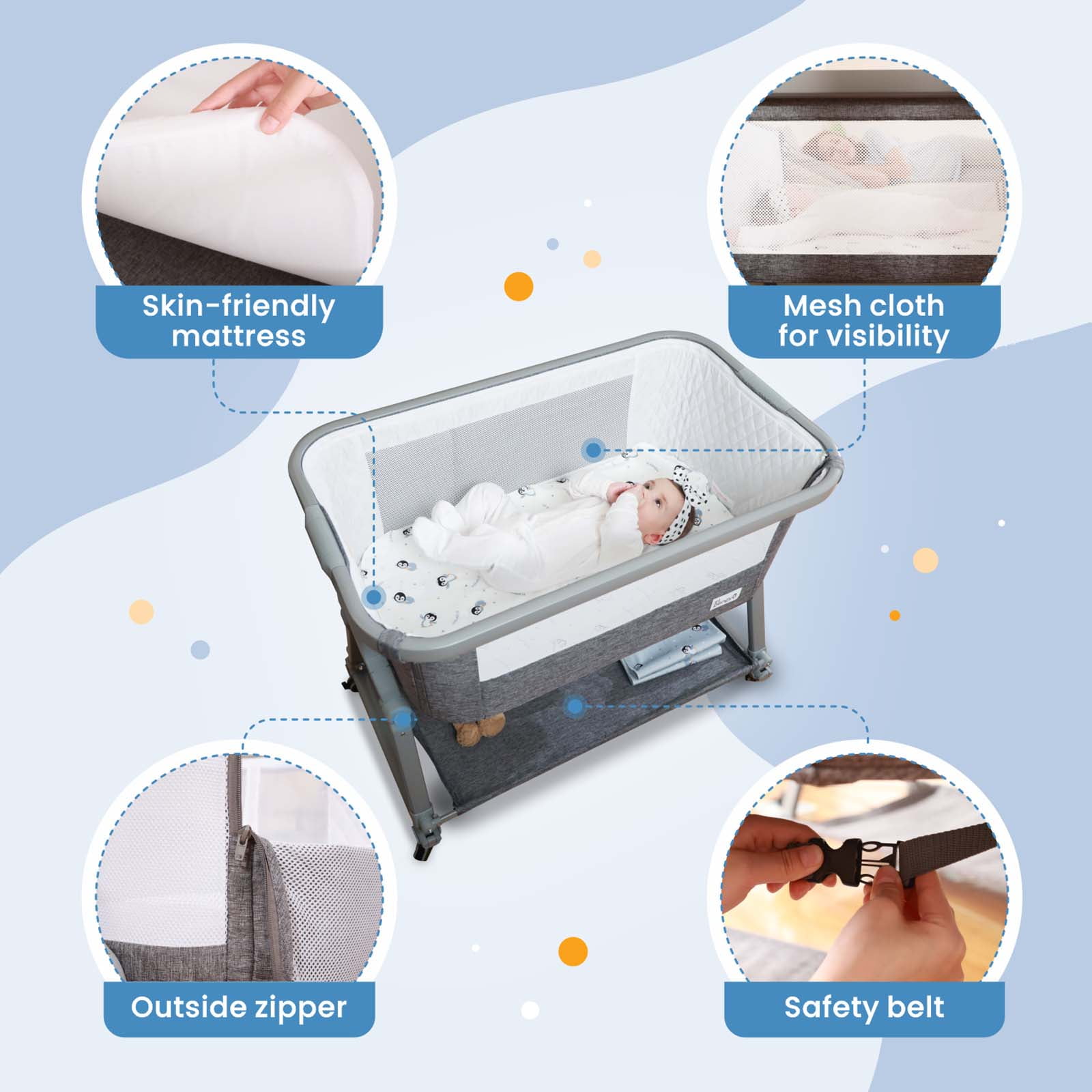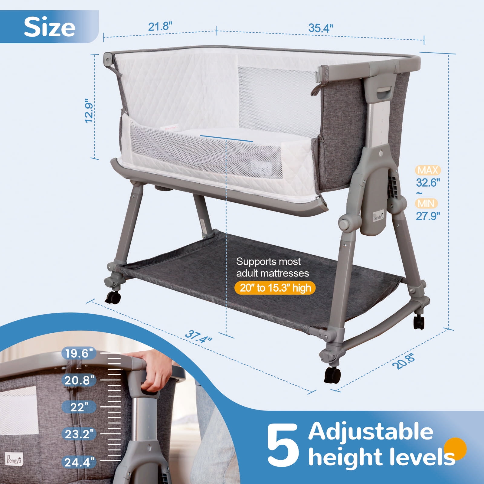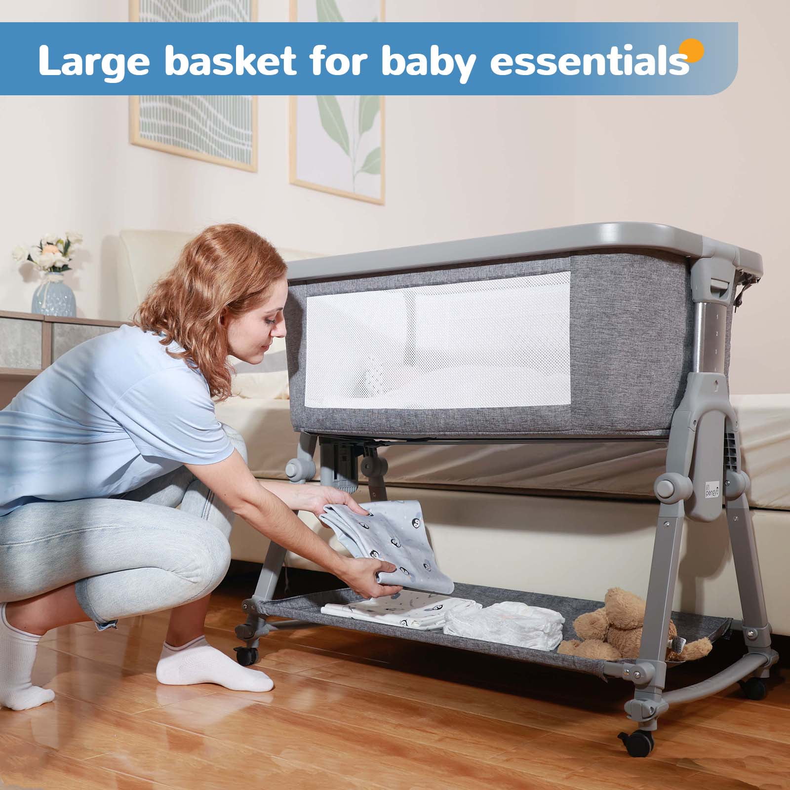 Collapsible Design & Portable: This bassinet features a patent-pending collapsible design that effortlessly folds downs for easy carrying, traveling, and moving around the house. Its steel alloy frame is lightweight and durable. The bassinett weighs only 23.8 pounds, measures 35.4 by 21.8 by 32.6 inches (LxWxH), and lowers to 27.9 inches in height. The convenient travel bag lets you fold and carry the bassinet anywhere, while lockable wheels ensure you can bring the product from room to room. Breathable: The waterproof cotton mattress is breathable for a more comfortable sleep. The soft mesh sides of the basinet provide good airflow throughout the night.*Bassinet sheets sold separately Convenient & Easy Set Up: Supports adult beds 15.3 to 20 inches high, including the mattress. Simply attach the wheels and unfold this collapsible bassinet when ready to use it (tool-free assembly in one minute). It quickly transforms into a rocking crib that lets you soothe your baby to sleep with a gentle swaying motion. The spacious bottom basket is perfect for storing your baby’s necessities like diapers and wipes. Better Sleep: The waterproof cotton mattress and included lining provide a comfortable yet firm sleeping space for your baby. In addition, you can adjust the angle of the bassinet to prevent the baby from reflux. The form-fitted, premium microfiber bassinet bed sheet securely fits the mattress for safer sleep. Waterproof and machine washable. * Basinett Sheets Sold Separately Safety: Our outside zipper makes it easy to detach the side panel for nursing or access to your baby or toddler while preventing them from getting scratched. In addition to our sound design, there is a cosleeping bedside attachment strap for added safety. (NOTE: We provide 12 hour customer service. Any questions, please feel free to contact us!)