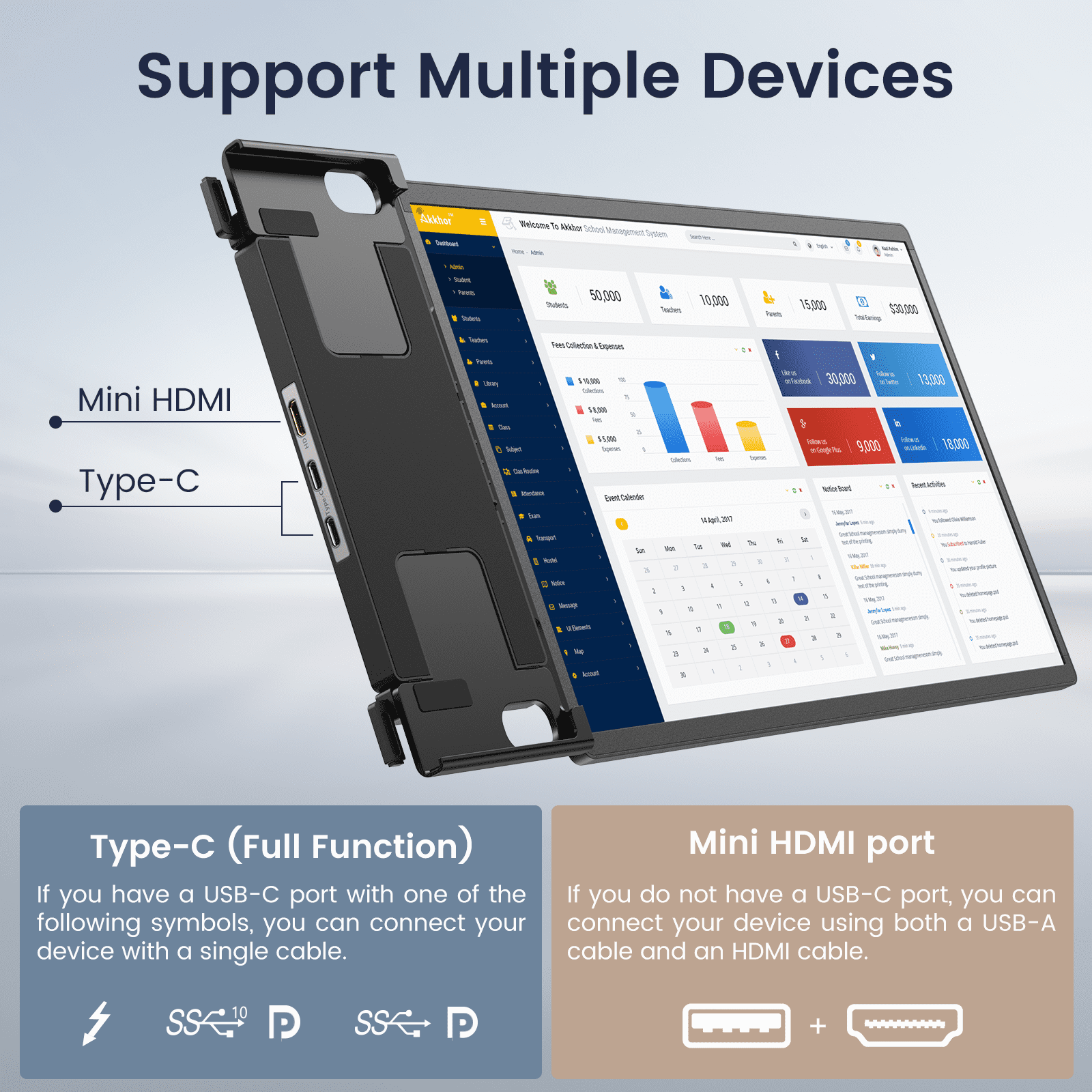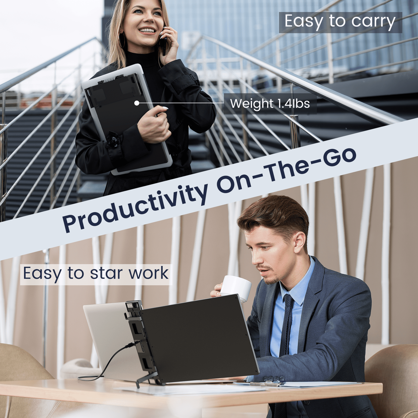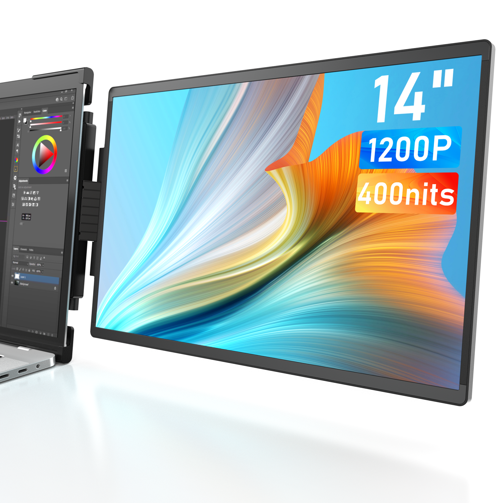 💙Patented Clip Design Revolutionize your workflow with this innovative second screen for laptop, featuring a patented clip design. Universally compatible with 13.3 – 16″ laptops(not fit surfacebook), it securely attaches without magnets, eliminating potential harm to your device. Enjoy effortless setup and flexibility without compromise – an accessory that enhances, not harms. Elevate productivity while safeguarding your tech investment. 🎀 Easy to Install: 1.Close the laptop and keep it about 30 degrees 2.Pull the back panel ring of the monitor, and attach the monitor to the laptop. 3.Open the laptop and push the back panel to left. 4.Adjust the back panel kickstand. 5.Connect the cable. ⚙️ Specification & Parameters: Screen Size:14-Inch Resolution:1920*1200P Frame Material:Aluminum Alloy Body Color:Black Brightness:400cd/m2 Color Gamut:100% sRGB Color D & A:8 Bits,▲E<2 Refresh Rate:60 Hertz Response Time:5ms Panel Type:LED Backlight, Matte Screen Bezel:4mm Aspect Ratio:1500:1 Dynamic Contrast Ratio:4500:1 Aspect Ratio:16:10 Screen-to-body Ratio:92% 🎁 Package List: 14" Laptop Extended Monitor 1*USB-C Cables 1*USB-A to USB-C Cables HDMI to Mini HDMI Cables Cables Storage Tape Charger Carrying Case