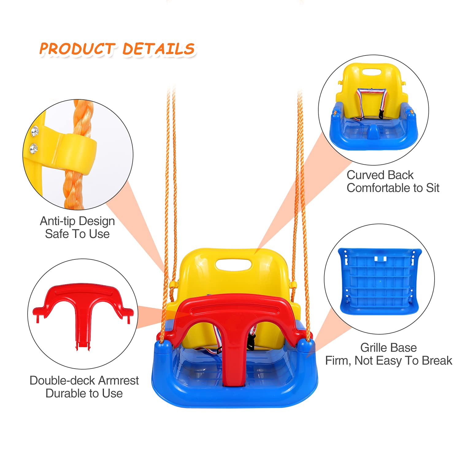 【Heavy-Duty Material】Constructed of environmental PP plastic and sturdy nylon rope, the toddler swing has heavy-duty, solid, durable and long-lasting characteristics. It can hold the weight up to 440lbs/200kg. 【4-In-1 Design】Our kids swing seat adopts the combination of 4-in-1 design with detachable backrest, T-shaped handrail and dinner-plate armrest. It meets enough demand for your kids’ growth. You can decide whether to use them according to kids’ ages. 【Adjustable Height】The outdoor baby swing is finished with length control hinges to make the rope can be adjusted from 43.3in./110cm to 82.6in./210cm. You can adjust it according to your needs. This will save your a lots of troubles to find a suitable place to install. 【Safe & Sturdy】Grids seat base and 4 nylon ropes make the swing sturdy and strong. Backrest with a safety belt, T-shaped handrail and dinner-plate armrest can keep kids in right position and ensure safety. Anti-tip buckles for nylon rope protect the swing from tipping. 【Easy to Install】The 4-in-1 swing seat is suitable for infant, toddler, kids, teens and even adult. It’s ideal for the garden, yard, home, playground etc. It’s easy to install, and you can hang it on the tree branch or attach it to a swing set.