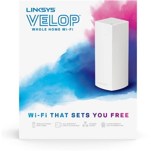Linksys Velop AC2200 Whole Home WiFi, 1-Pack: Home-Friendly Design: Beautifully designed with hidden connections and a footprint that is 88 percent smaller than traditional routers Simple App-led Setup: Intuitively easy setup with the Linksys App Dynamic Tri-Band Whole Home WiFi: Tri-Band technology dynamically changes to ensure and deliver blazing fast, seamless WiFi to all devices One Network with 100 Percent Seamless WiFi: Runs on 1 WiFi mesh network to deliver a 100 percent full-strength signal without interruption 3-Year Warranty and 24/7 Consumer Care: 3-Year Warranty and 3 Years of Free Technical Support WiFi AC2200 (867Mbps + 867Mbps + 400Mbps) with MU-MIMO Beamforming for 2.4GHz and 5GHz bands Includes Ethernet cable, power adapter, quick start guide, printed documentation