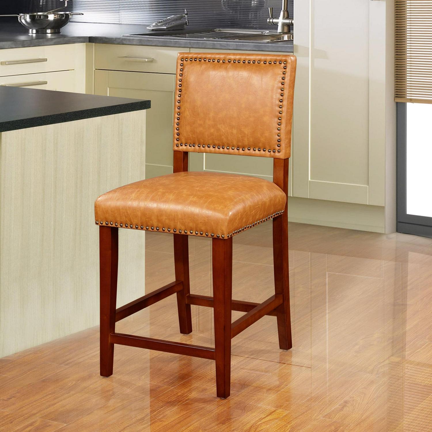 Create a contemporary or classical look in your kitchen, dining or home pub area with the sleek shape and style of this medium walnut finish 24″ Brook Counter Stool. Solid wood legs give this courtly stool additional strength ensuring years of everyday use. The padded cushion and seat back provides optimum comfort for you and your guests and is topped with durable caramel colored vinyl that is stain resistant, fade resistant and features tightly woven threads that won’t break, mat or peel. Classic nail head trim accents the stools lines. 275 pound weight limit. About Linon Home DecorLinon Home Decor is a family-owned-and-operated company based on the East Coast that has been in business for over 50 years. With an established reputation in the market for providing the best on-trend products at the right price, Linon offers excellent quality, style and functional furnishings for every room in the home. Linon s domestic and international teams provide customers with the most reliable on-time delivery and customer service possible.
