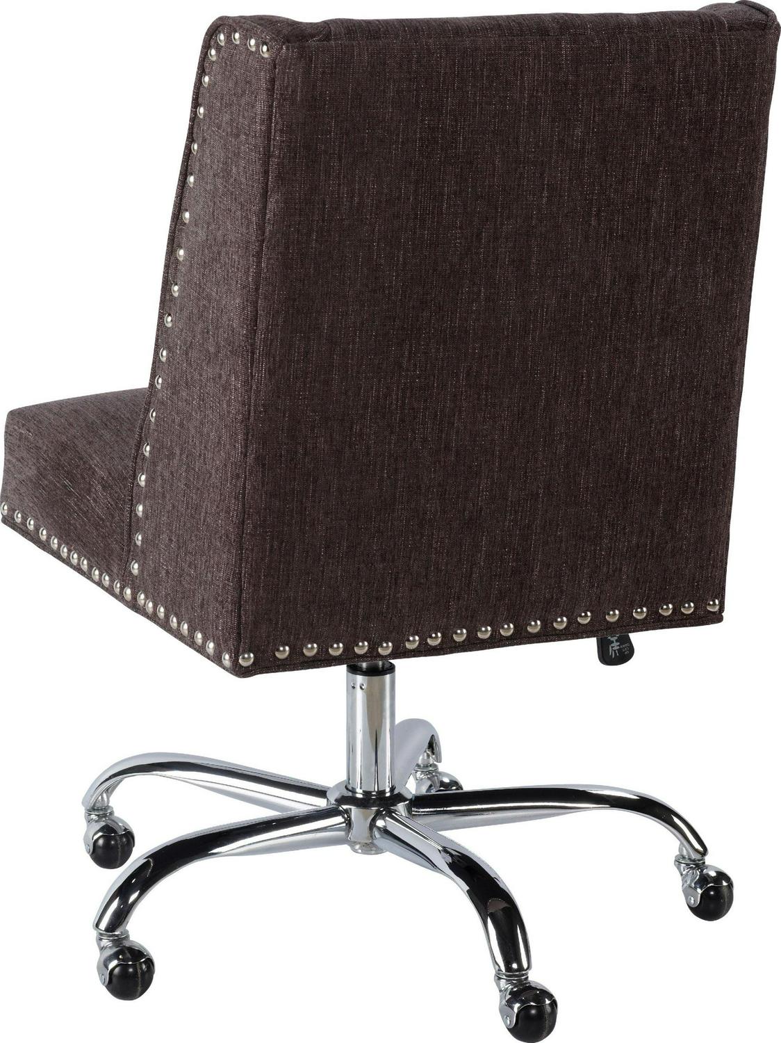 Add style and function to your office with the Draper Office Chair. The soft, plush frame is upholstered in a charcoal fabric and features a square back. Silver nailheads accent the chair. A chrome base has metal casters for ease of mobility. Perfect for a home work space or the office.