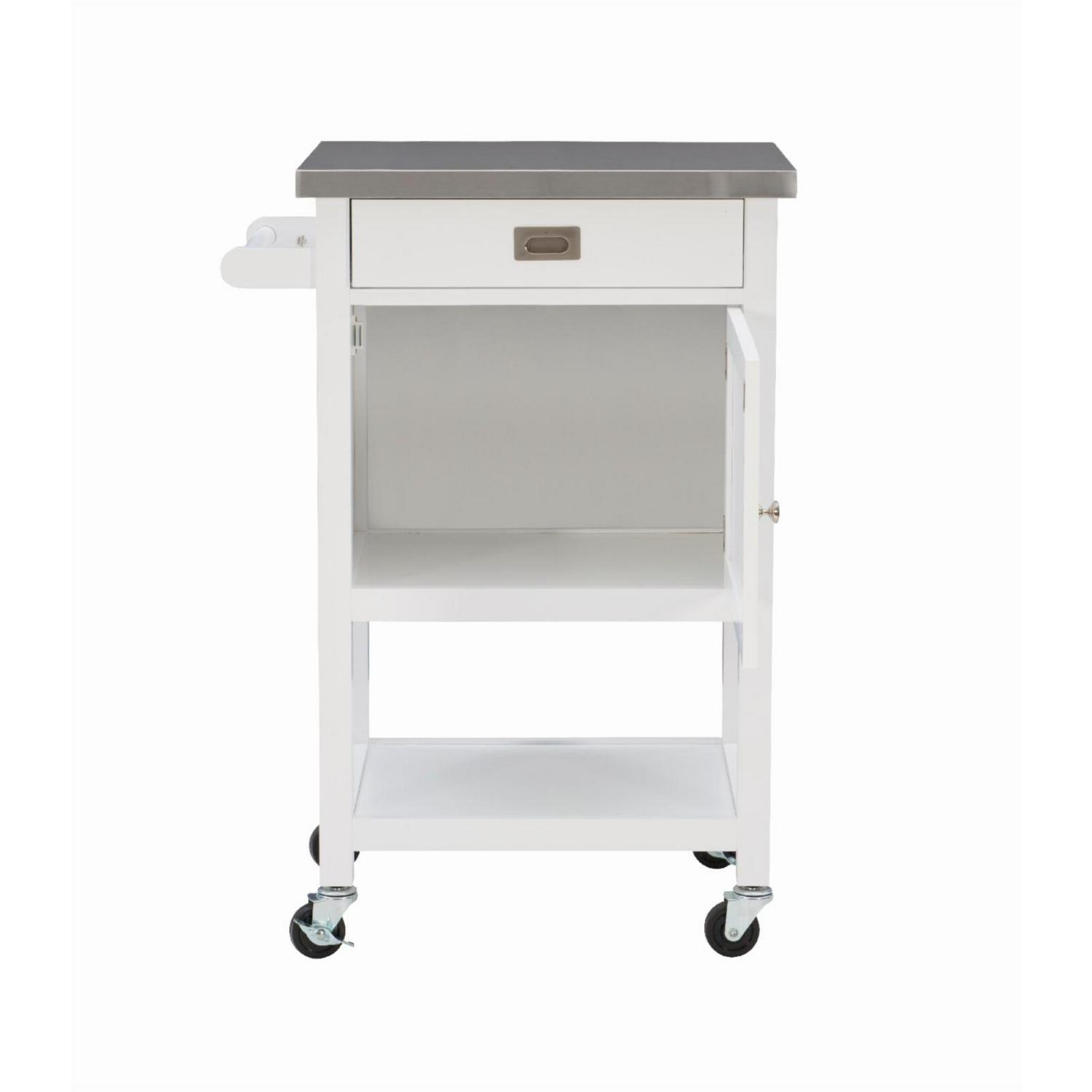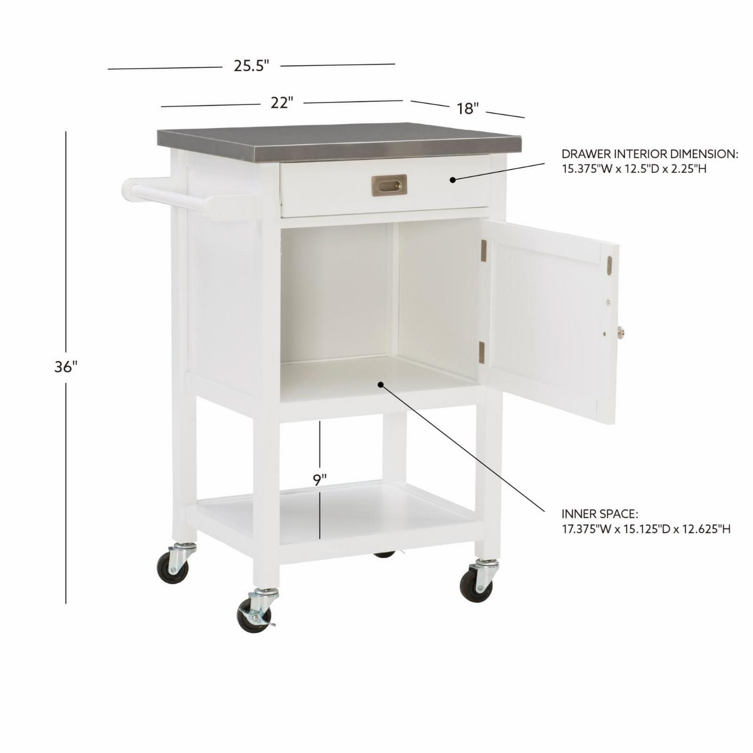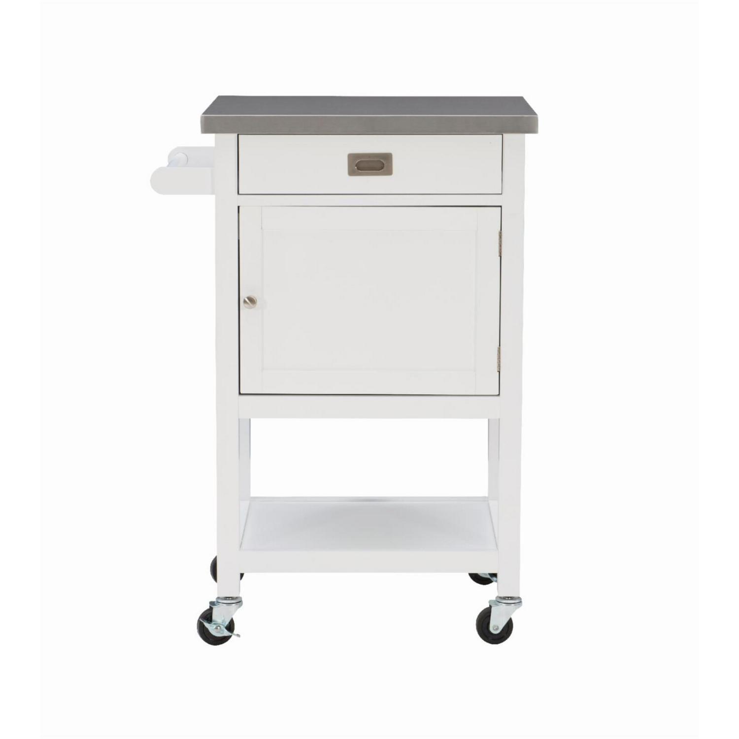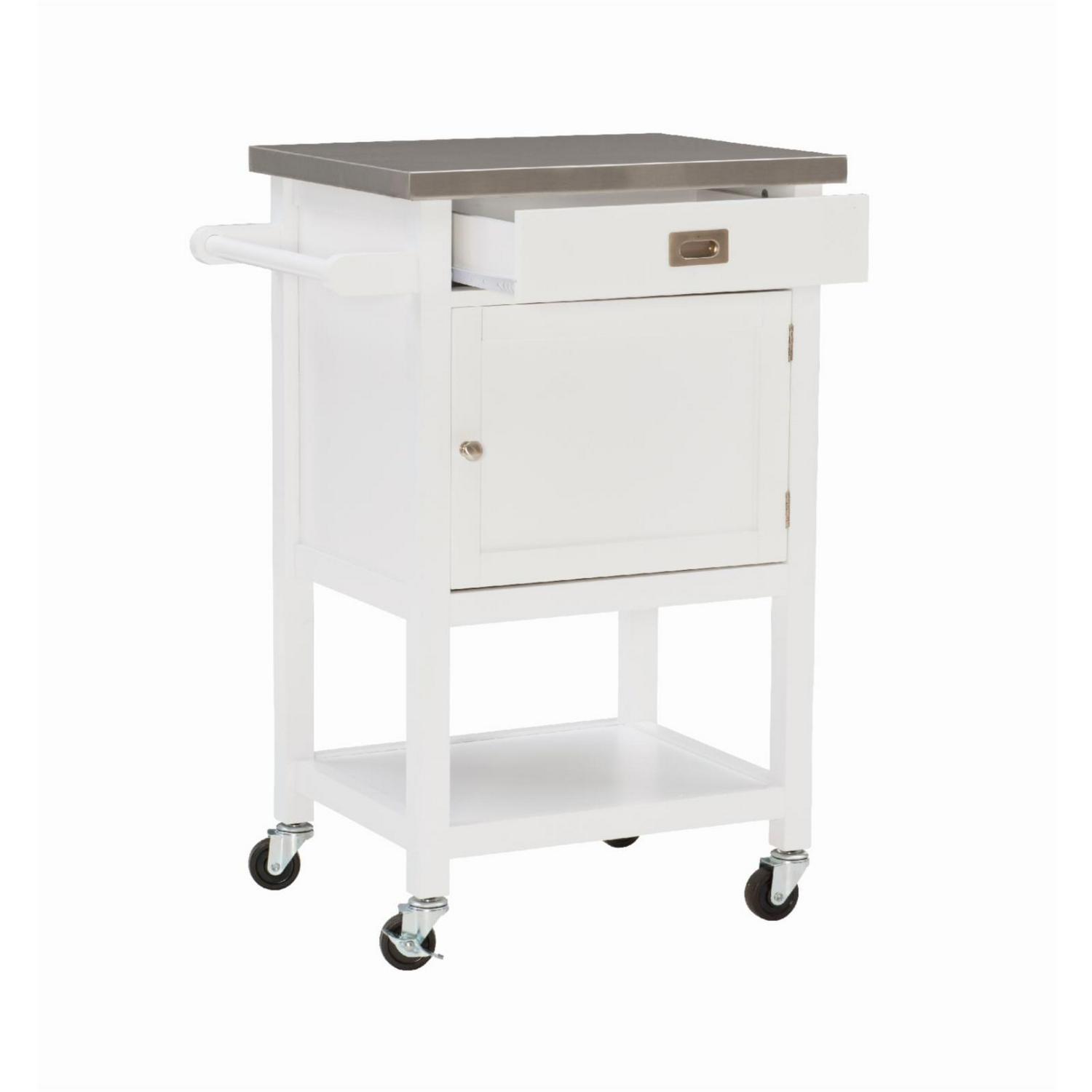 Add valuable storage to any setting with this mobile cart. Perfect for entertaining, it also enhances a kitchen, office, bathroom or living area. The top drawer and enclosed cabinet provide hidden storage, while the food safe, easy to clean stainless steel workspace holds a coffee maker or compact microwave. You can display linens on the towel bar and dinnerware on the bottom shelf. Clean lines, a white finish and stainless accents complement any decor. Smooth rolling, locking casters make moving and securing the cart simple.