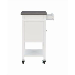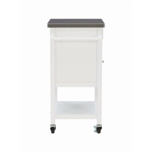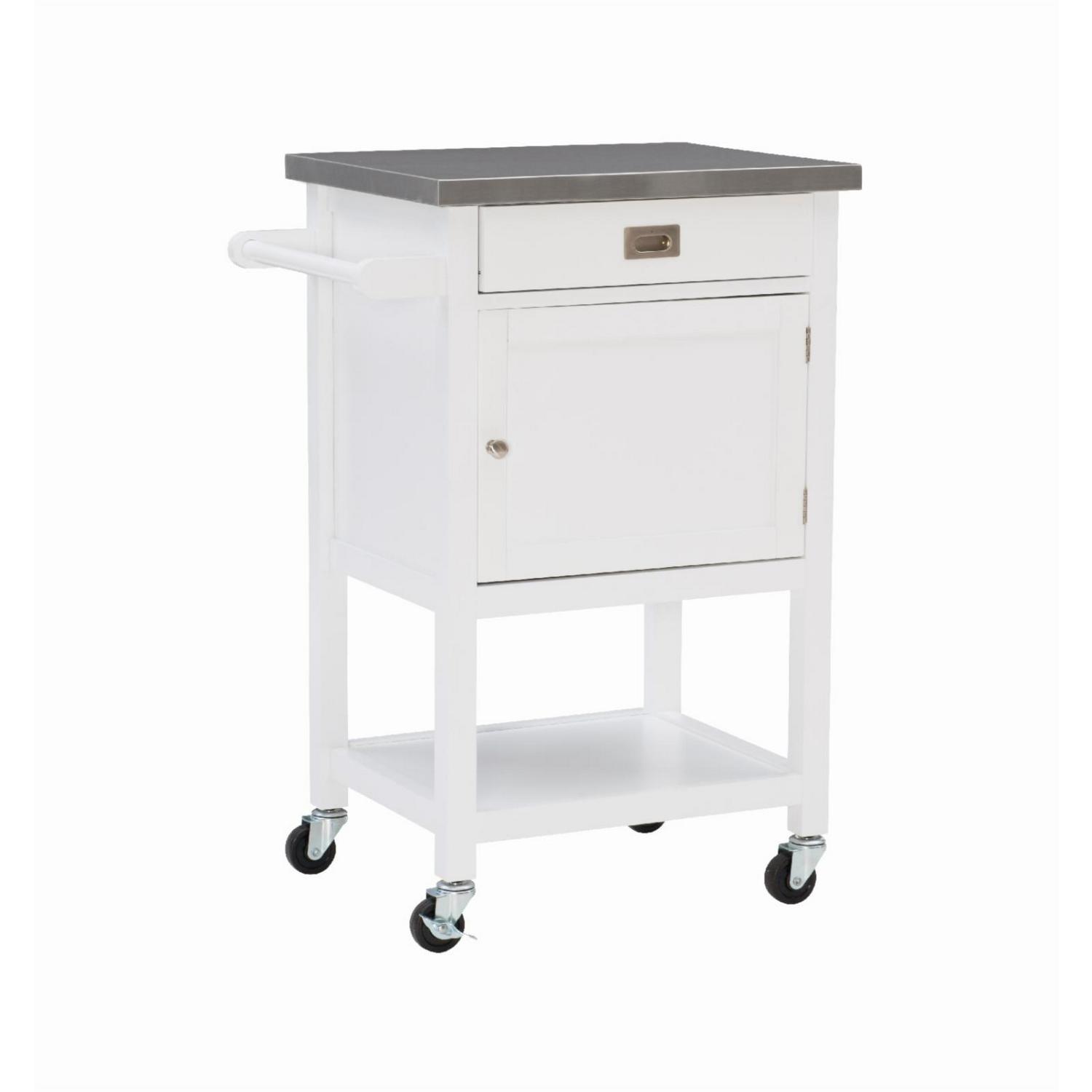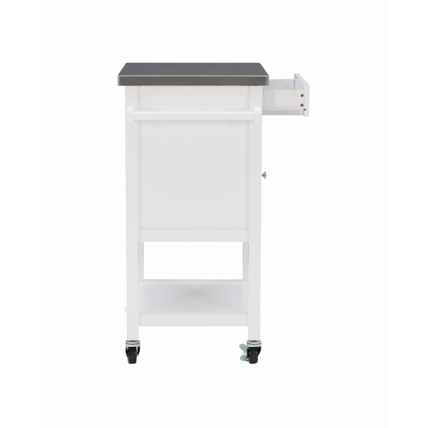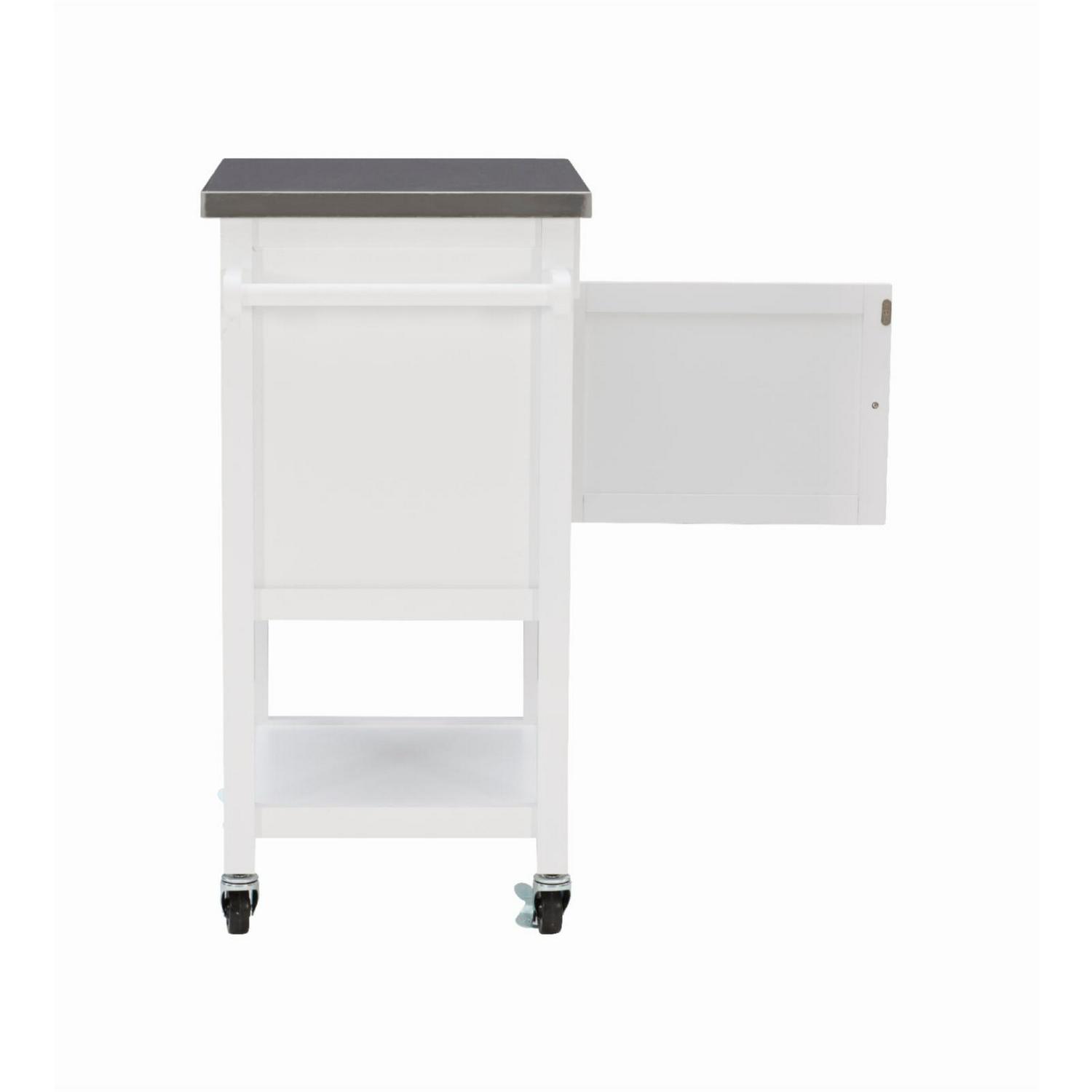 Add valuable storage to any setting with this mobile cart. Perfect for entertaining, it also enhances a kitchen, office, bathroom or living area. The top drawer and enclosed cabinet provide hidden storage, while the food safe, easy to clean stainless steel workspace holds a coffee maker or compact microwave. You can display linens on the towel bar and dinnerware on the bottom shelf. Clean lines, a white finish and stainless accents complement any decor. Smooth rolling, locking casters make moving and securing the cart simple.