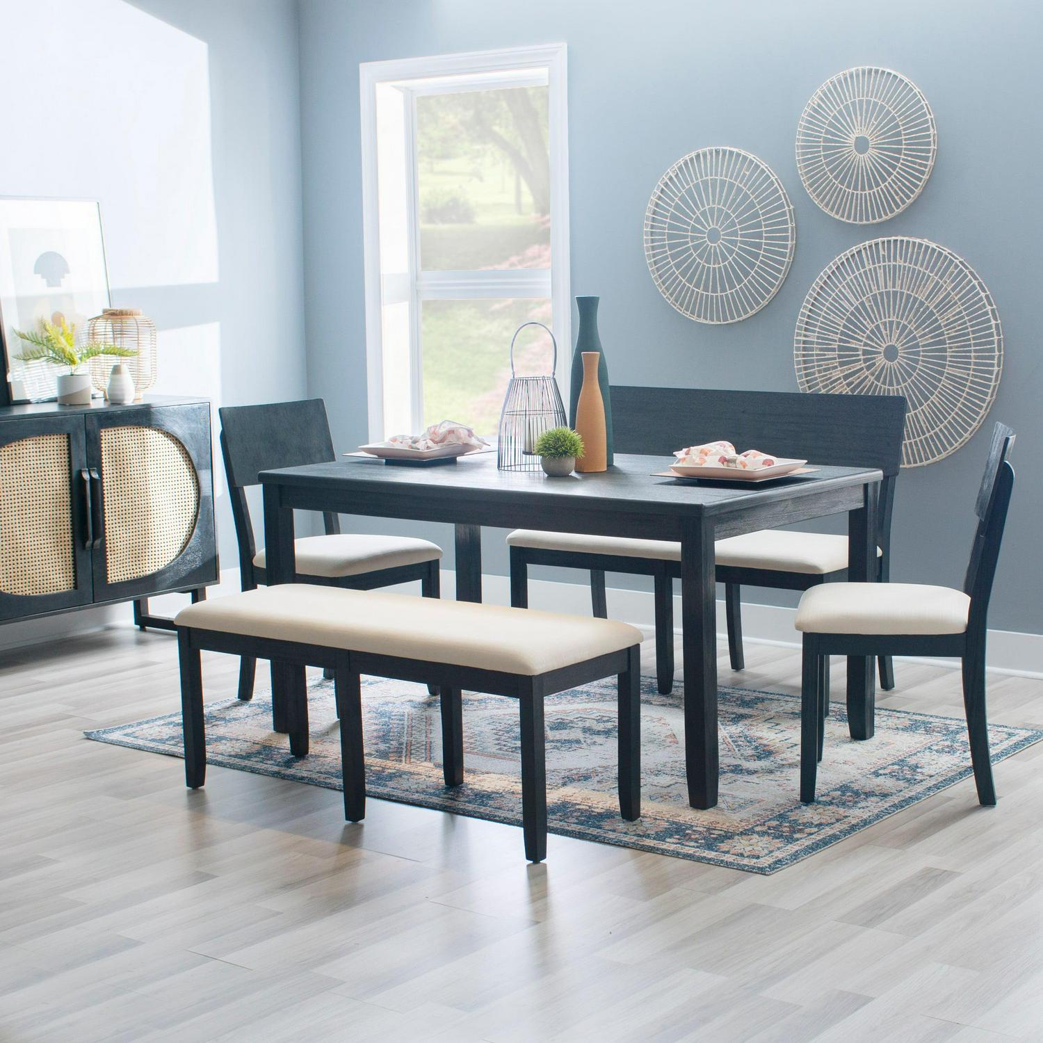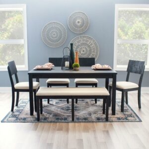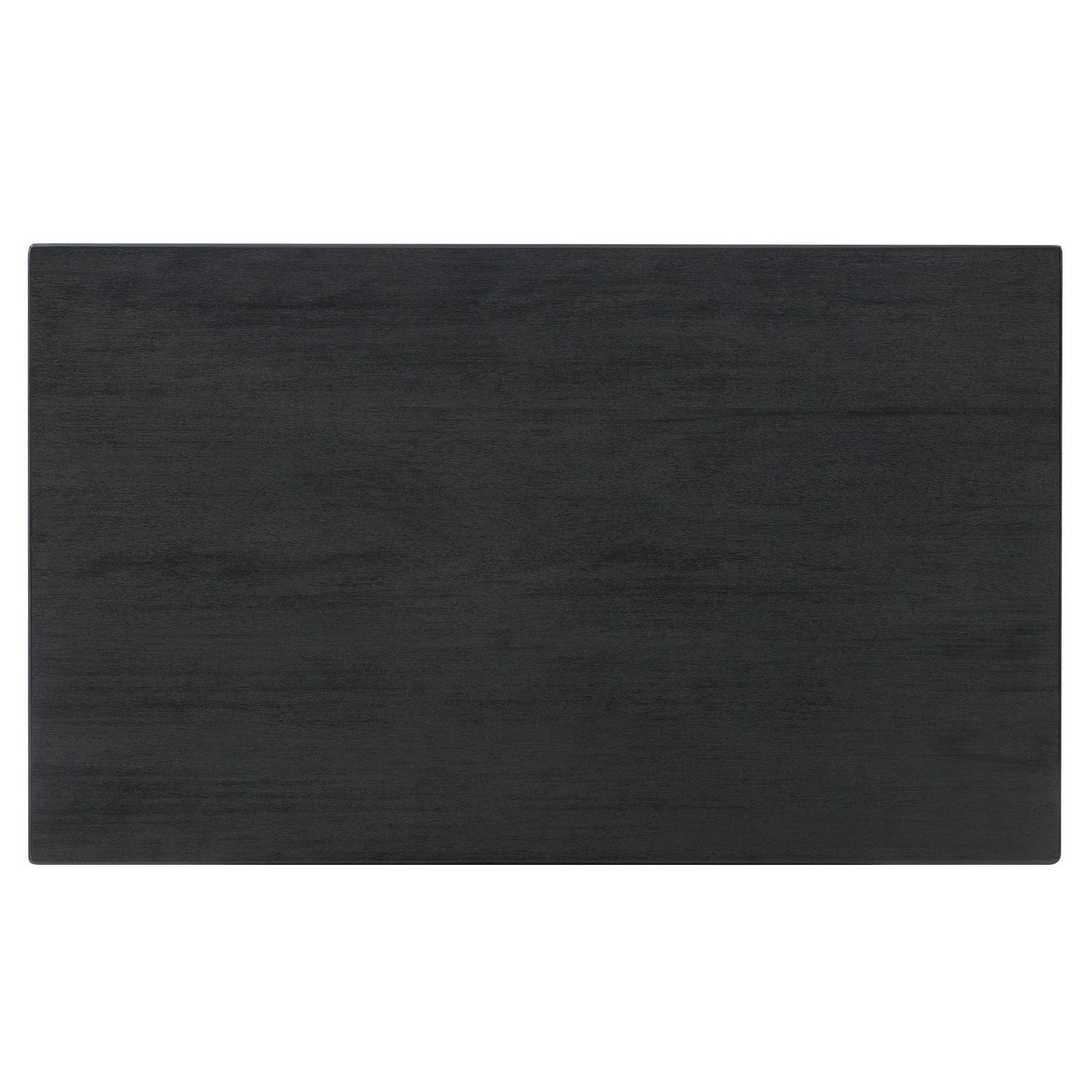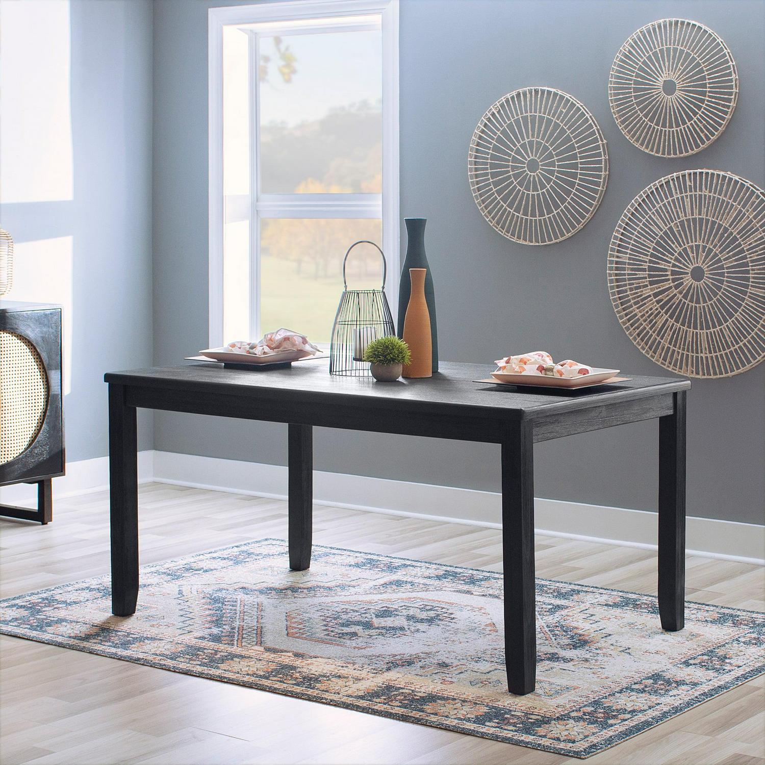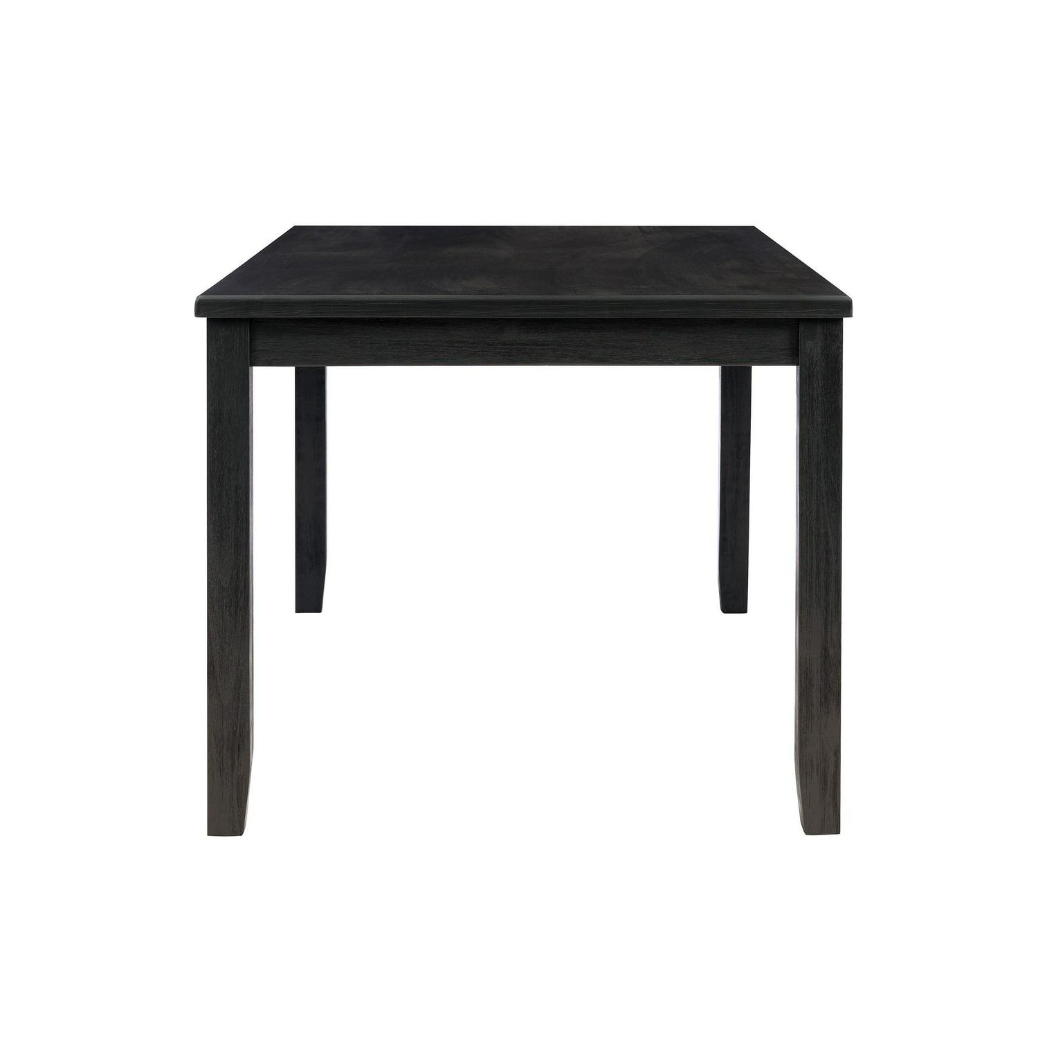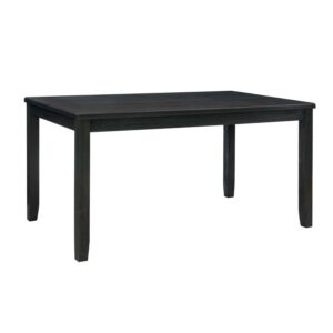 Understated yet refined, this modern farmhouse table is the perfect centerpiece for family gatherings and meals. The sturdy acacia wood frame is finished in dark charcoal black, lending itself to a rustic wire brushed texture with traces of the wood grain peering through. Measuring 36 x 60 , the tabletop offers ample space for 6 to sit comfortably. Make it a complete set with the matching dining bench and side chairs for an ensemble that will charm guests and family for years.