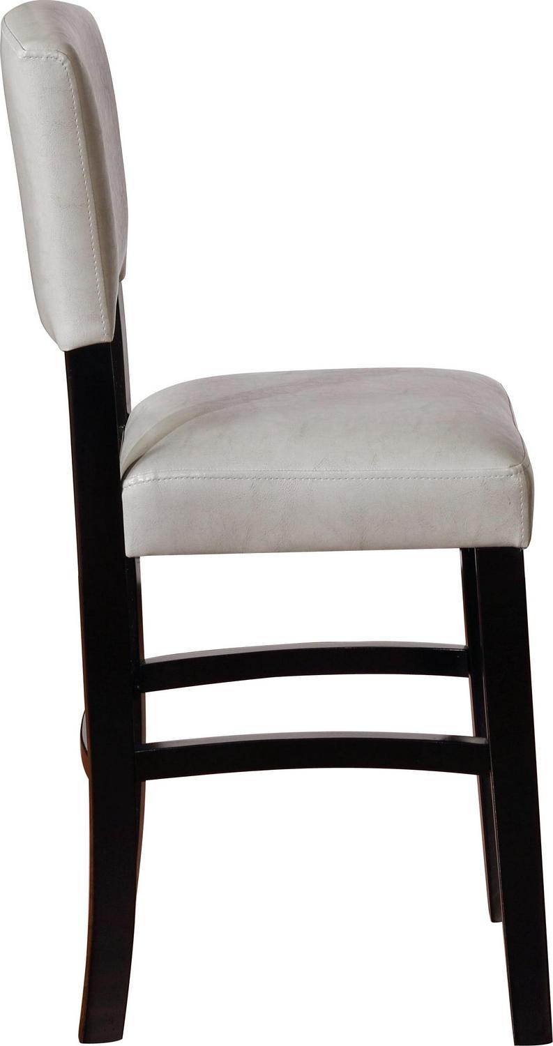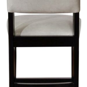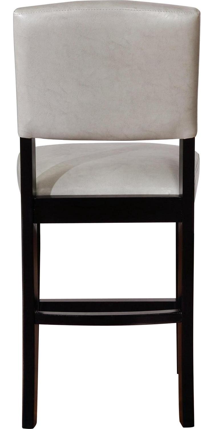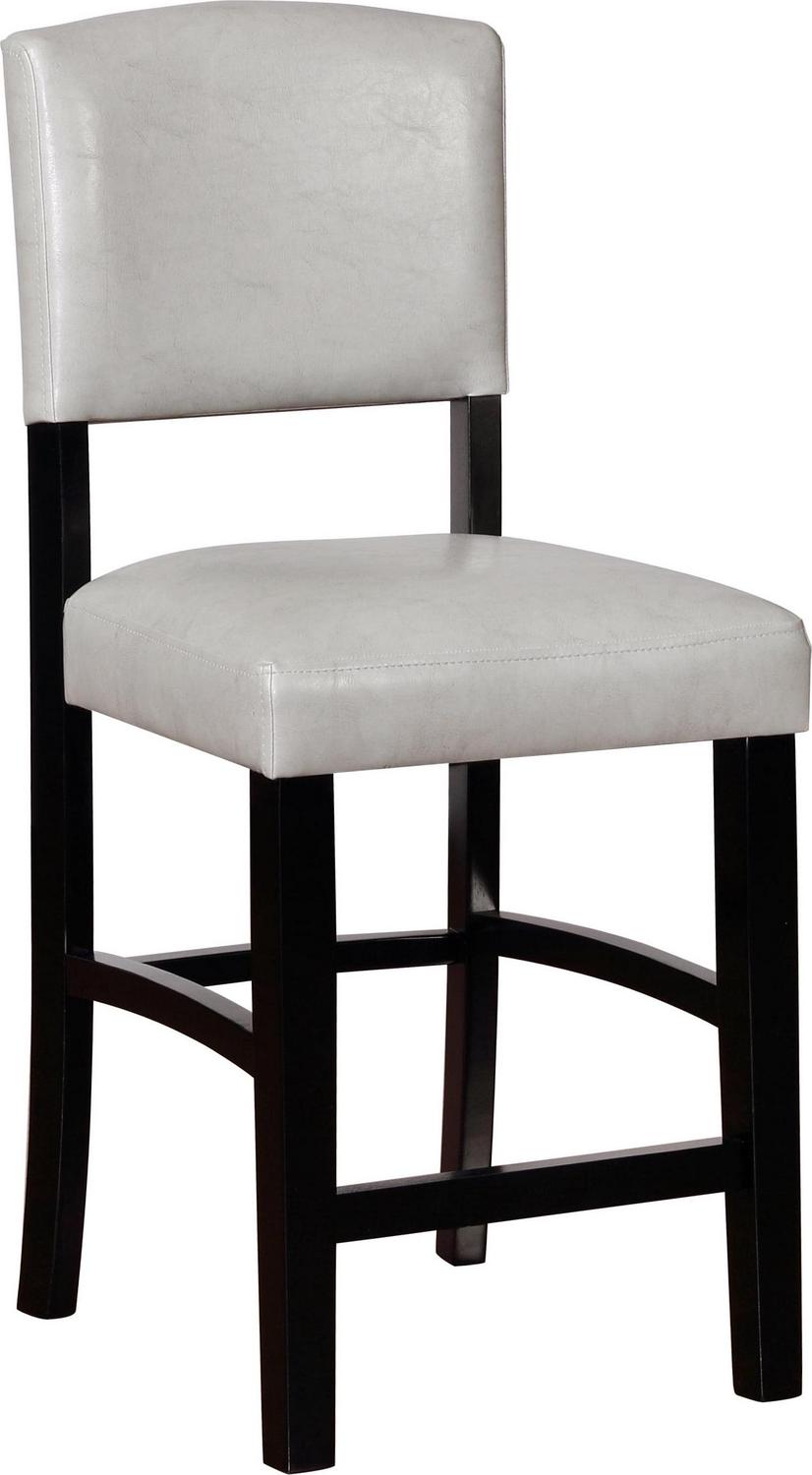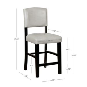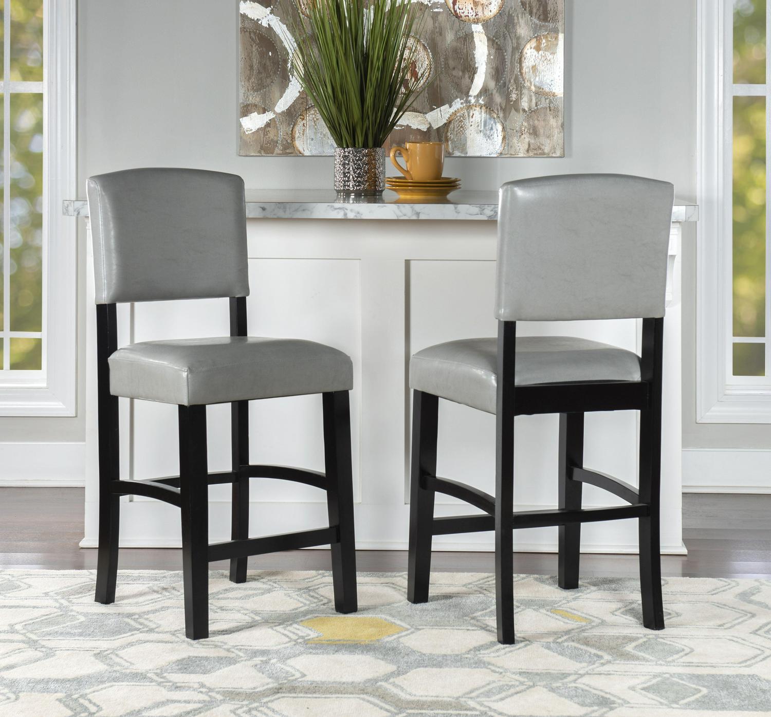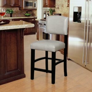 Gather around your kitchen counter for meals and conversation with these classic, elegant counter stools. Extra comfortable with padded seats and backrests in easy to care for, wipe clean dove gray faux leather. The black solid wood frame is durable, and the footrests provide comfort and stability. This stool’s timeless design is best suited for enjoying a casual at a kitchen counter or pub table 35″ to 39″ high. Stool Dimensions: 18″ W x 19.5″ D x 39.25″ H. Item Weight: 22.05 lbs. For indoor use only.