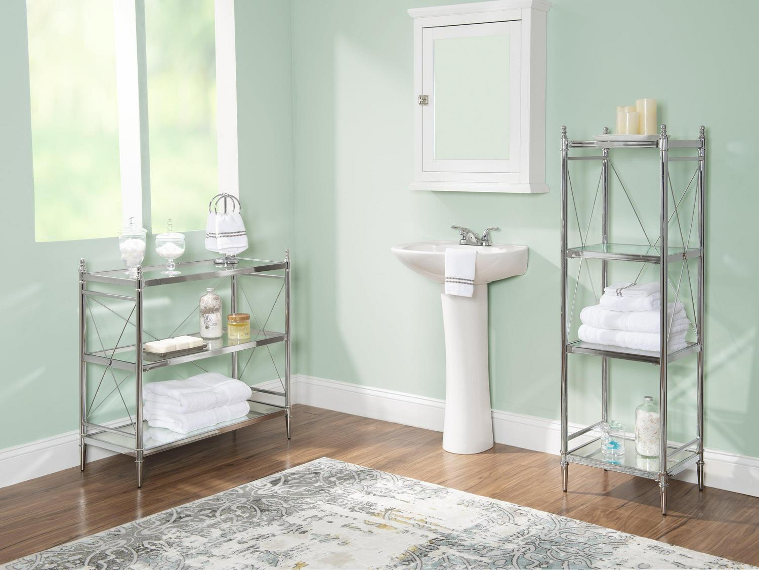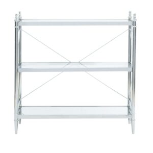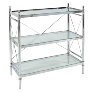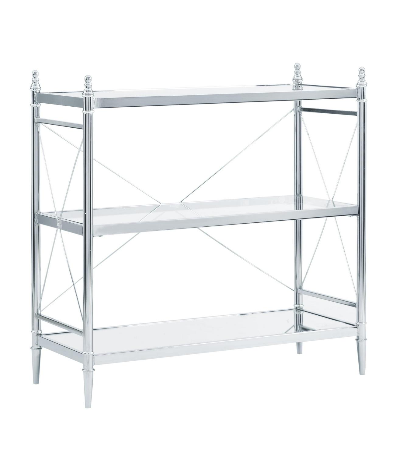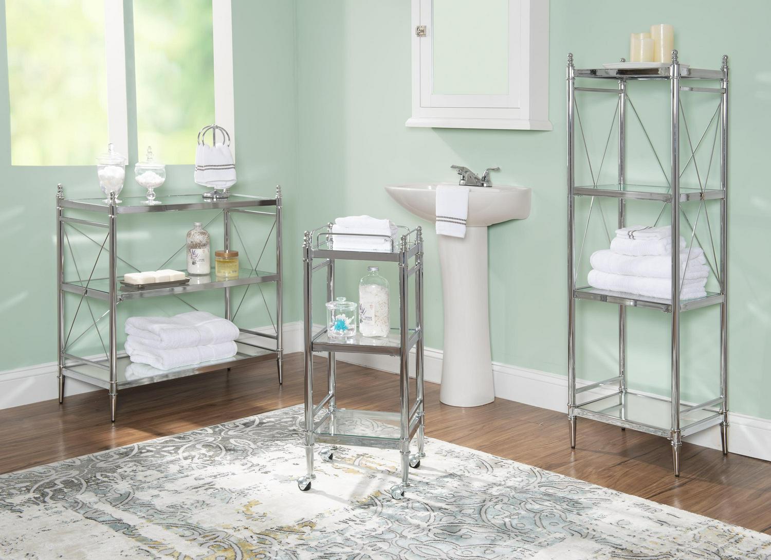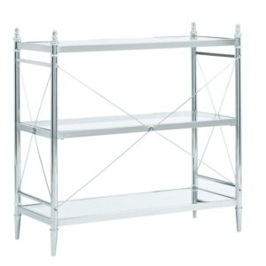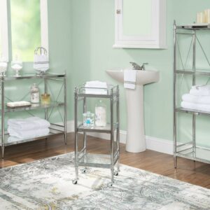 The Linon Pinnacle Chrome and Glass Floor Console piece adds a touch of modern yet elegant, industrial style to your space. The mirrored chrome metal finish gives off a hint of elegance. The three tiered shelves help keep your bathroom feeling spa like and organized. The X-framed design on the back and sides of the cabinet give it that modern feel. This console is ideal for master or guest bathrooms.