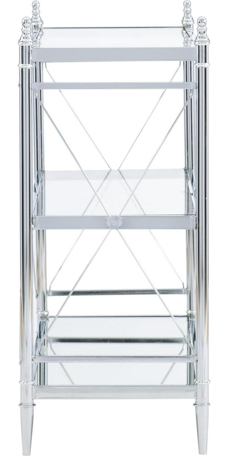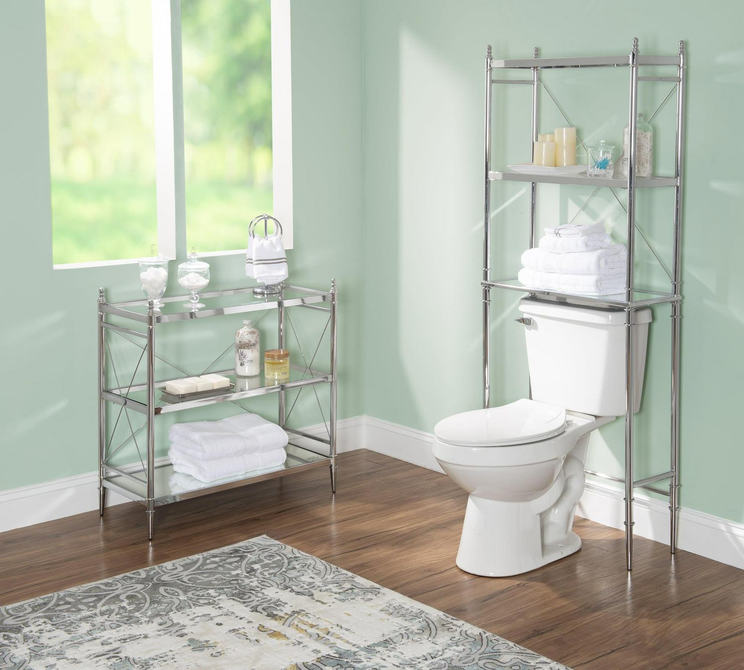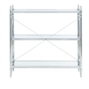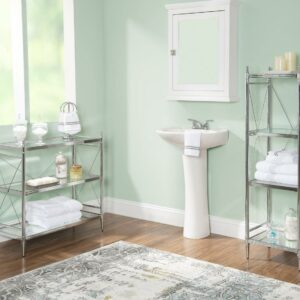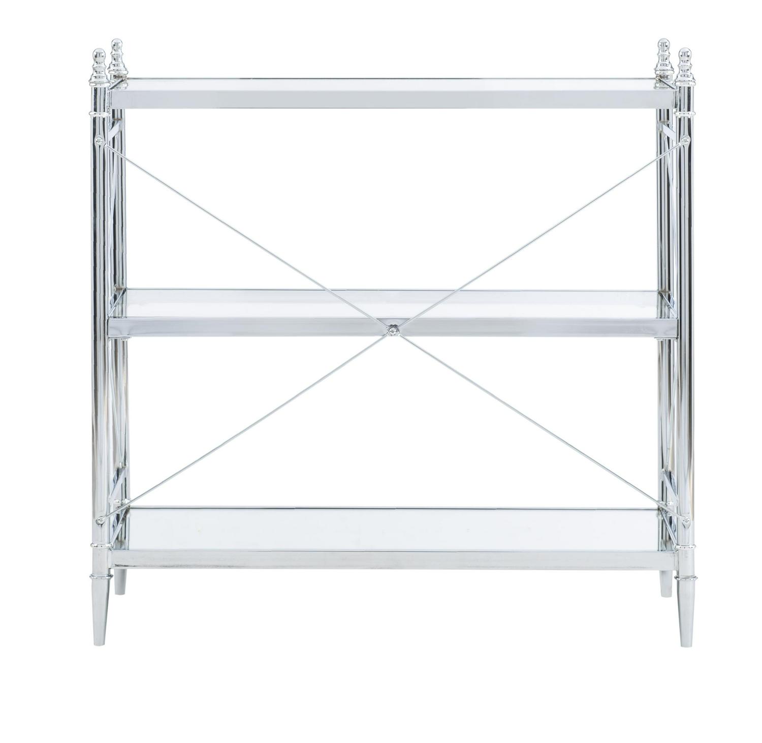 The Linon Pinnacle Chrome and Glass Floor Console piece adds a touch of modern yet elegant, industrial style to your space. The mirrored chrome metal finish gives off a hint of elegance. The three tiered shelves help keep your bathroom feeling spa like and organized. The X-framed design on the back and sides of the cabinet give it that modern feel. This console is ideal for master or guest bathrooms.