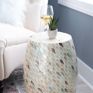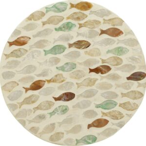 Add a splash of color to your home with this alluring mother of pearl Accent Side Table. Featuring a mosaic of shimmering blue, green, and brown fish on an ivory background, this tapered pedestal will enhance your furniture with its unique ocean theme design. This versatile accent piece is a great living room end or side table, bedroom nightstand, bathroom pedestal, or outdoor patio table. From coastal to the farmhouse to contemporary, this exquisite stand will complement any decor. Table Dimensions: 13.75″ W x 13.75″ D x 19.75″ H, 13.23 lbs.