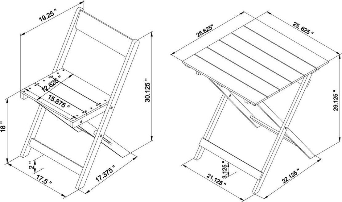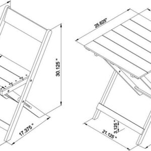 - Table: 25.59 x 25.59 x 29.13 Chair: 17.52 x 18.9 x 30.32