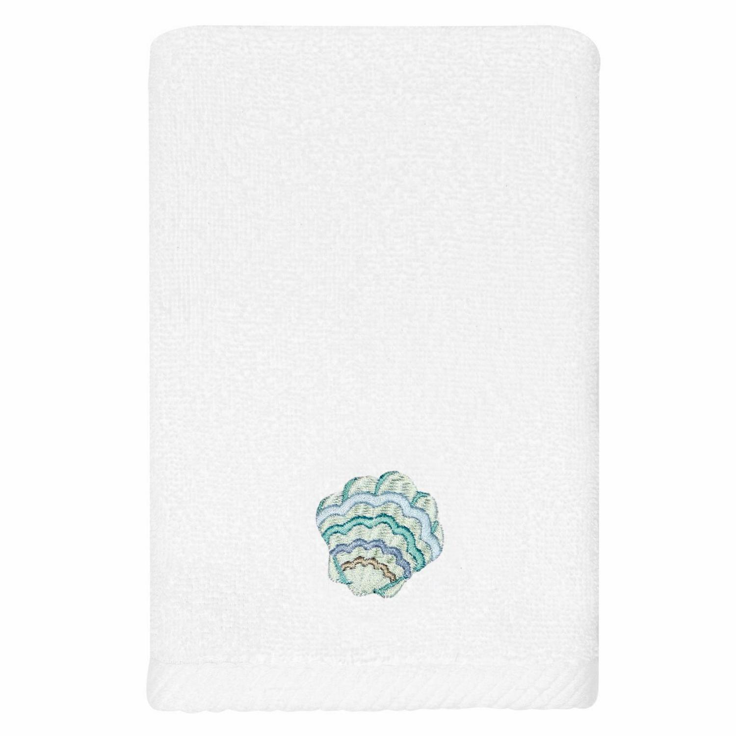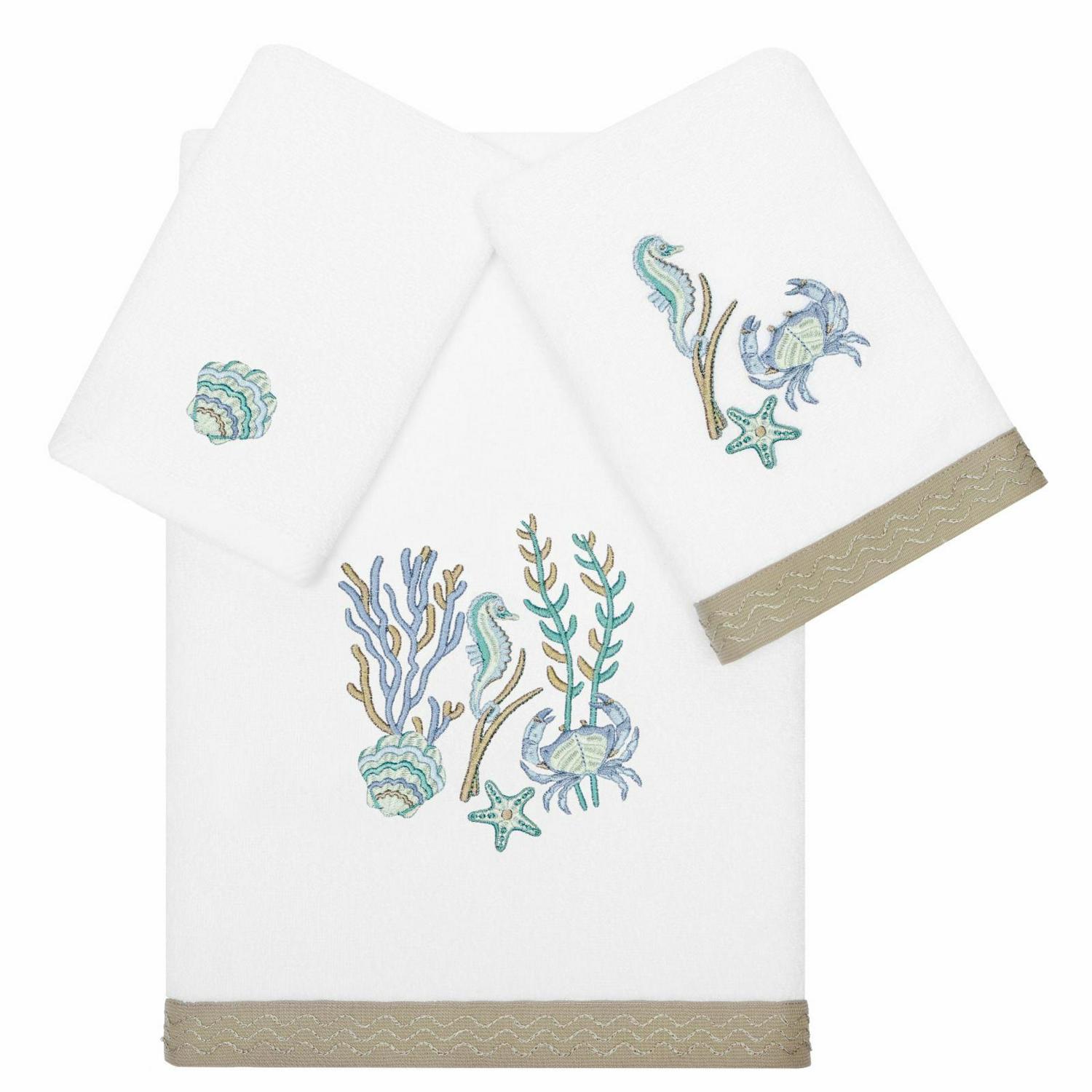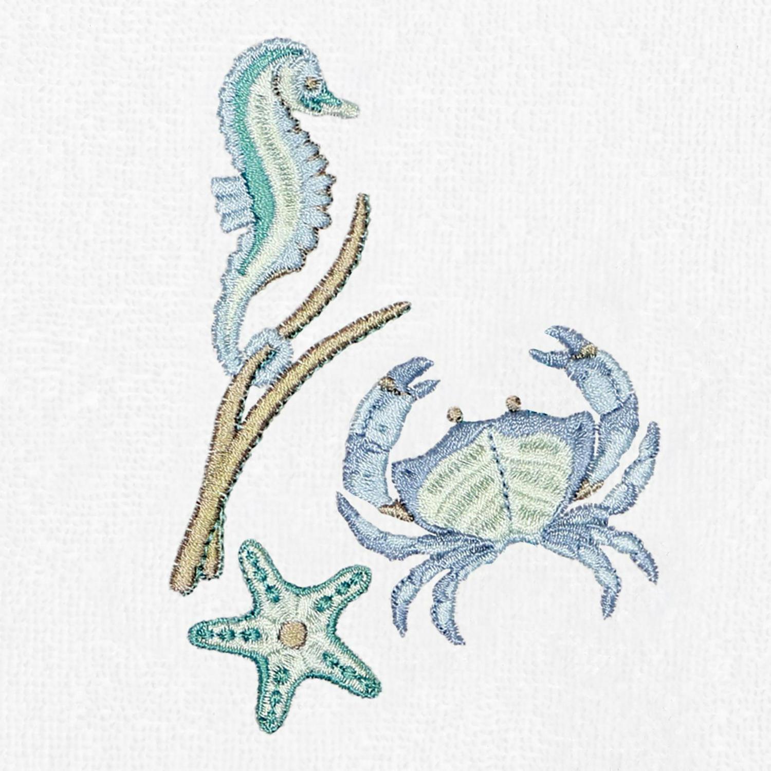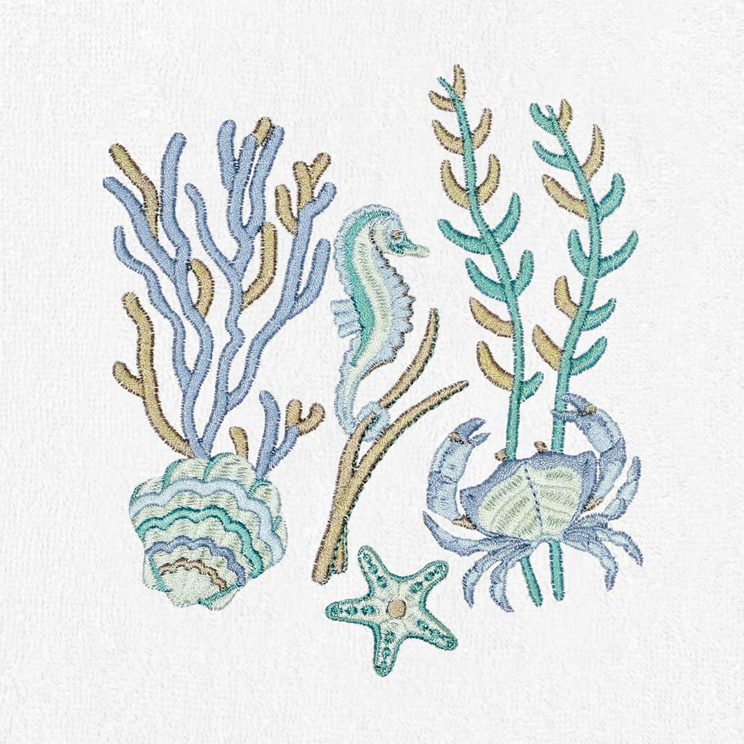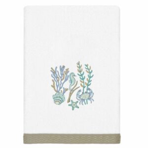 Your decorations are not complete without lively embroidered towels for the comfort of your family and guests. The Aaron towels feature colorful sea life and are trimmed with an embroidered canvas border. Cloud soft and super absorbent, these luxurious, durable towels keep their plush appearance after washing. This collection is available in 8 elegant colors: White, Beige, Blush, Aqua, Silver, Cocoa, Charcoal and Marine. The Aaron Towel Collection brings coastal spirit and richness to your home decor and makes a great gift! Note: Due to variations in computer screen resolutions, slight color differences may exist between images provided and actual product.