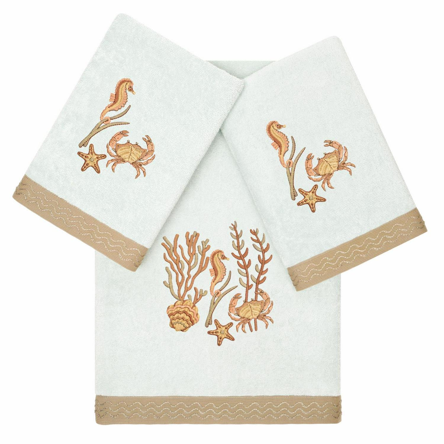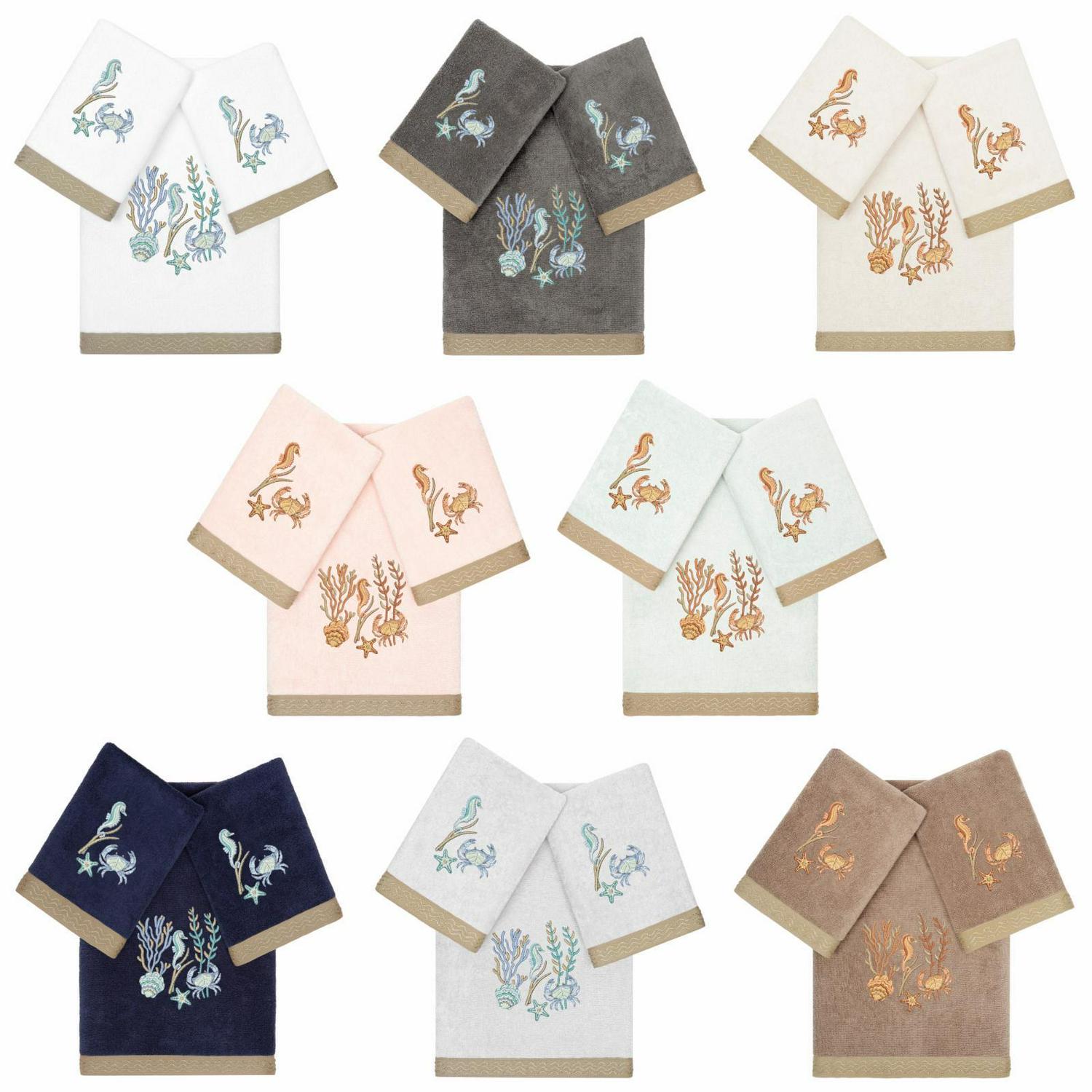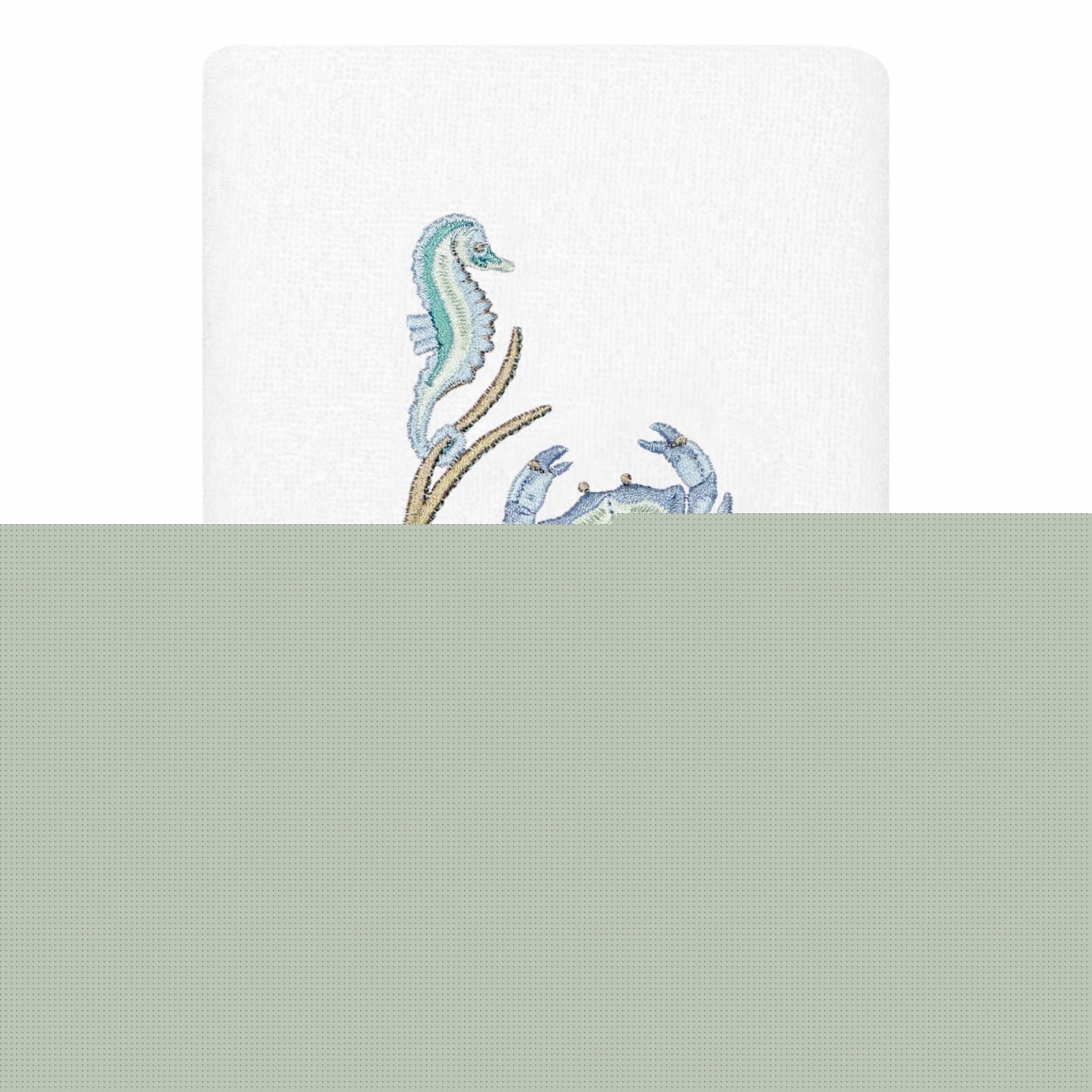 Your decorations are not complete without lively embroidered towels for the comfort of your family and guests. The Aaron towels feature colorful sea life and are trimmed with an embroidered canvas border. Cloud soft and super absorbent, these luxurious, durable towels keep their plush appearance after washing. This collection is available in 8 elegant colors: White, Beige, Blush, Aqua, Silver, Cocoa, Charcoal and Marine. The Aaron Towel Collection brings coastal spirit and richness to your home decor and makes a great gift! Note: Due to variations in computer screen resolutions, slight color differences may exist between images provided and actual product.