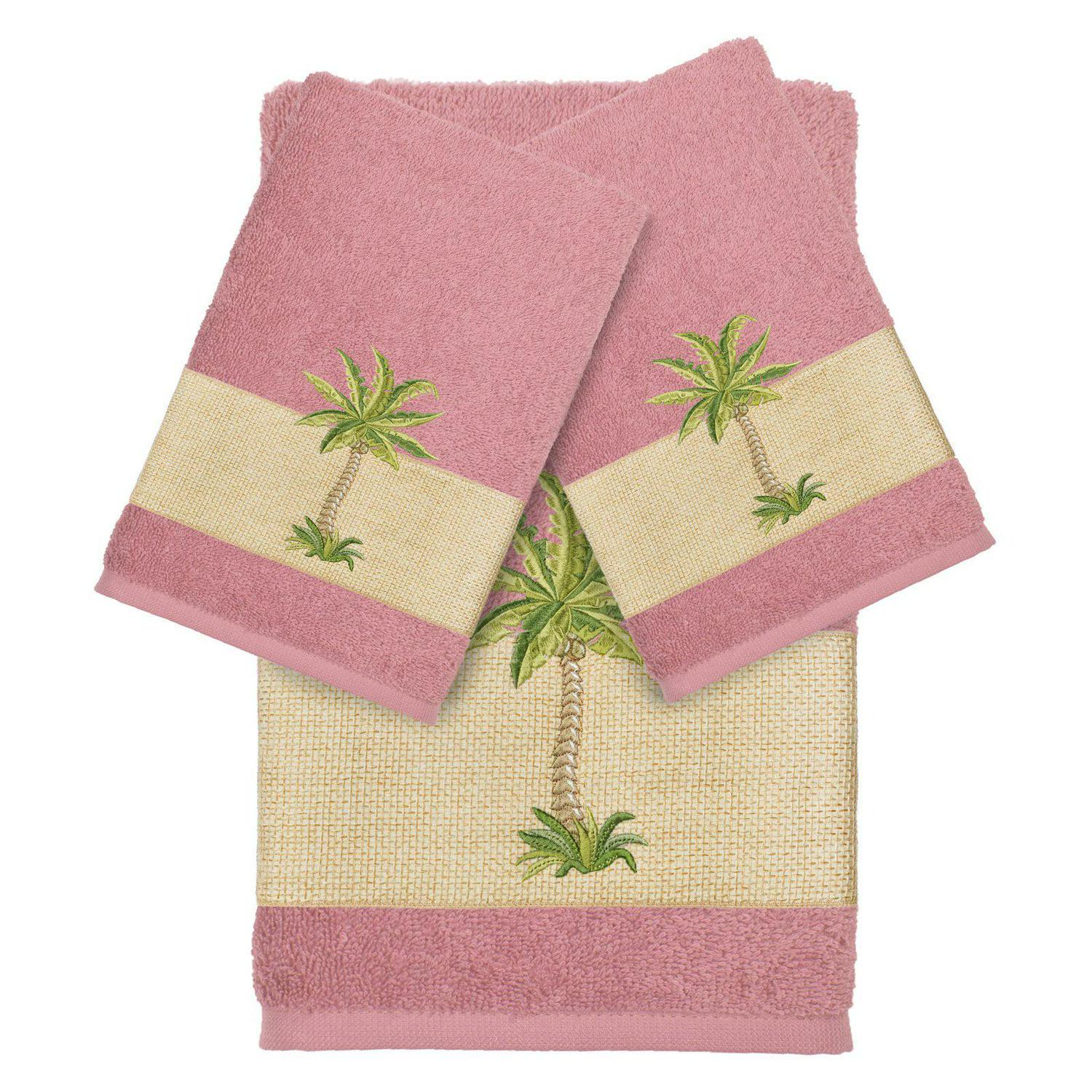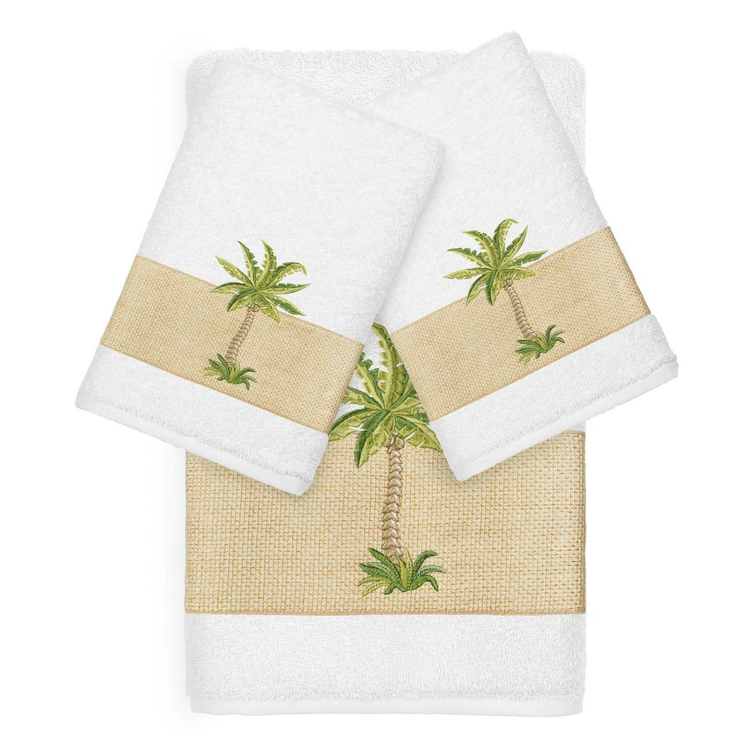 Deck out your bathroom in matching style with the Linum Home Textiles Colton Embellished Turkish Cotton Towel Set. Soft luxury features prominently with this set thanks to 100% Turkish cotton that absorbs water readily. Each piece features a palm tree motif embroidered over a contrast textured band to evoke sunny tropical days. These towels are produced in a green factory that runs on 100% solar energy.