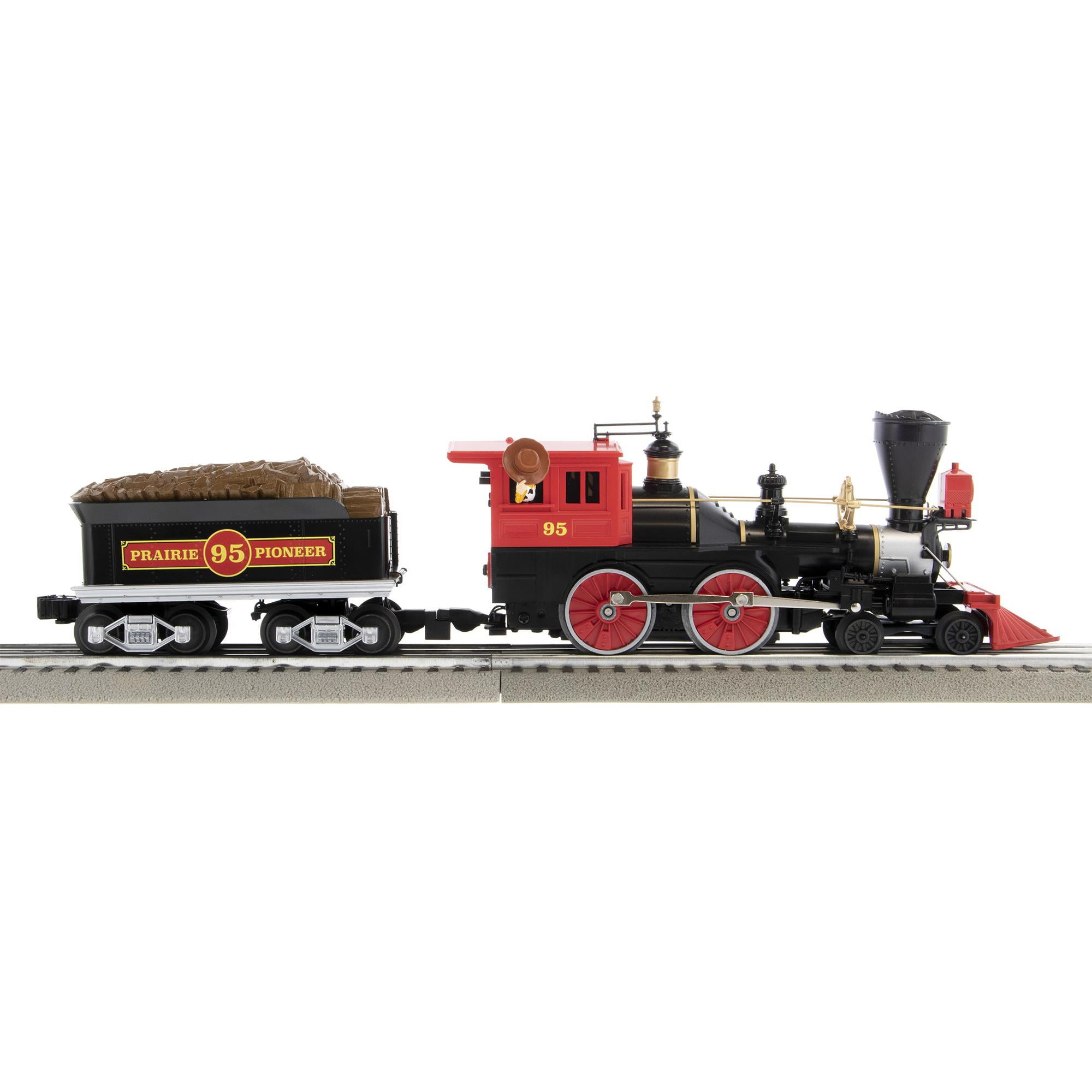 SET INCLUDES: Prairie Pioneer General Locomotive and Tender Buzz Lightyear Boxcar Woody’s Round-up Chasing Gondola Toy Story Caboose Eight O36 Curved FasTrack sections Two 10″ Straight FasTrack sections One Terminal FasTrack section One Plug-Expand-Play Power Lock-on section Wall-pack Power Supply LionChief Remote for Locomotive LOCOMOTIVE FEATURES: Electric locomotive controlled by included LionChief remote, LionChief Universal Remote (sold separately) or Bluetooth LionChief app On/Off switch for smoke and sound RailSounds RC Sound System with steam chuffing and background sounds, whistle, bell, and user-activated announcements Lionel Voice Control (LVC) runs your locomotive by speaking commands into your phone via LionChief App Operating headlight Powerful maintenance-free motor Operating couplers FREIGHT CARS FEATURE: Die-cast metal trucks Opening doors on boxcar Jessie chasing Bullseye around the gondola when the train is running Illuminated caboose LIONCHIEF REMOTE FEATURES: Forward and reverse speed control knob Three buttons to activate whistle, bell, and special announcements Requires three AAA alkaline batteries (not included) PRODUCT SPECIFICATIONS: Gauge: O Gauge Power: Electric Engine Type: Steam Min Curve: O31 Dimensions: Length: 47″ PRODUCT NOTIFICATIONS: Train Set requires (3) AAA Alkaline Batteries for operation Phillips screwdriver required to access battery compartment on remote control (not included) Lubricate the wheels, axles, and linkage regularly to avoid squeaks and wear Wipe with a soft cloth occasionally after use to keep track and wheels free from dirt and grease Remove all batteries when the train will not be used for an extended period of time Recommended for ages 8 and up Assembly is required