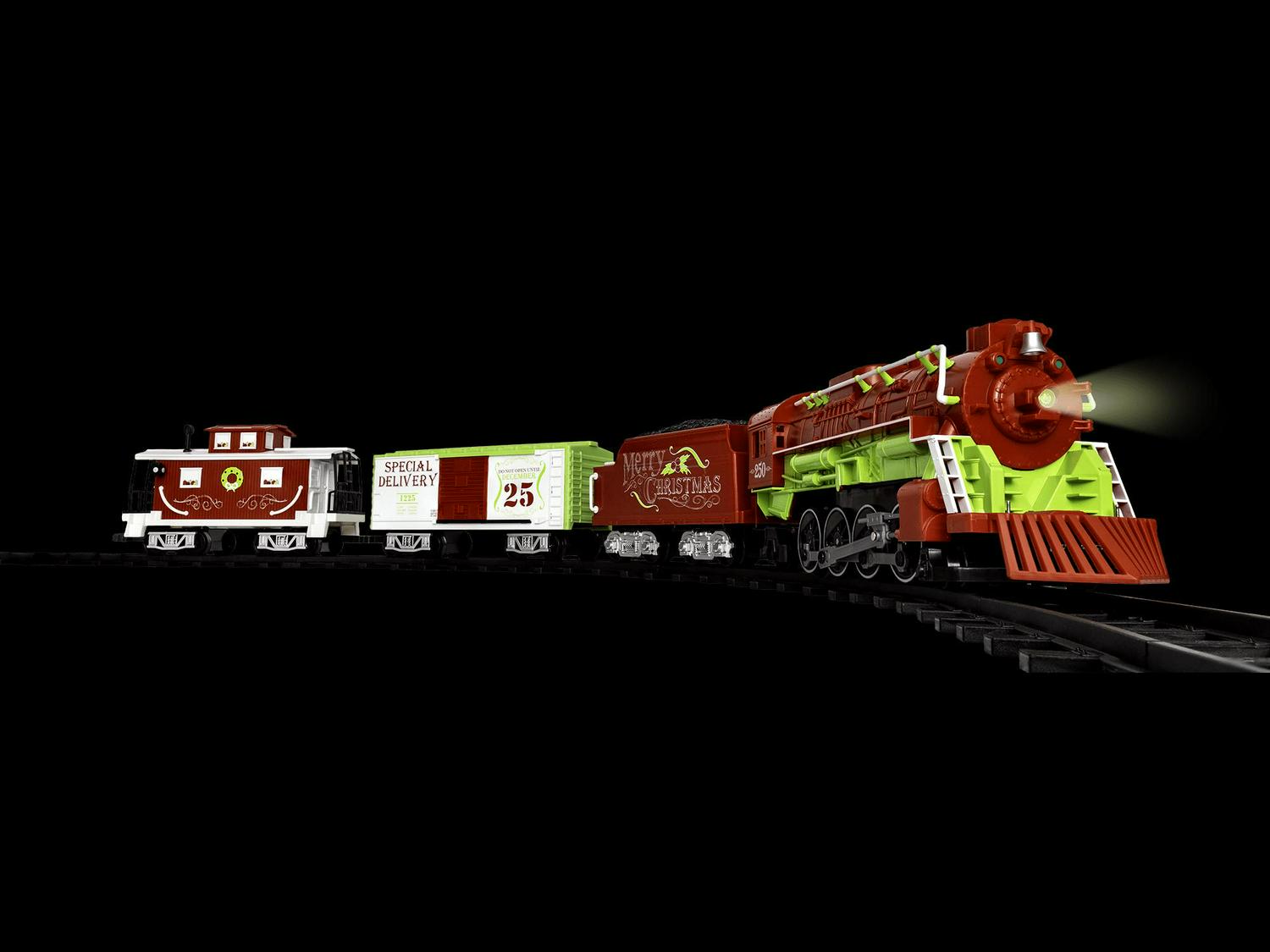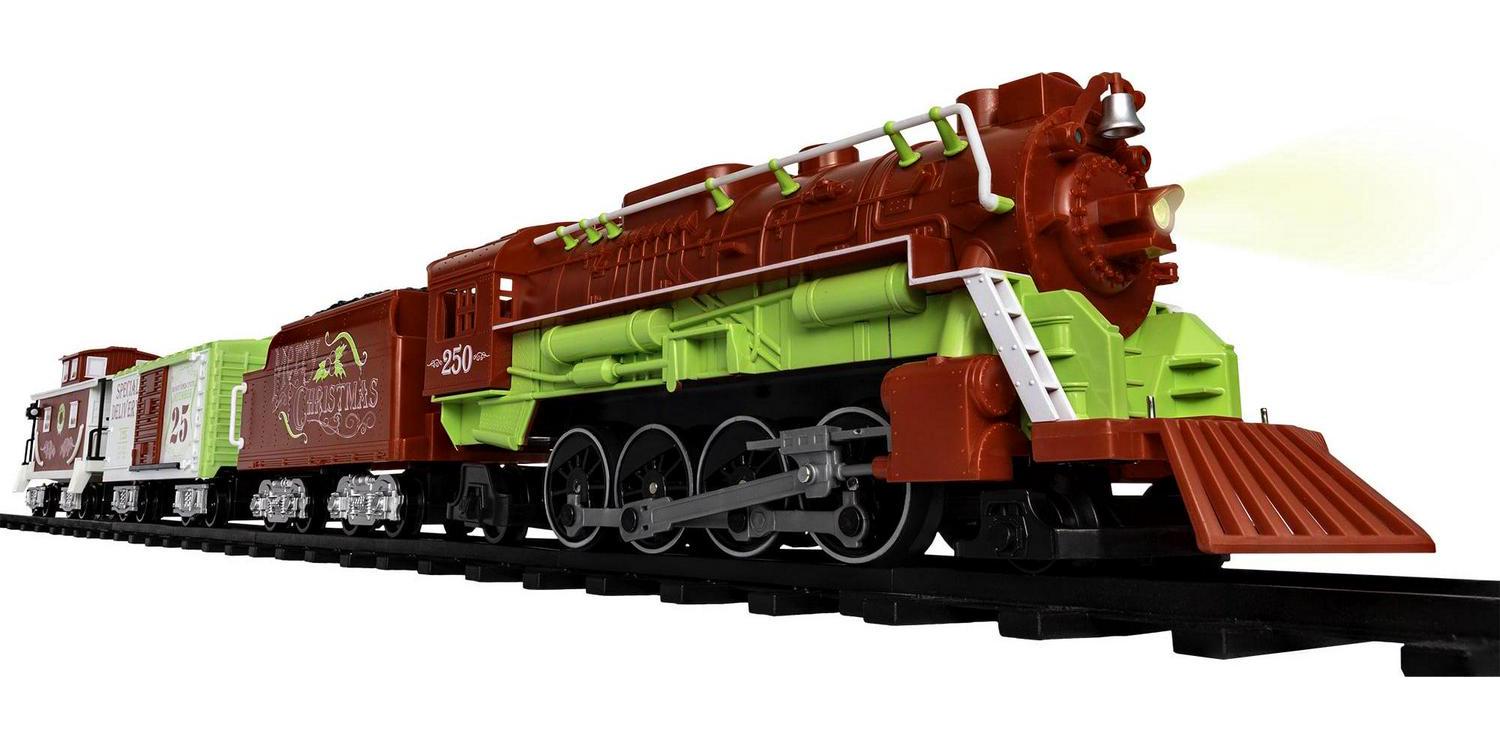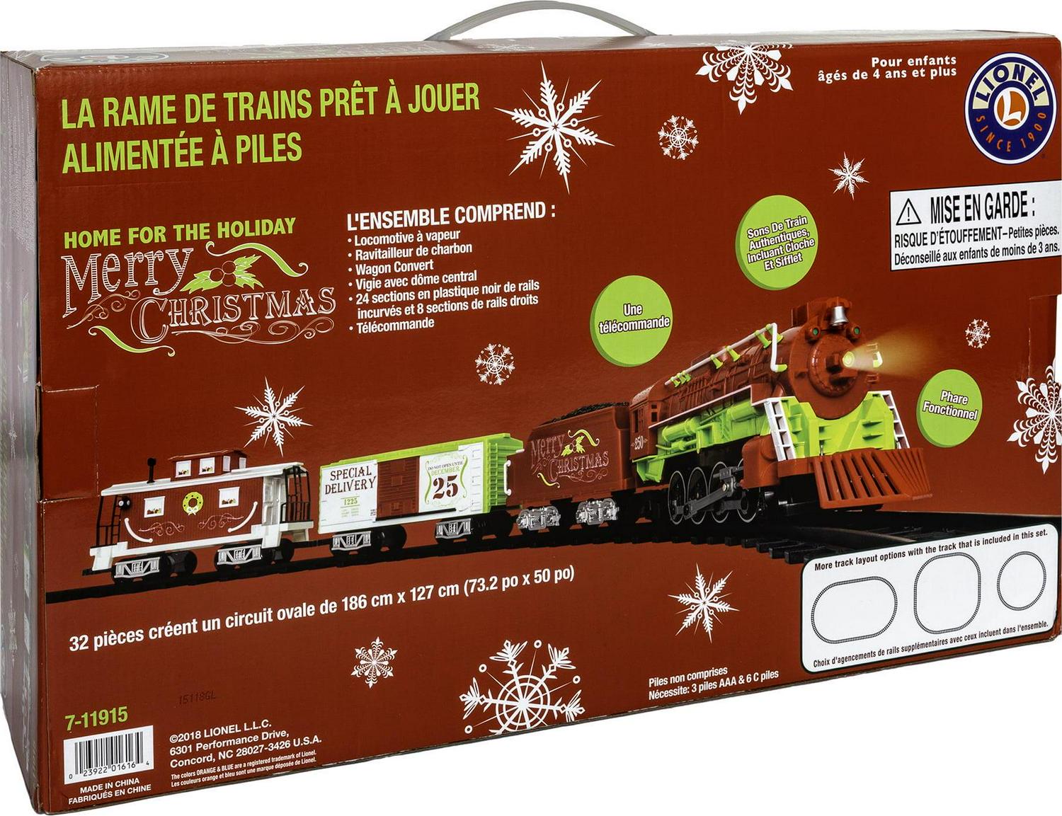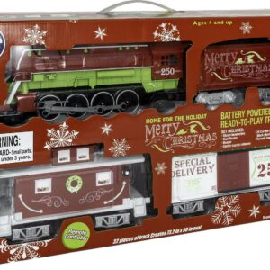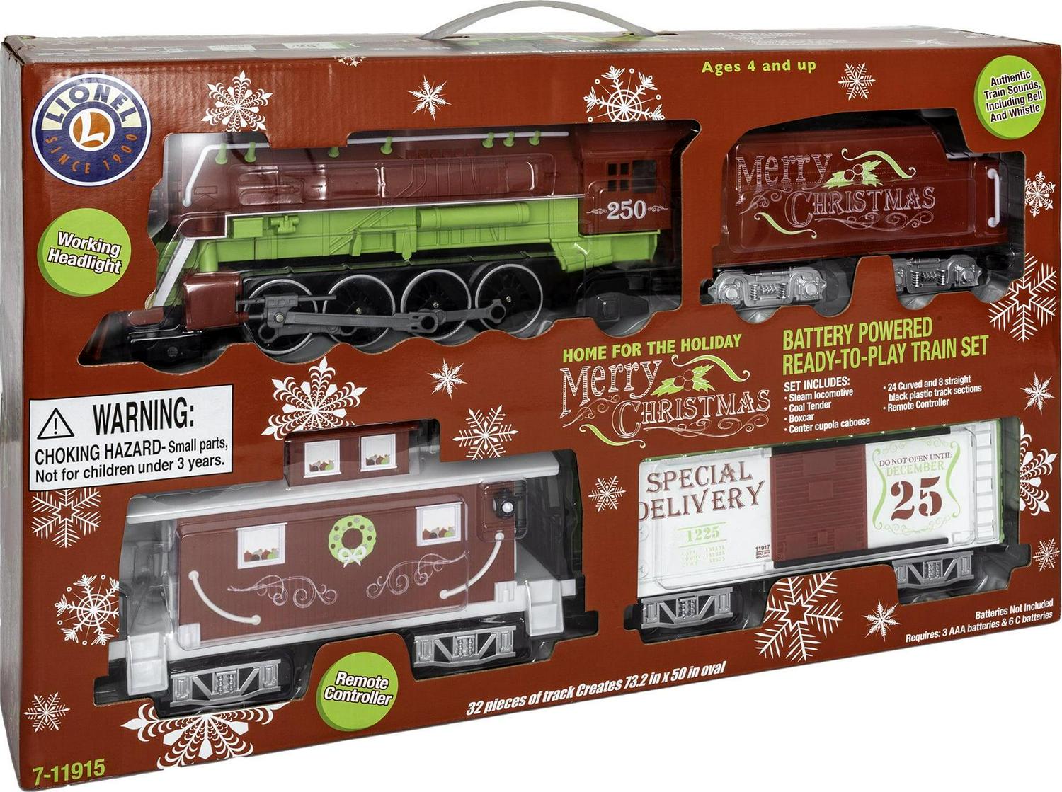 Bright and Merry Christmas wishes will fill your home as this train circles the tree. Add a unique and fun flare to your Christmas this year with our festive Home for the Holiday Ready-To-Play set! Perfectly designed for children ages four and up, Lionel Ready-to-Play battery powered sets are ready-to-run out of the box. These large scale trains operate in both forward and reverse directions while being powered by an easy-to-operate RC controller that runs on batteries (not included). These sets also feature an exclusive track system that allows you to create a circle, a rectangle or an oval layout.