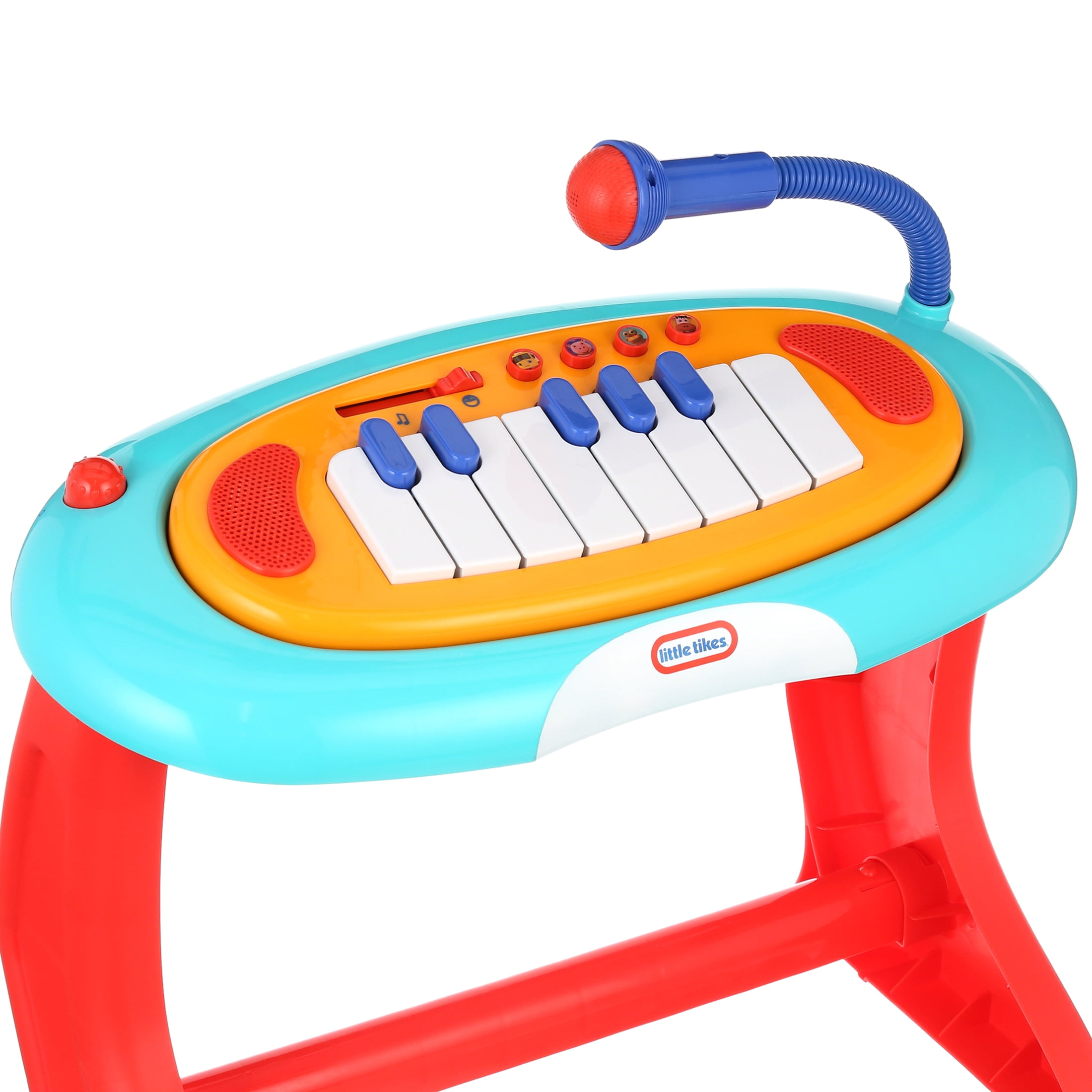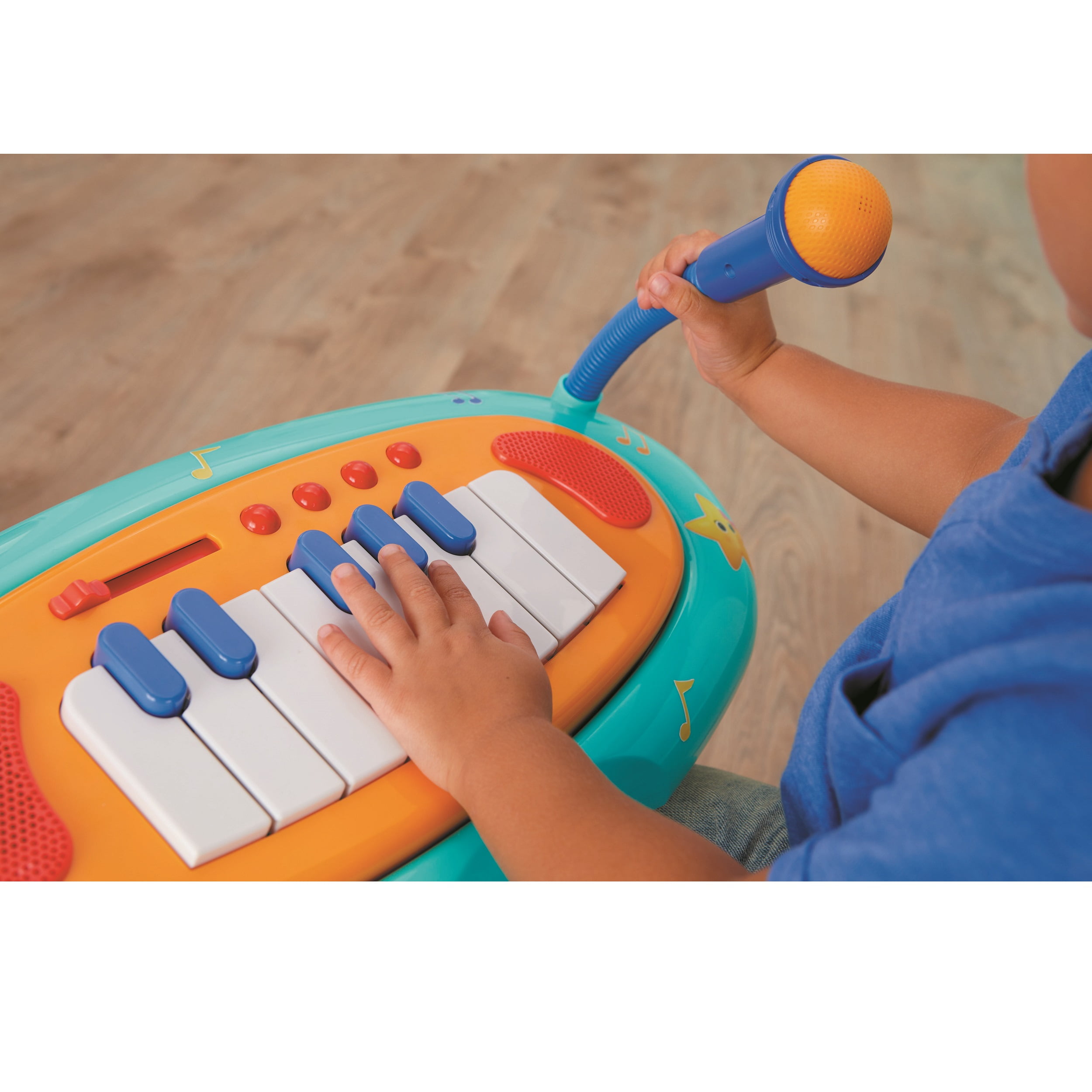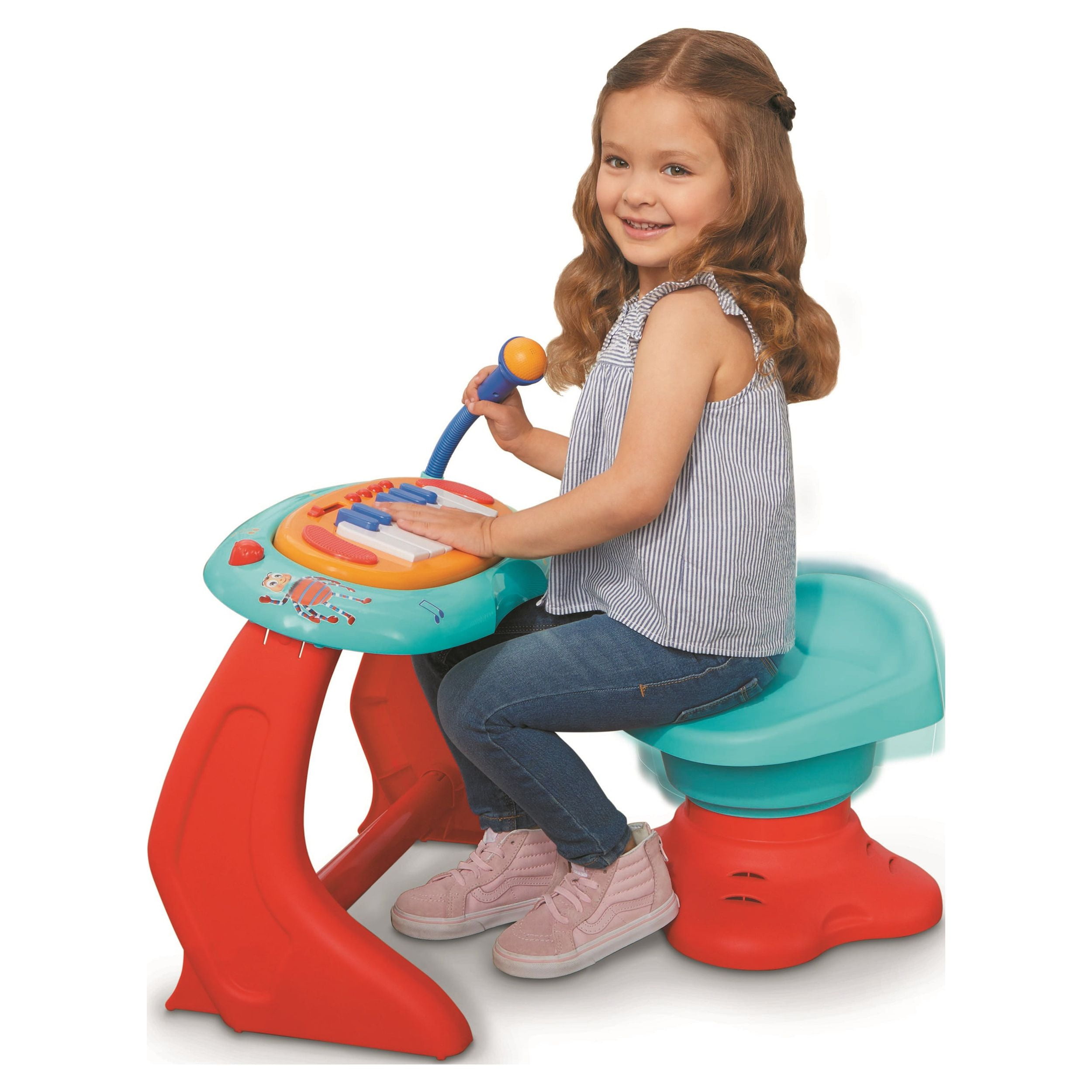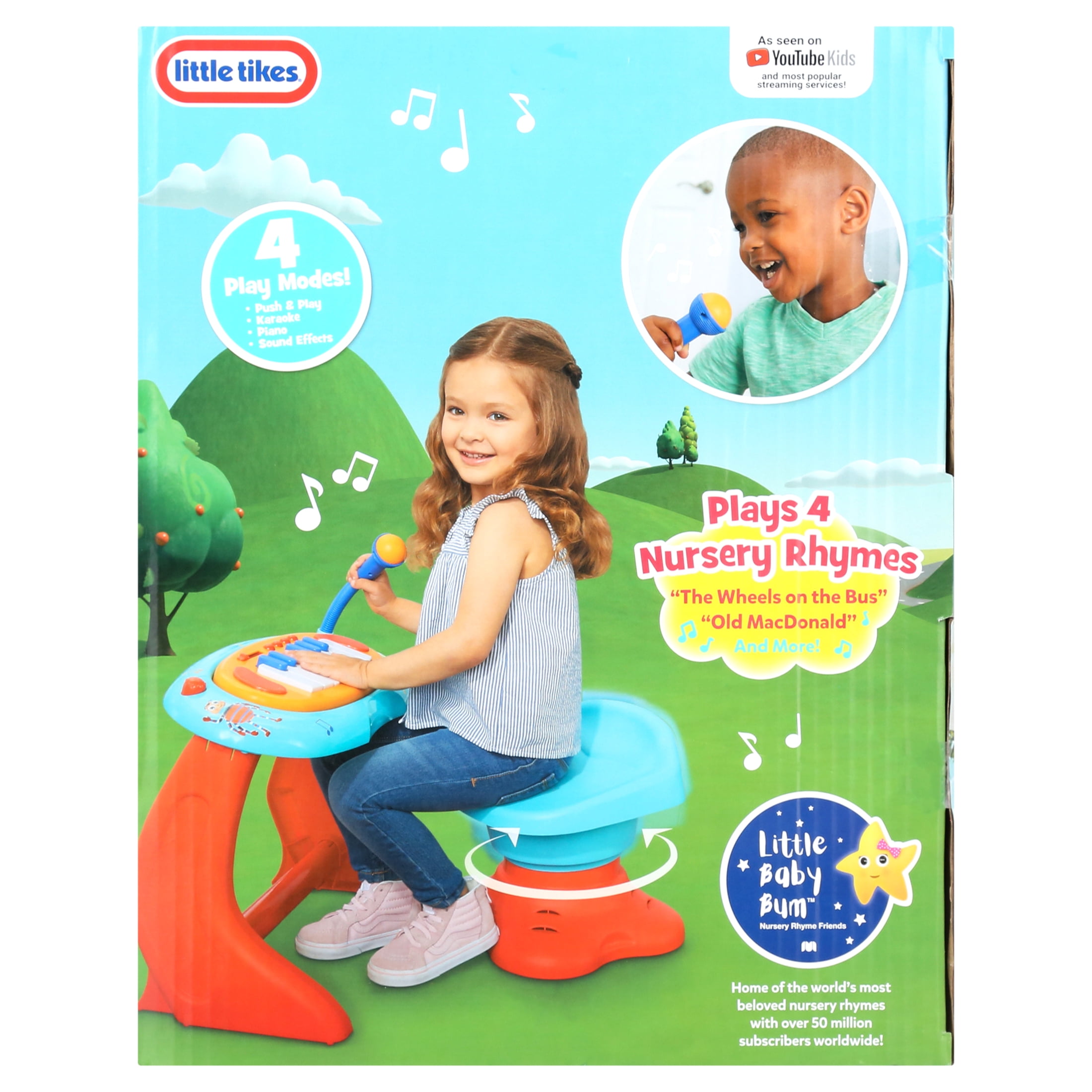 This rockin’ piano has a working microphone and 13 interactive keys so kids can play and sing along to their favorite Little Baby Bum songs Four unique play modes to choose from: push and play, karaoke, piano, and animal sounds! Kids can speed up, slow down, or add to the music by twisting and bouncing on the interactive seat Four songs include “Wheels on the Bus,” “Five Speckled Frogs,” “Old MacDonald,” and “Bingo” Maximum weight for chair: up to 110lbs. Requires 6 AA alkaline batteries (not included ) Assembly Required