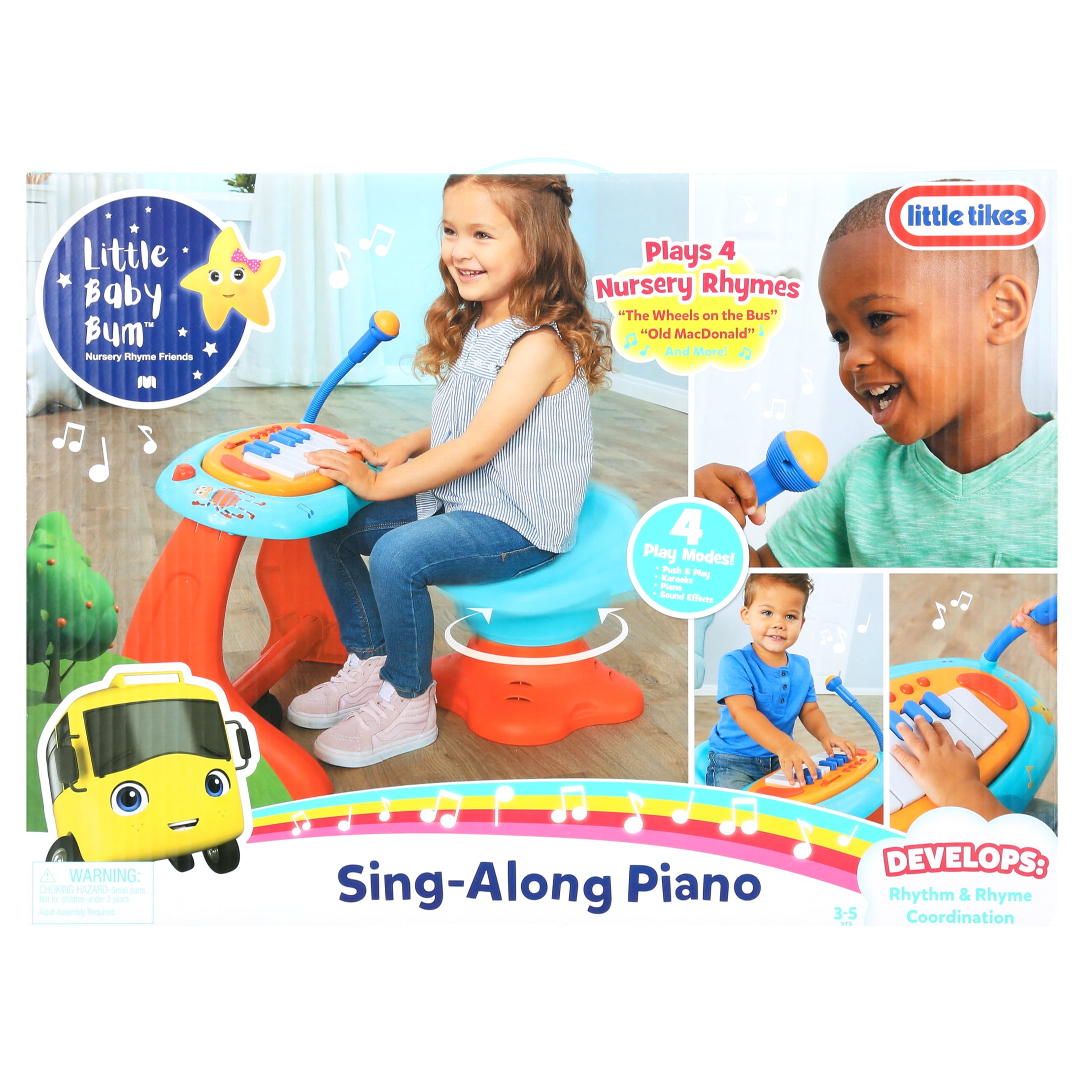 Kids can sing, dance, and rock out with the Little Baby Bum Sing-Along Piano. The Sing-Along Piano plays all of kids favorite Little Baby Bum nursery rhymes, and they can play along with the interactive piano and real working microphone! There are four unique play modes for kids to choose from! Kids can even speed up, slow down, or add to the music by bouncing on the interactive seat. Little Baby Bum is the home of the worlds most beloved nursery rhymes with over 30 million subscribers worldwide! Their videos have been watched over 23 billion times on YouTube alone, are available in 11 different languages, and are enjoyed all over the world.