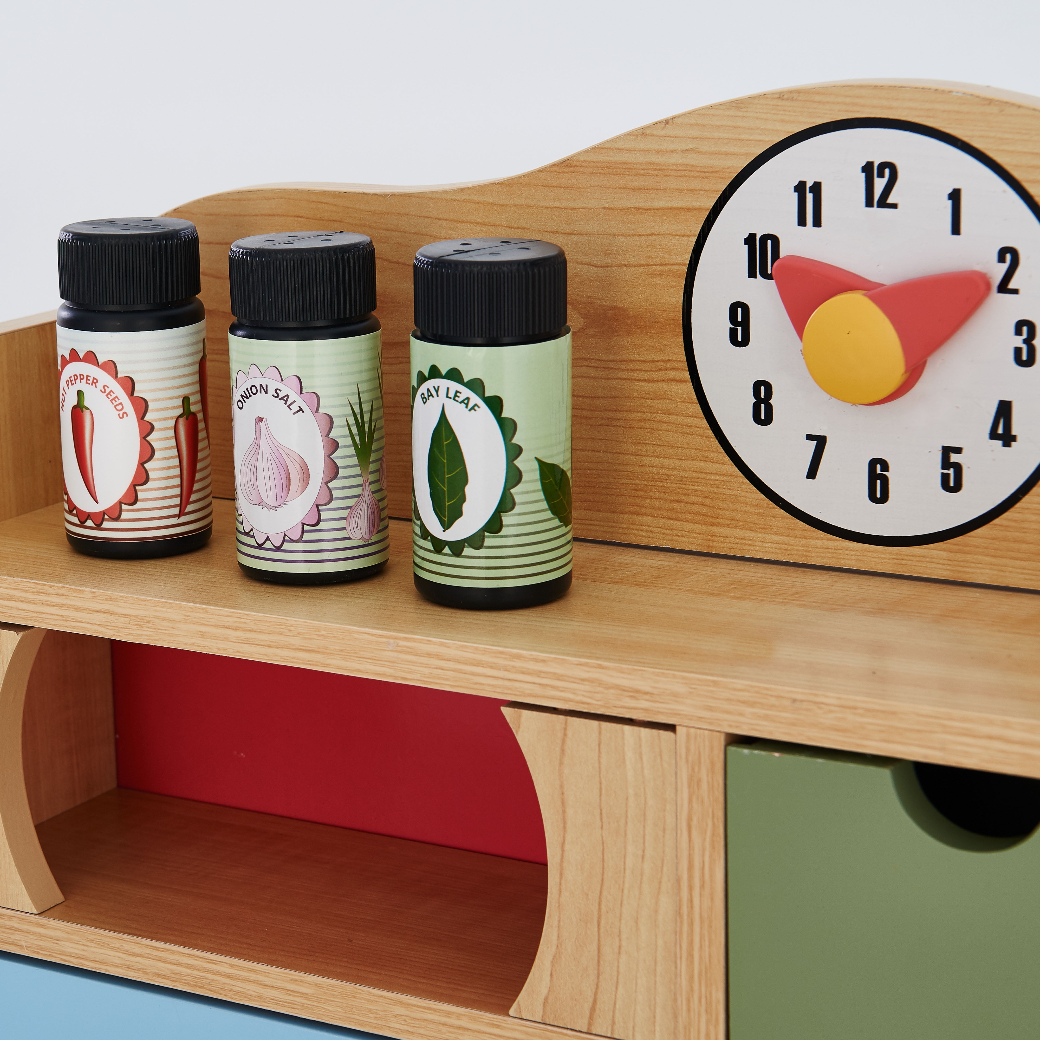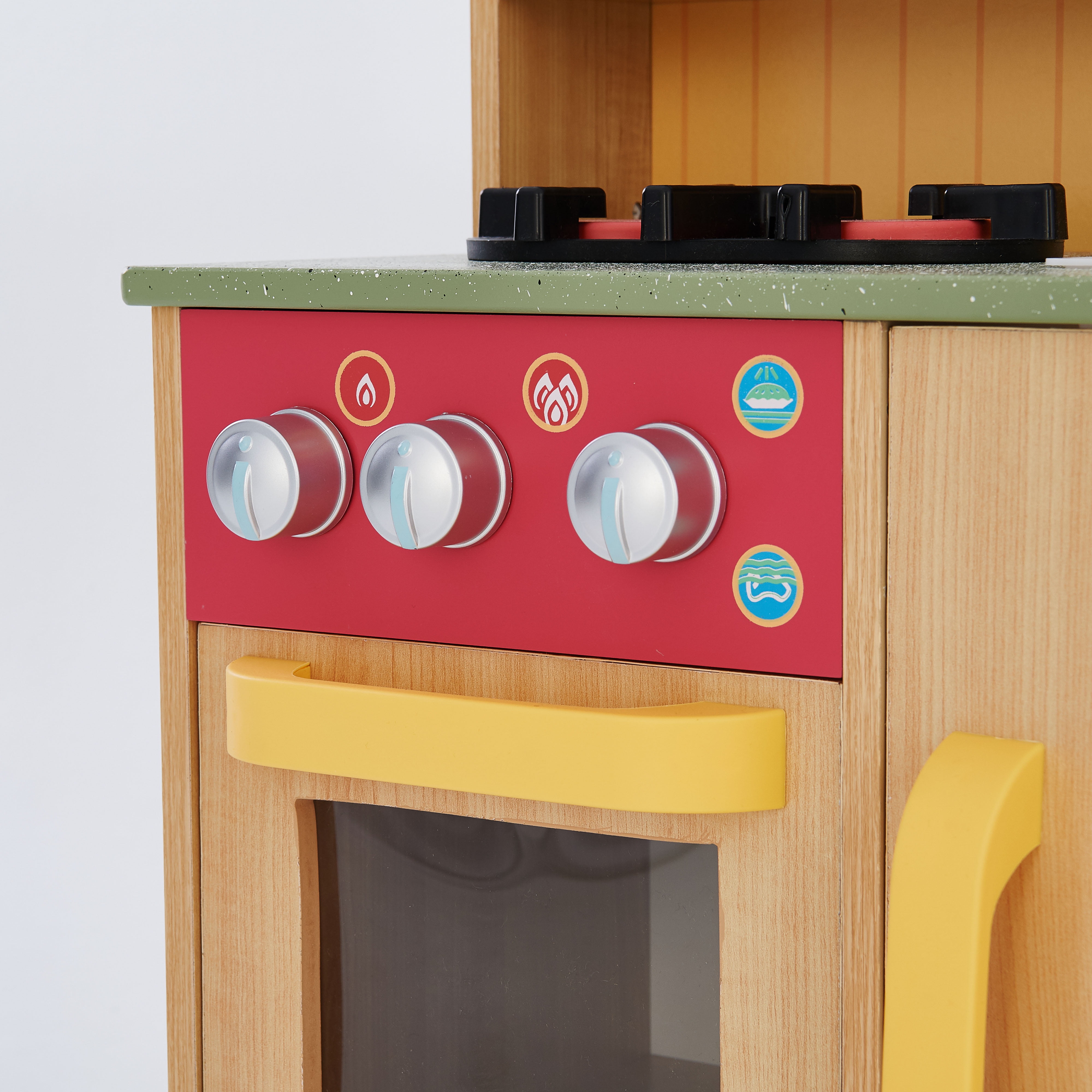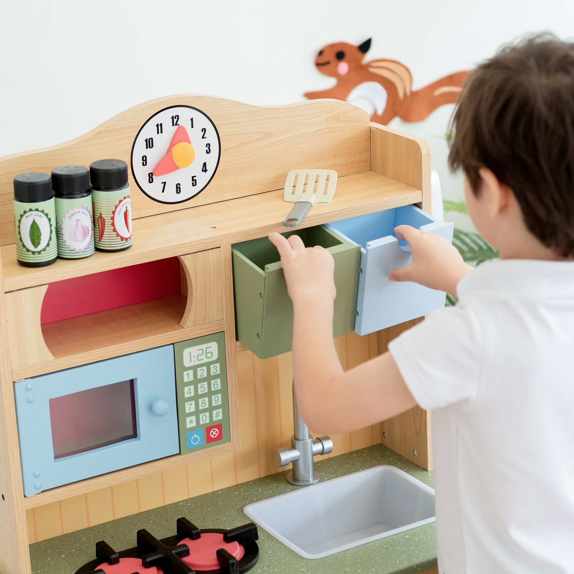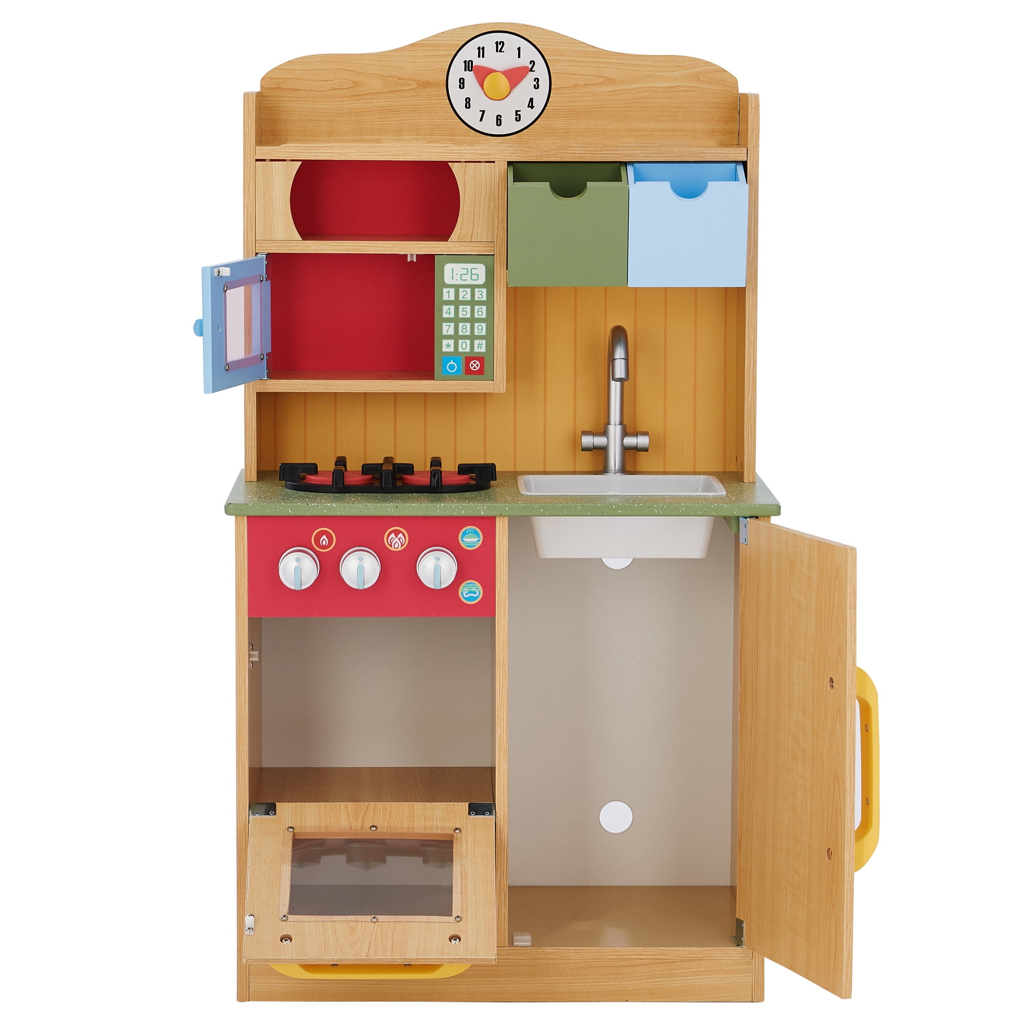 Natural wood finish with red, yellow, blue, green and chrome accents With a removable sink and an oven with knobs that turn and make clicking sounds Half-refrigerator below the sink, and a handy microwave above the oven Includes a spatula, three play seasonings, and a cordless toy phone Dimensions: 21.5″ L x 11.63″ W x 35.5″ H