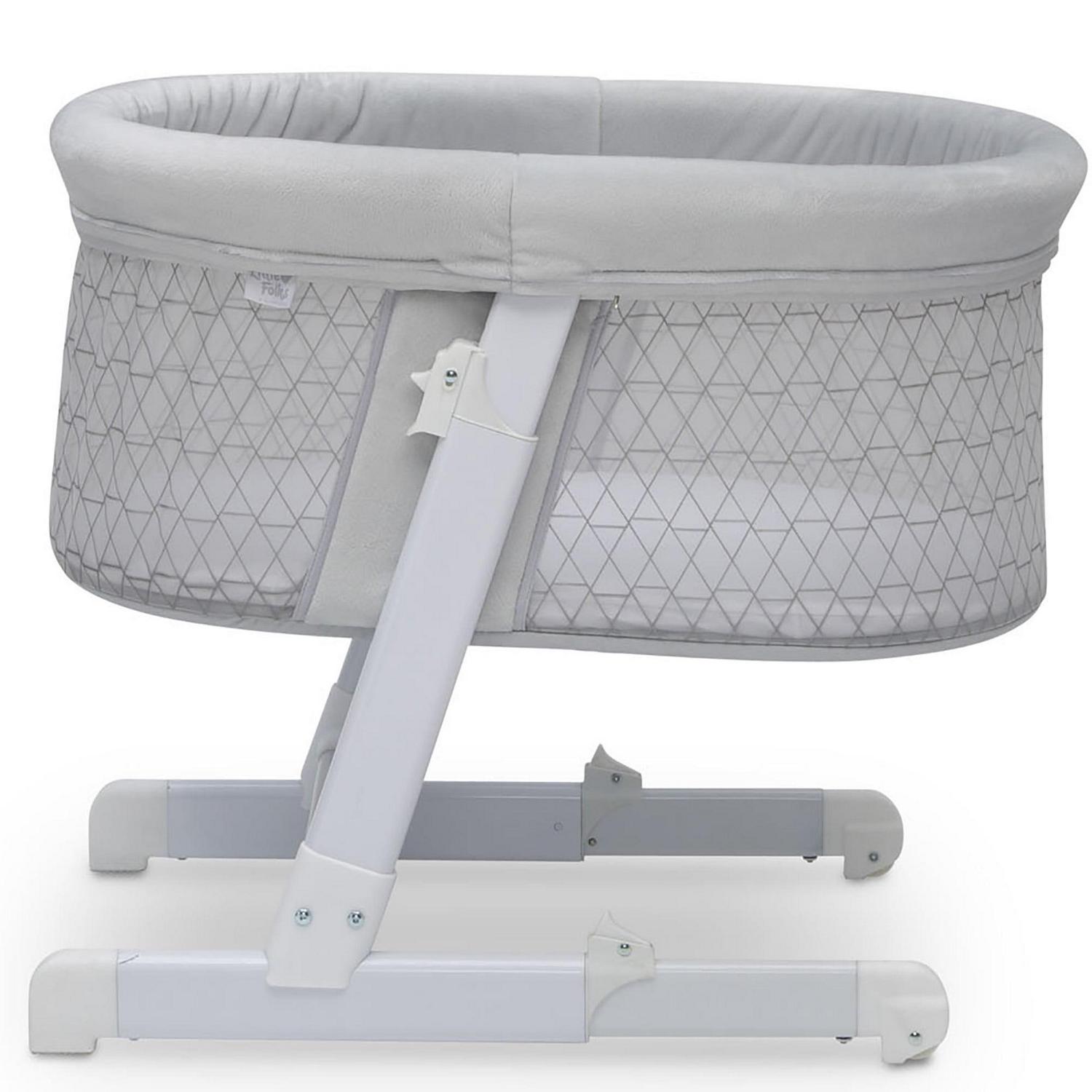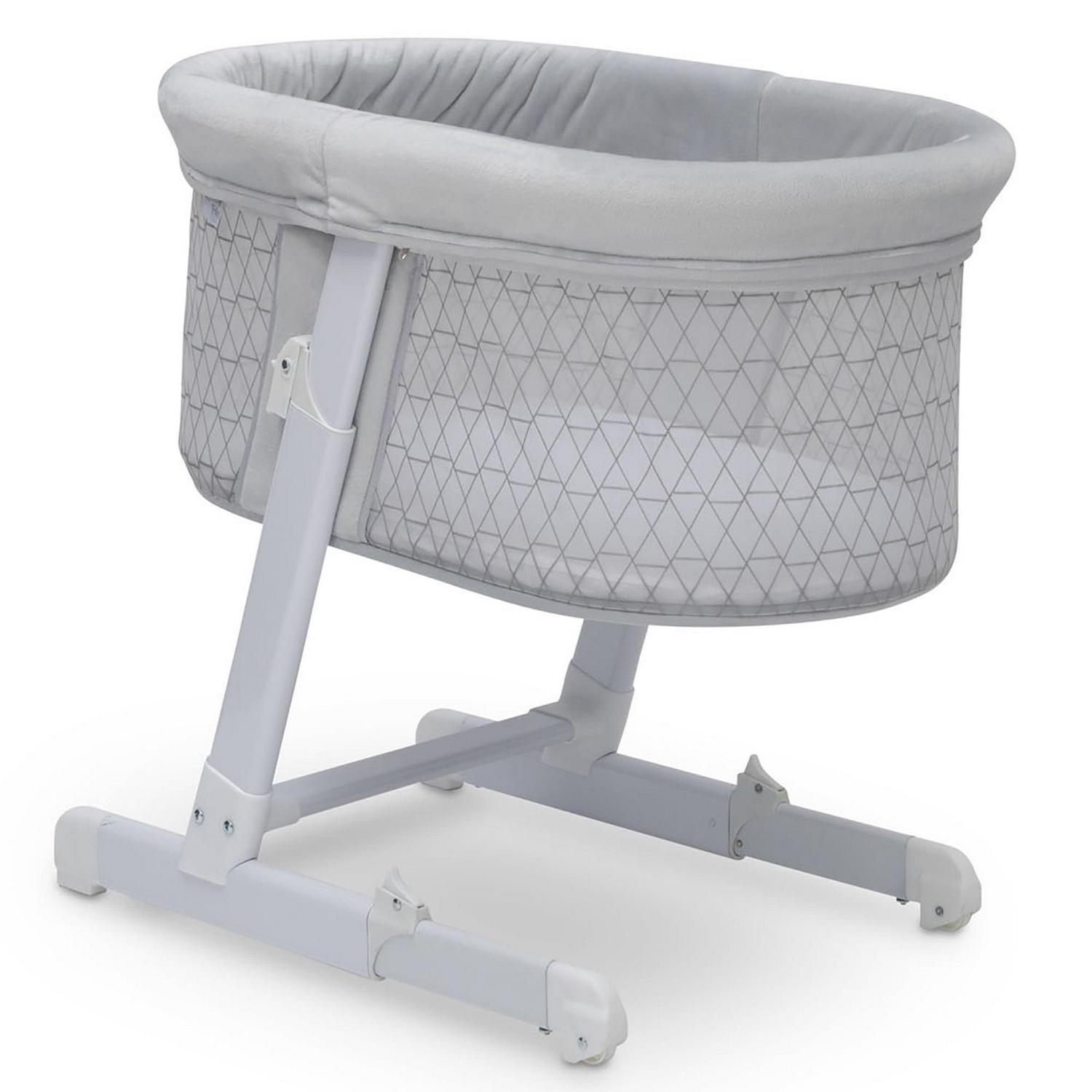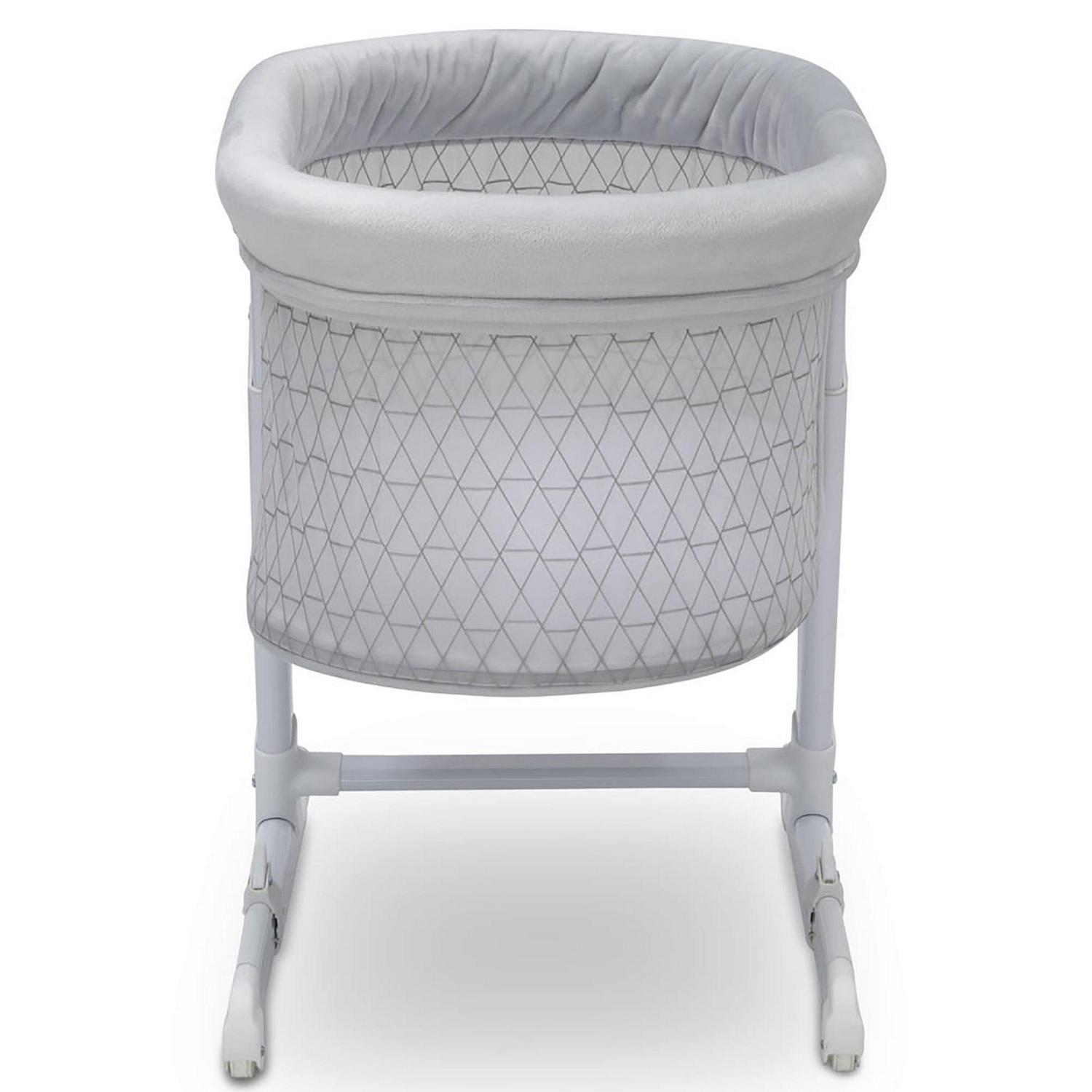 Keep your newborn nearby in the Little Folks Oval Bedside Sleeper Bassinet by Delta Children. As safe as it is stylish, this newborn bassinet features a sleek geometric pattern and makes it extremely easy and safe to room share with your little one from birth to five months. Its five height levels allow you to lower or raise the bassinet as needed. Raise it to one of the higher levels, and keep it near your bed so you can tend to your newborn at night. Lower it while seated so your baby can see you clearly. Slightly tilt the bassinet to engage the wheels that allow you to easily move it from room to room. The included mattress pad offers a firm, comfortable surface to sleep on while mesh sides provide a clear view of baby and help air circulate. A must-have for new parents, the Oval Bedside Sleeper Bassinet helps makes the first few months with your baby stress-free by providing a safe room-sharing option for your family. The removable mattress cover is machine washable for easy cleanup.