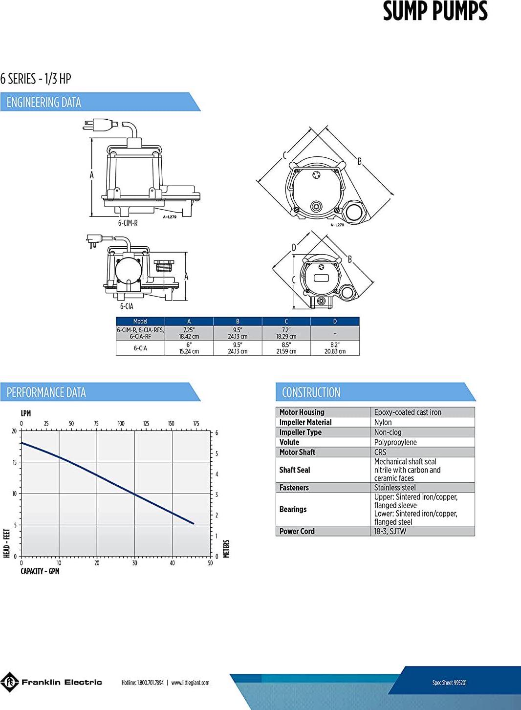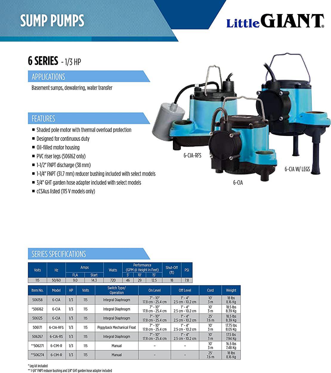 Choose a sump pump that delivers unparalleled performance whenever you need it — the Little Giant LG-506158 6 CIA 1/3-HP Submersible Sump Pump. Designed for continuous use, this sump pump features a 1/3-horsepower shaded pole motor with overload protection, an oil-filled, cast-iron motor housing for heat dissipation and lubrication, and a polycarbonate cover and polypropylene volute case. Don’t let your sump pump let you down when you need it most. Invest in quality equipment like the Little Giant 6 CIA 1/3 HP Submersible Sump Pump.