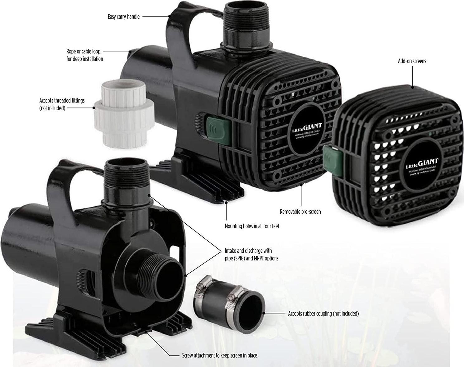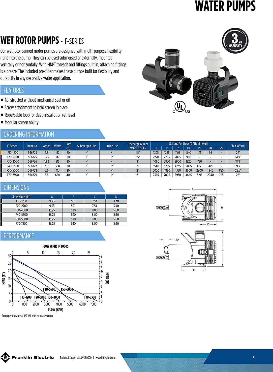 Little Giant F Series pumps are designed with multi-purpose flexibility right into the pump while their wet rotor technology makes them energy efficient. They can be used submersed or externally and can be mounted verticaly or horizontally. With MNPT threads and fittings built in, attaching fittings is a breeze. The included pre-filter makes these pumps built for flexibility and durability in any decorative water application.