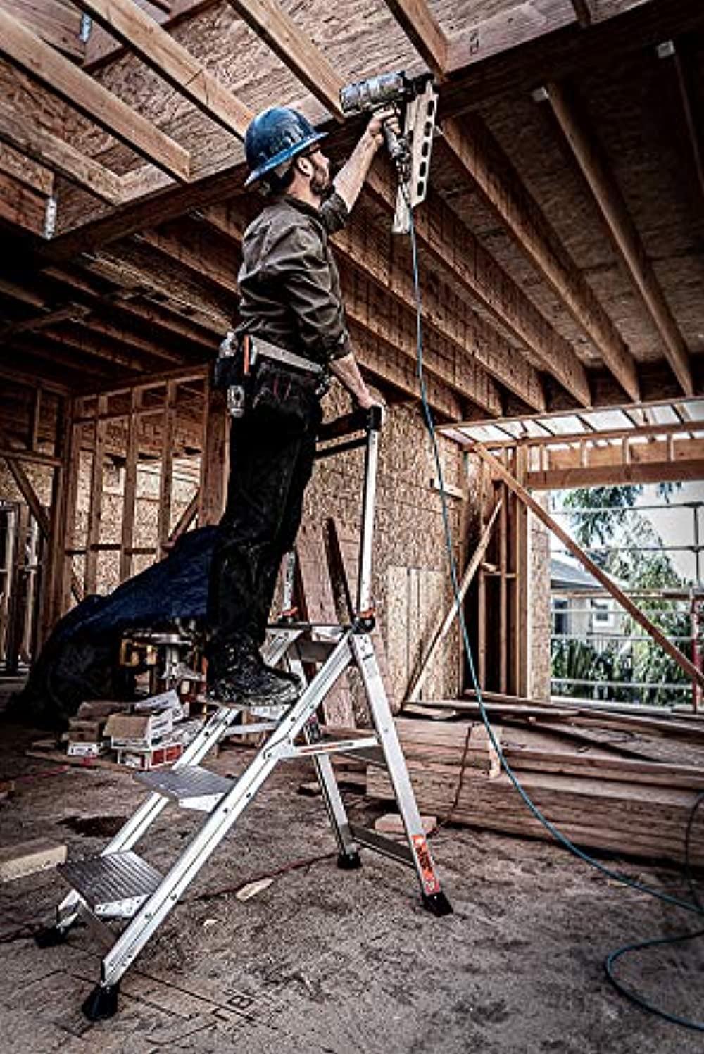 The new Little giant Jumbo Step is the ultimate combination of light weight, stability and strength. The Jumbo Step s 8 ½-inch-wide, slip-resistant treads and stair-like design provide unmatched comfort and stability. It is ideal for jobs that require both frequent climbing up and down, as well as those that require long periods of standing. The Jumbo Step s design makes working at heights as comfortable as standing on the ground. The patent-pending Jumbo Step also comes with a safety bar and convenient tool tray. It operates easily, and is simple to store with its slim 4 ½-inch storage depth. Its large nonslip footpads provide great traction over almost any surface. The Jumbo Step will stand up to professional and industrial use and is rated to hold up to 300 lbs. The Jumbo Step is available in 2, 3, and 4-step models.