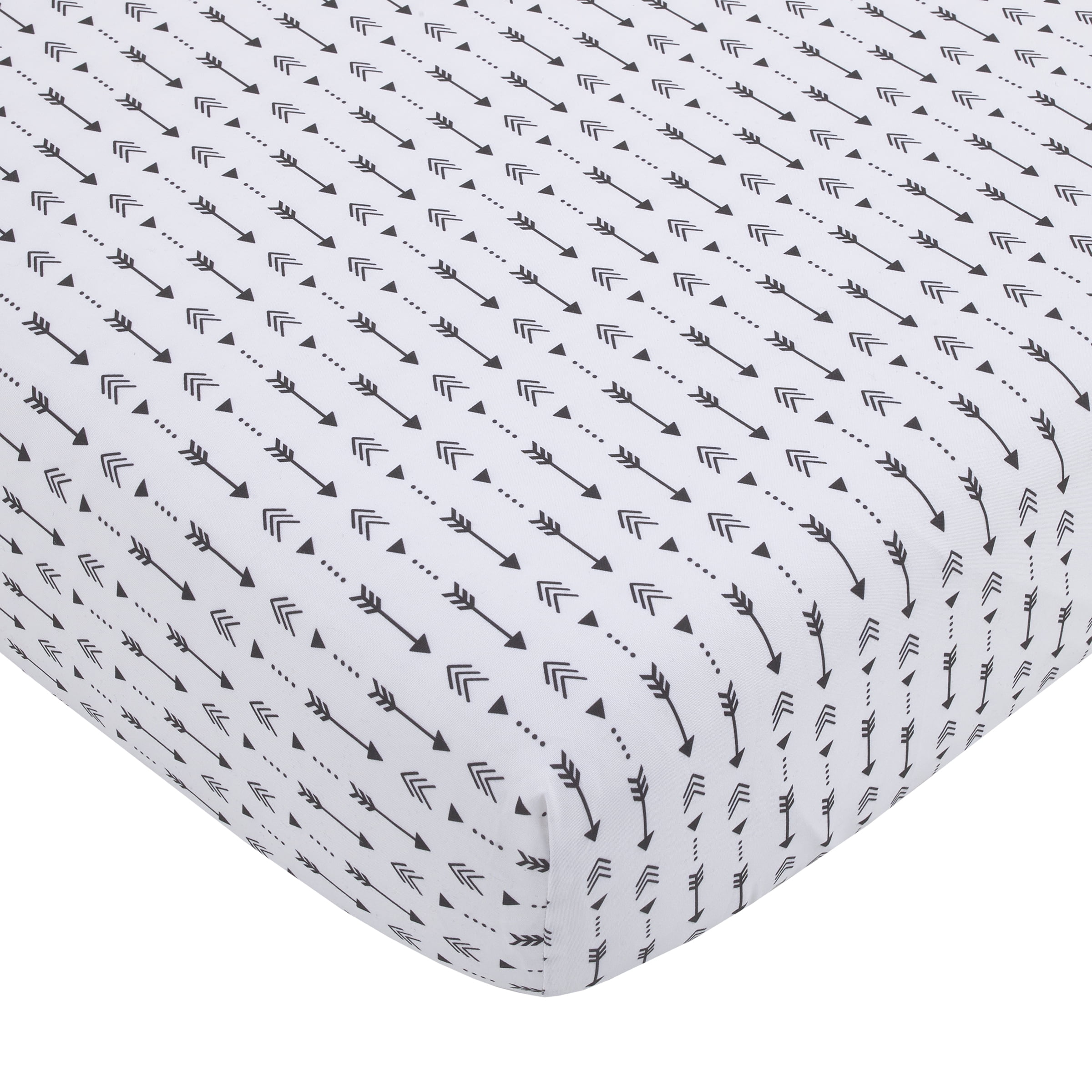 The Little Love Bedding by NoJo Little Man Cave 3 Piece Crib Bedding Set will make a cozy woodsy retreat for your little one’s nursery! This rustic set includes a comforter, fitted crib sheet and crib skirt. The 33″ x 42″ comforter features a fox and bear under a starry night sky, with a patchwork of moose, buffalo check and rustic arrows that say “Little Man Cave”. Designed in shades of grey, red, black, and ivory. The 28″ x 52″ fitted crib sheet is featured in ivory with an all-over arrow pattern in black. Includes full elastic edges for a safe and snug fit. Complete the look of your nursery with this solid dark grey crib skirt that has a 10″ drop length. Machine washable for easy care!